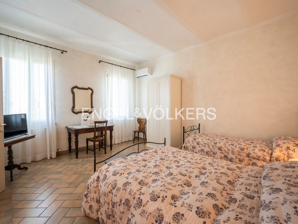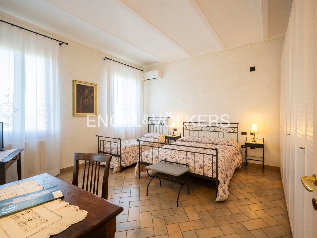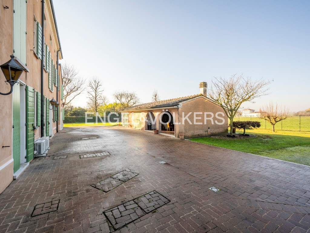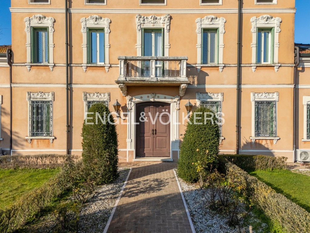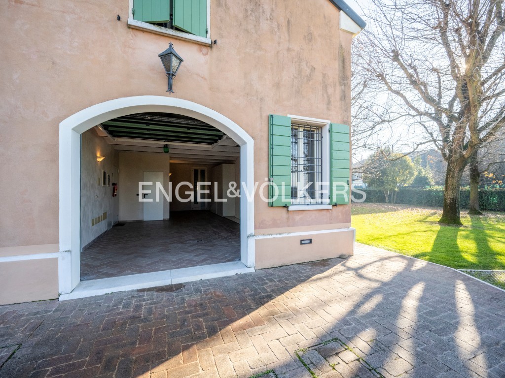 A residência oferece cerca de 400 m² de área habitável, inserida num parque privado. O rés-do-chão inclui salão, cozinha, escritório e casa de banho para convidados. O primeiro andar dispõe de três quartos e duas casas de banho. Uma unidade separada no sótão complementa a casa principal. A propriedade inclui ainda um apartamento independente de dois pisos, uma grande garagem com lavandaria e mezzanine, bem como uma tradicional barchessa com pátio e duas garagens adicionais. O jardim oferece mais quatro lugares de estacionamento exteriores.