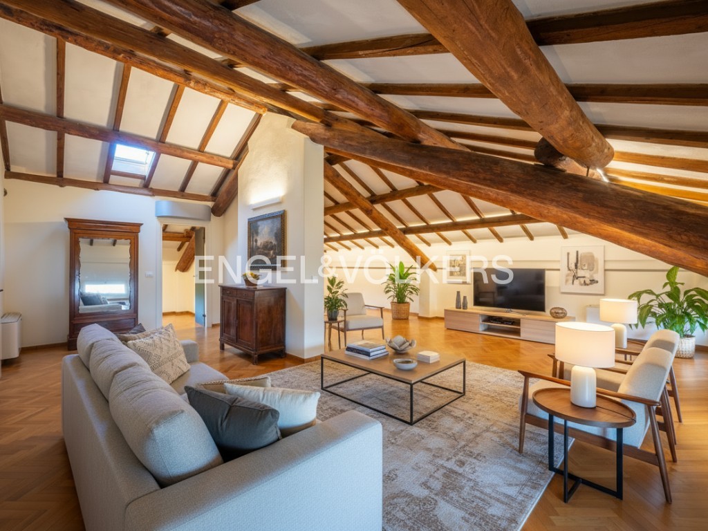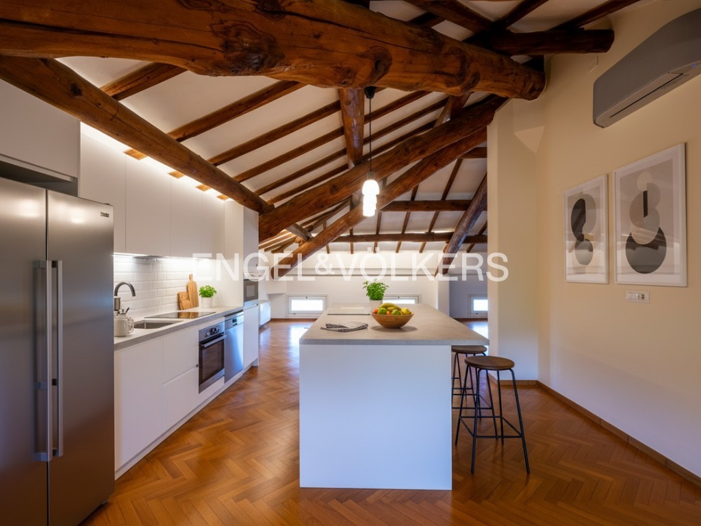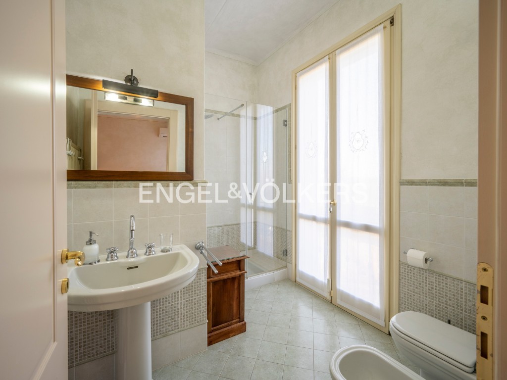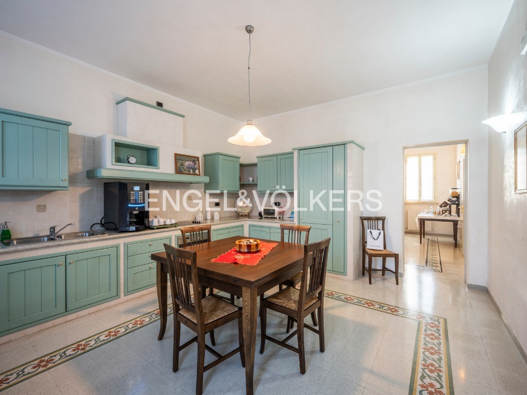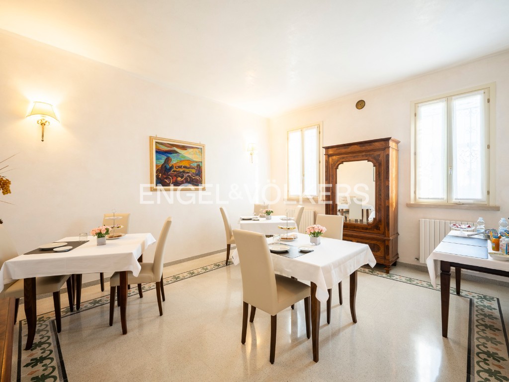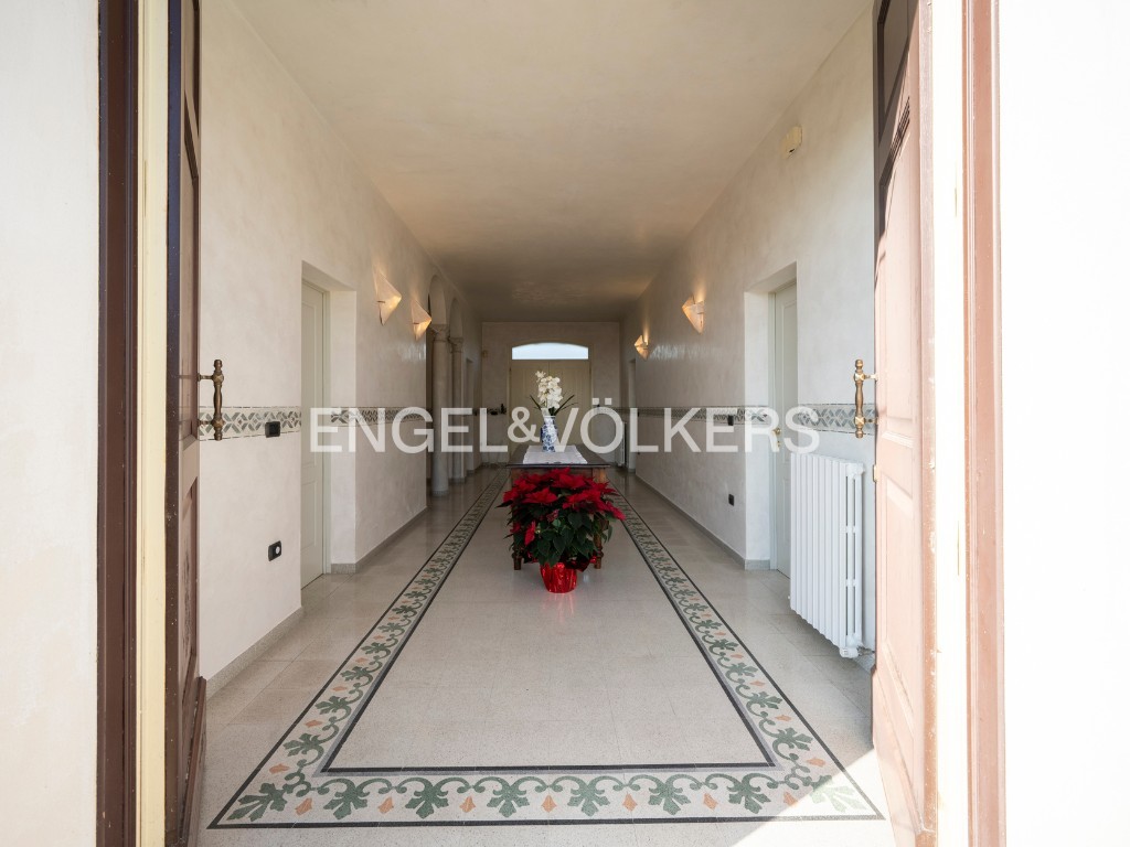 A residência oferece cerca de 400 m² de área habitável, inserida num parque privado. O rés-do-chão inclui salão, cozinha, escritório e casa de banho para convidados. O primeiro andar dispõe de três quartos e duas casas de banho. Uma unidade separada no sótão complementa a casa principal. A propriedade inclui ainda um apartamento independente de dois pisos, uma grande garagem com lavandaria e mezzanine, bem como uma tradicional barchessa com pátio e duas garagens adicionais. O jardim oferece mais quatro lugares de estacionamento exteriores.