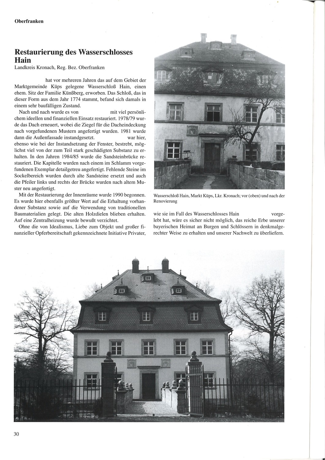 O local foi mencionado pela primeira vez em documentos em 1330, ligado à residência de Jakob von Redwitz em Hain. Em 1395, a propriedade passou para Ulrich I. von Künsberg-Wernstein. Em 1668 foi construída a capela do castelo, e em 1711 o primeiro castelo, seguido pela atual construção barroca em 1774. No final do século XVIII, Hain era composto por várias propriedades senhoriais sob diferentes casas nobres.