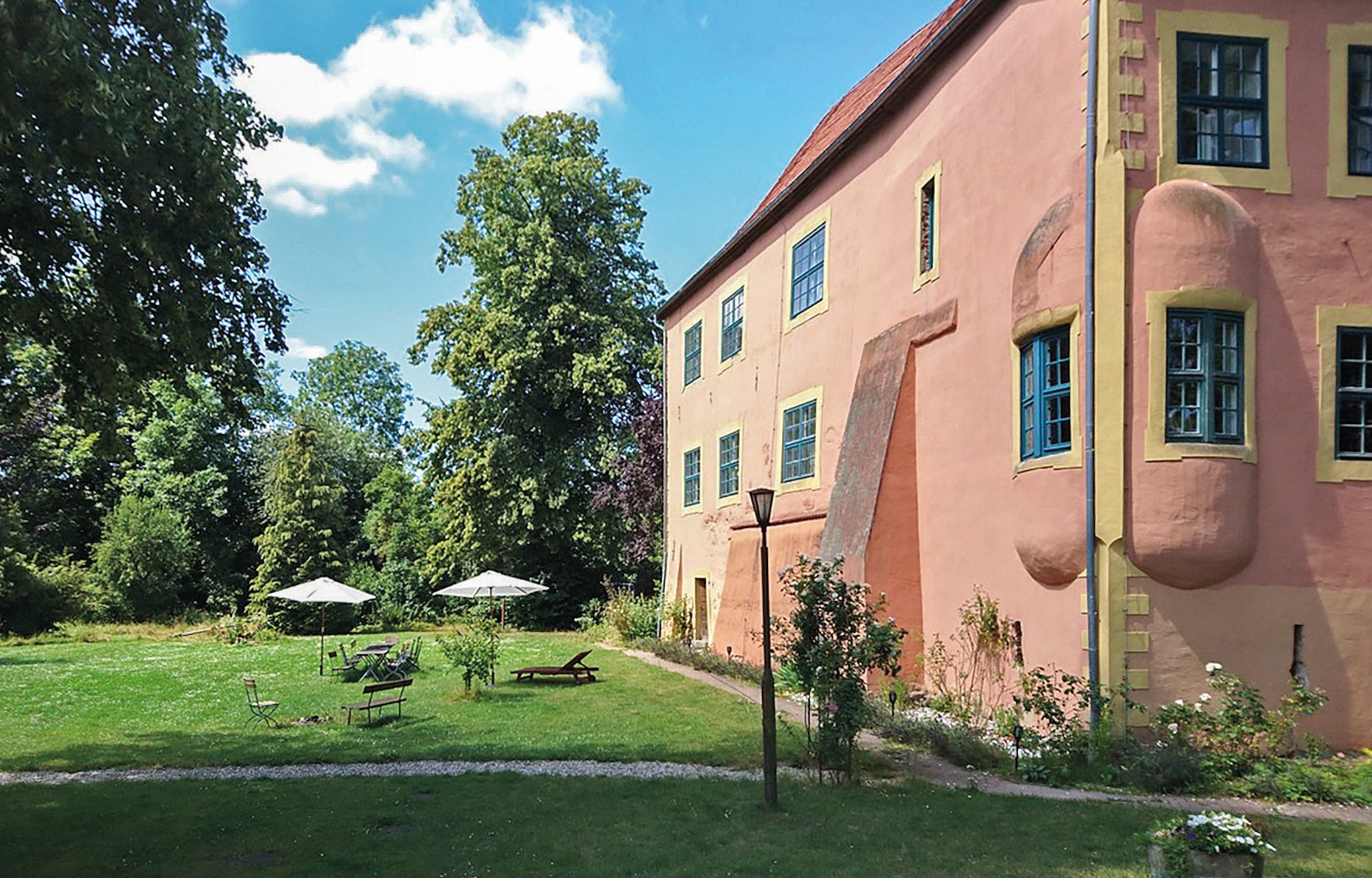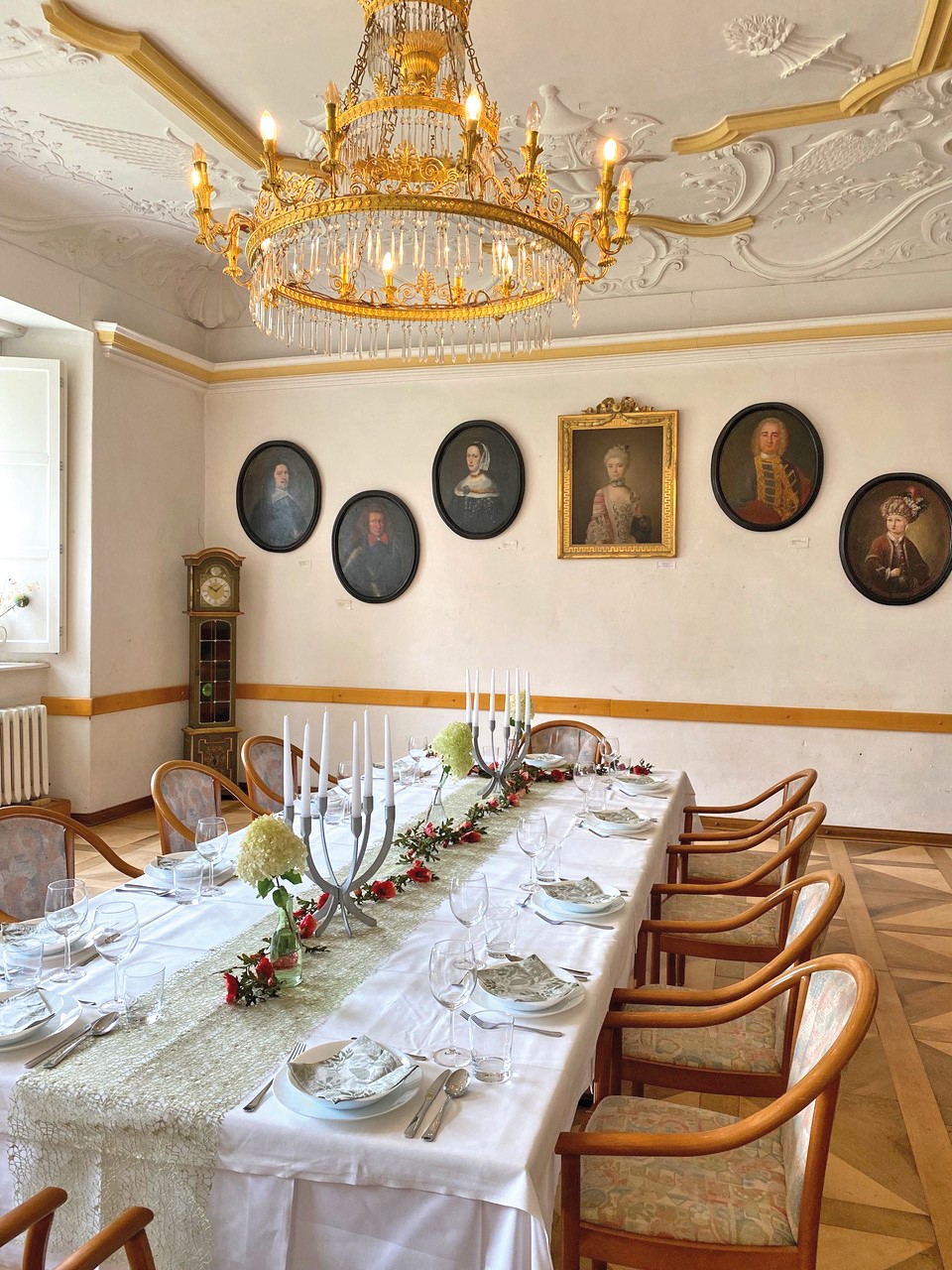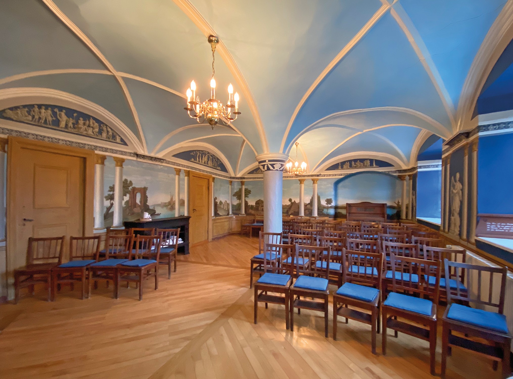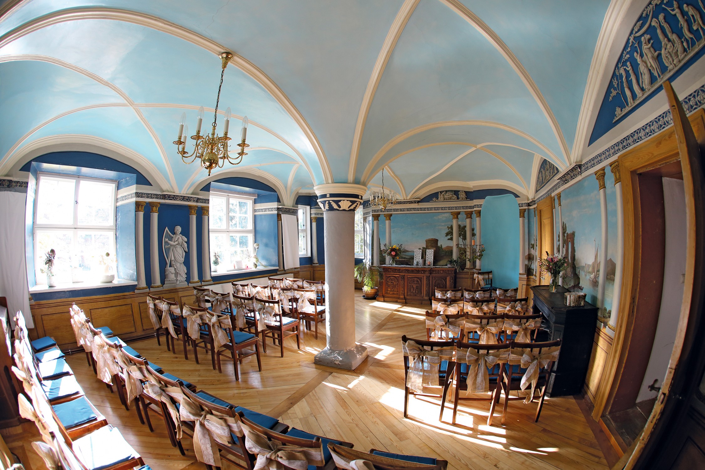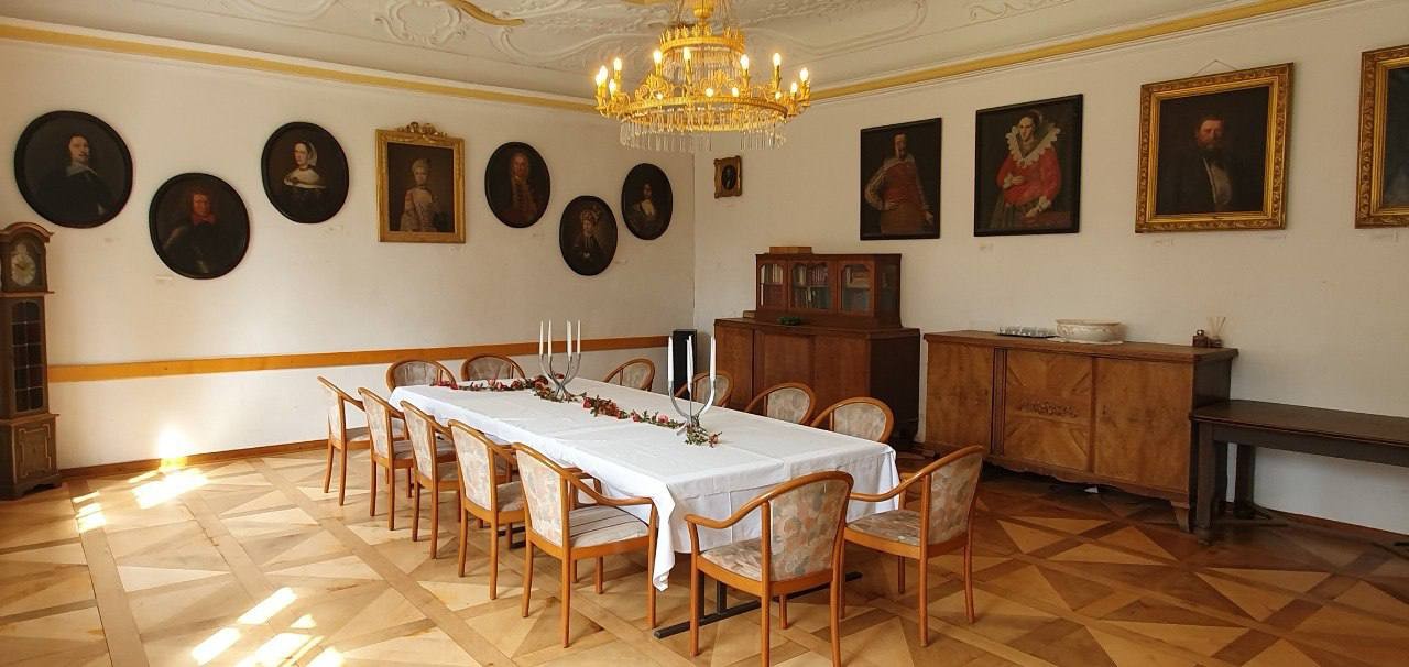 O edifício de tijolo com três pisos, assente sobre uma base de pedra de campo, alberga no rés do chão um salão histórico com teto em estuque do Renascimento italiano e pavimento em parquet de carvalho, uma capela com pinturas murais de paisagens arcádicas do século XVIII, uma sala dos cavaleiros, vários salões e uma cozinha profissional.