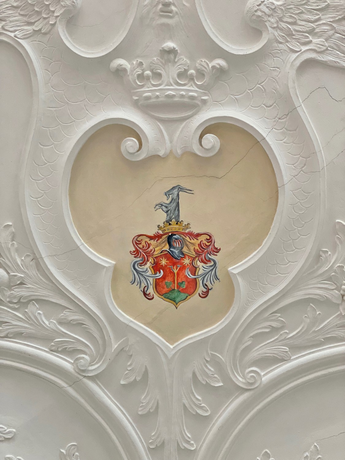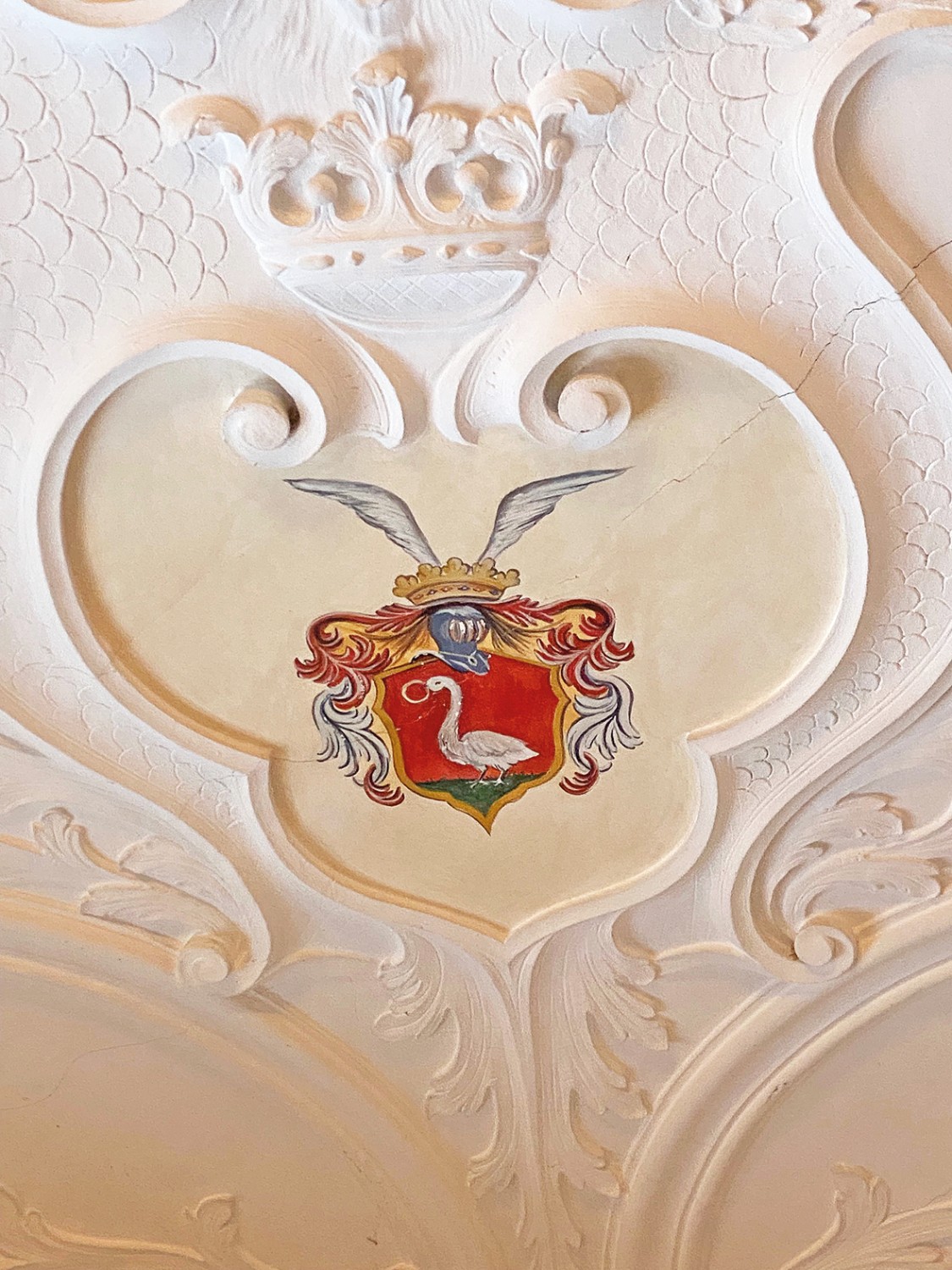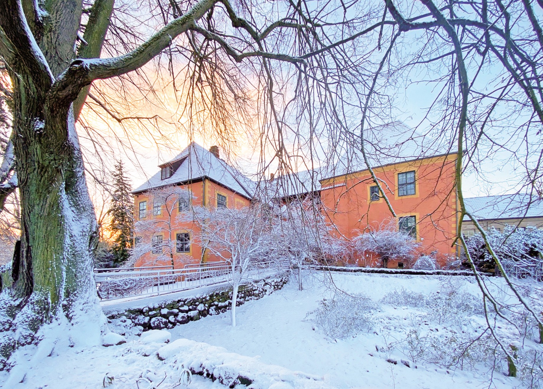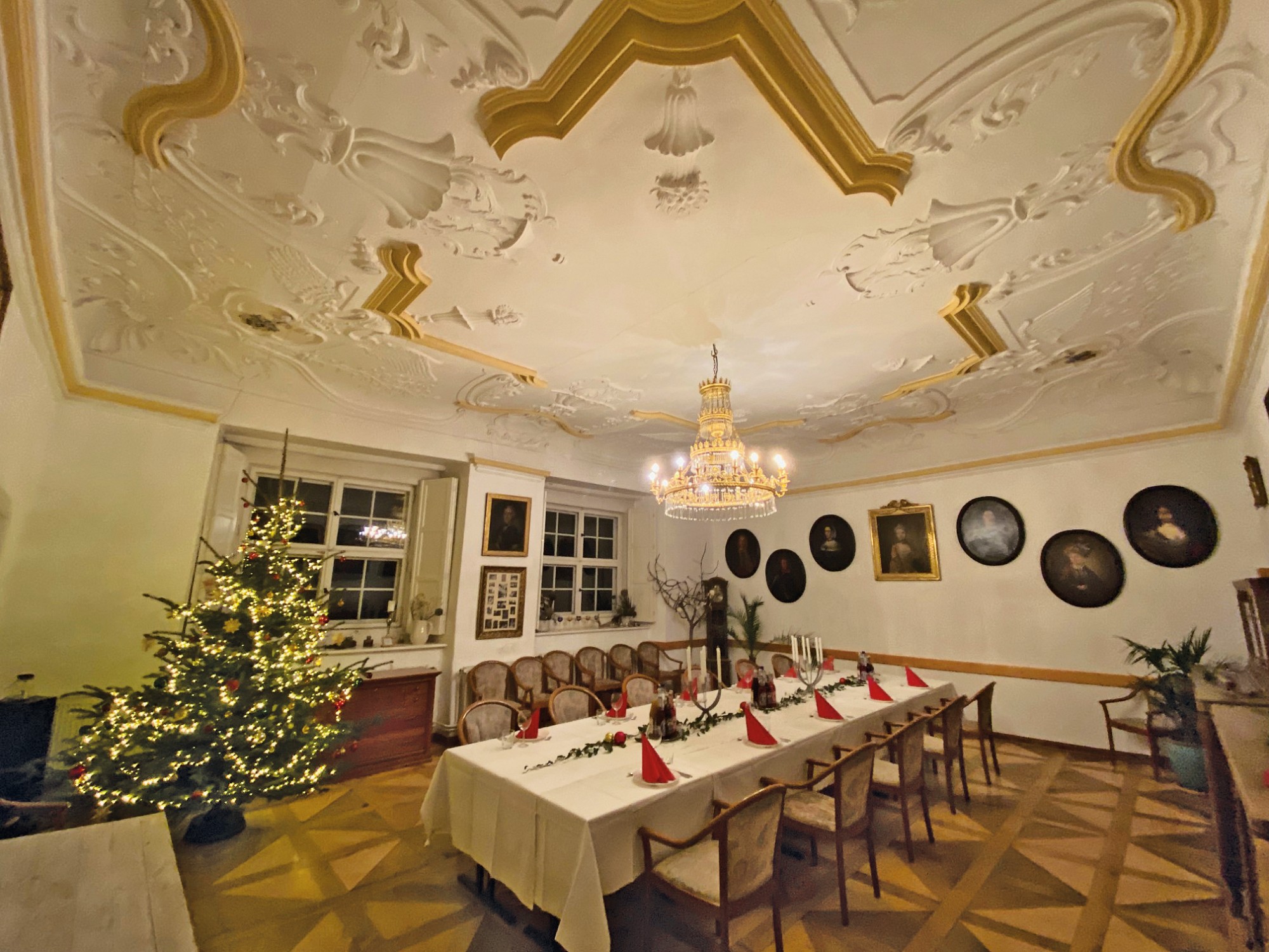 O edifício de tijolo com três pisos, assente sobre uma base de pedra de campo, alberga no rés do chão um salão histórico com teto em estuque do Renascimento italiano e pavimento em parquet de carvalho, uma capela com pinturas murais de paisagens arcádicas do século XVIII, uma sala dos cavaleiros, vários salões e uma cozinha profissional.