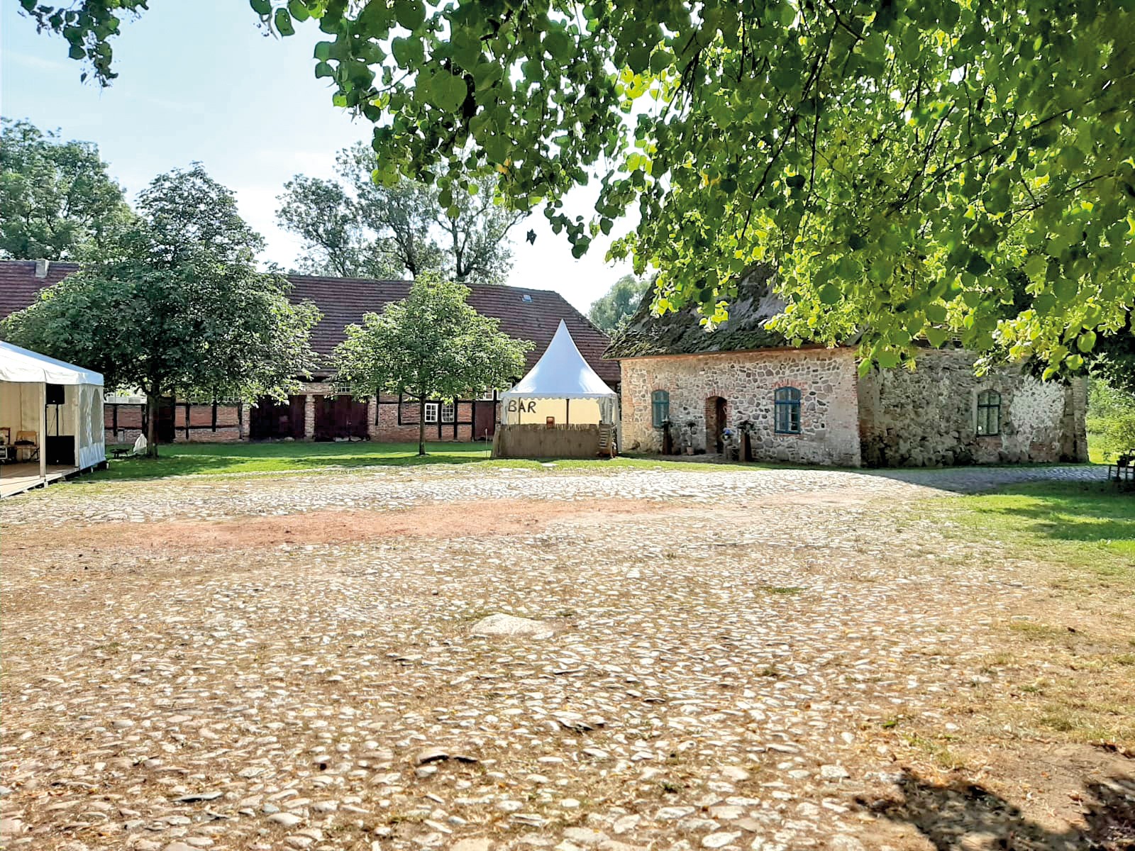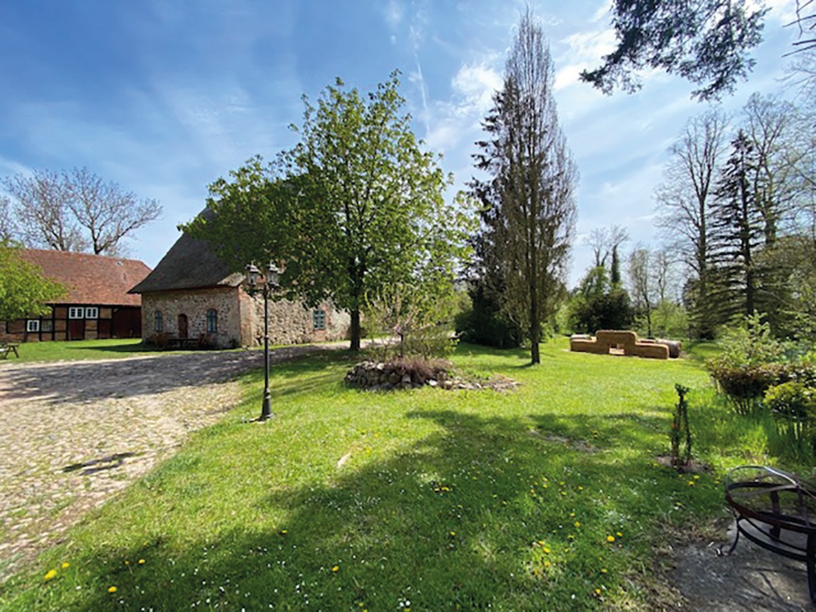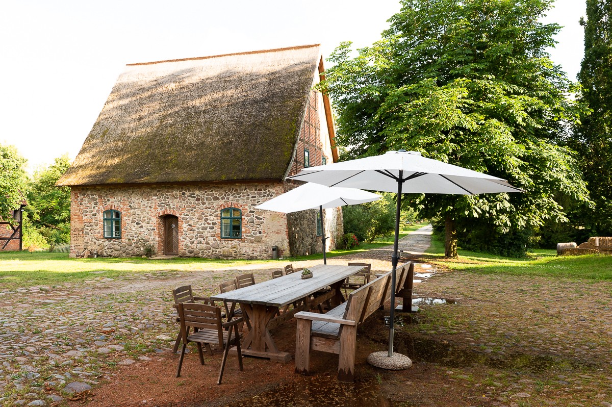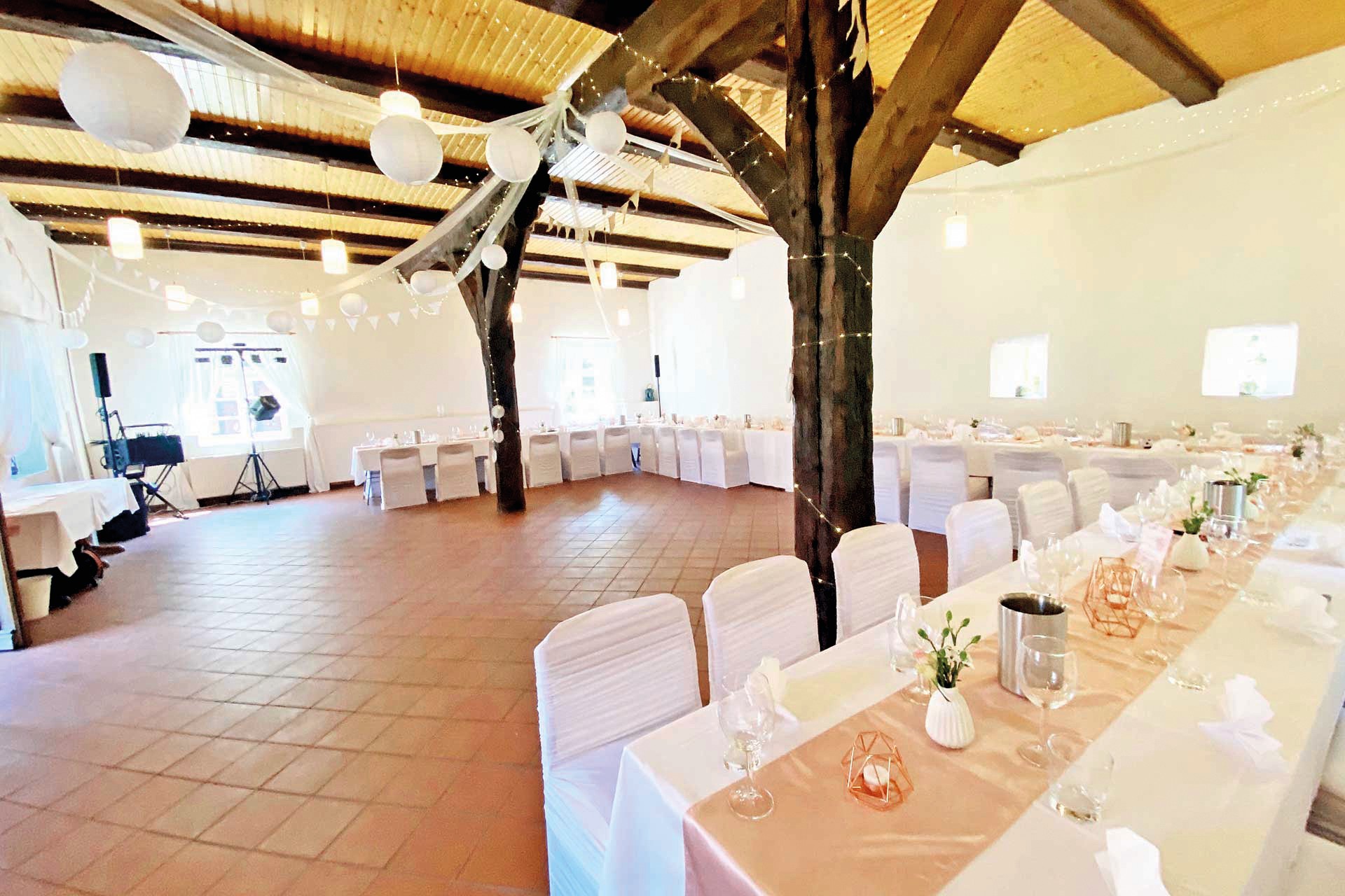 O celeiro de grãos com cobertura de colmo (aprox. 120 m² no rés do chão, sótão com possibilidade de conversão) é utilizado como espaço para eventos.