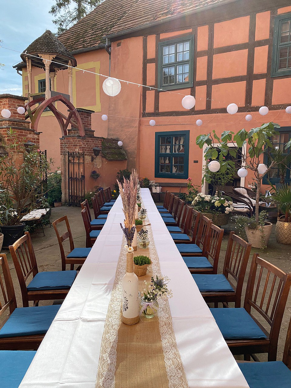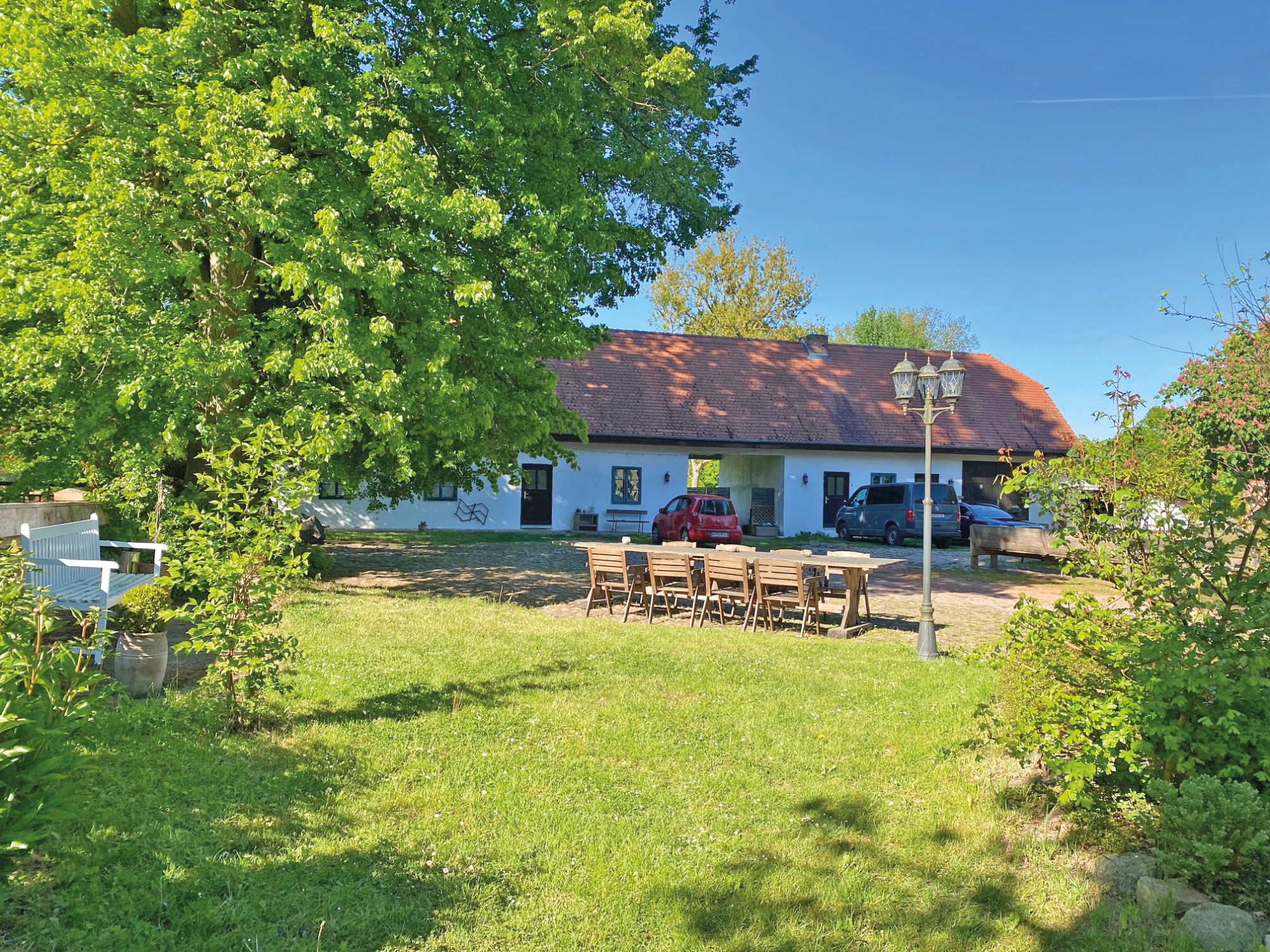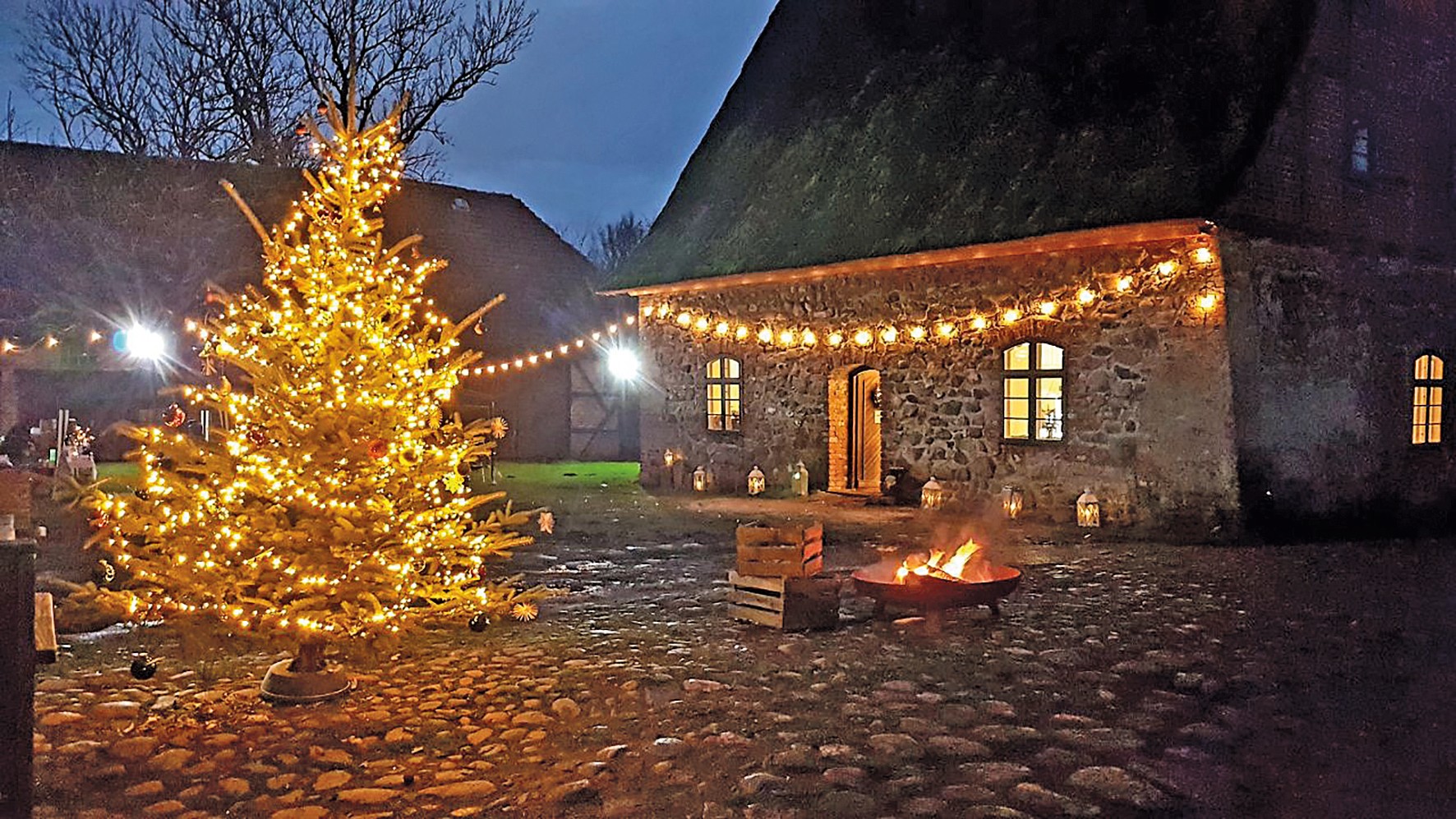 O celeiro de grãos com cobertura de colmo (aprox. 120 m² no rés do chão, sótão com possibilidade de conversão) é utilizado como espaço para eventos.