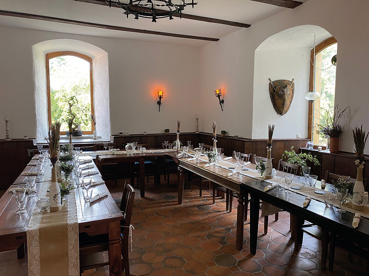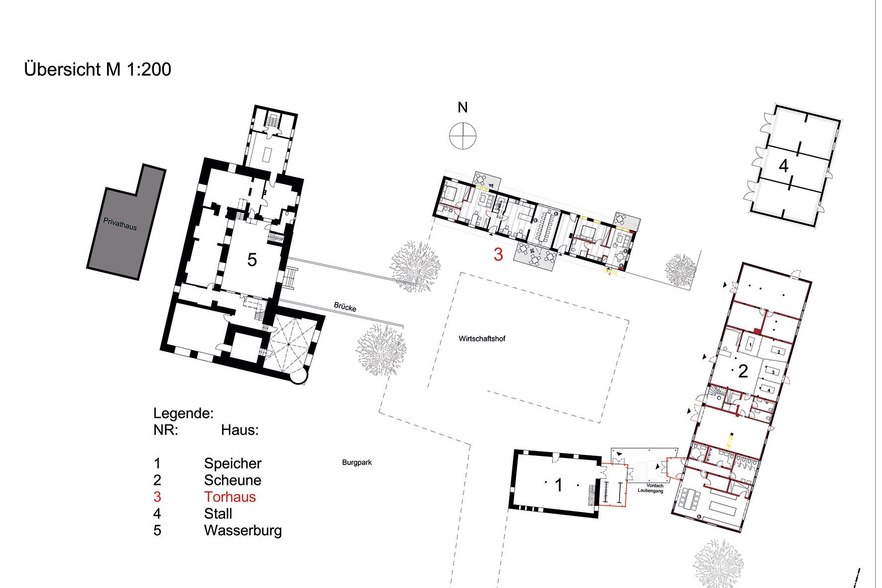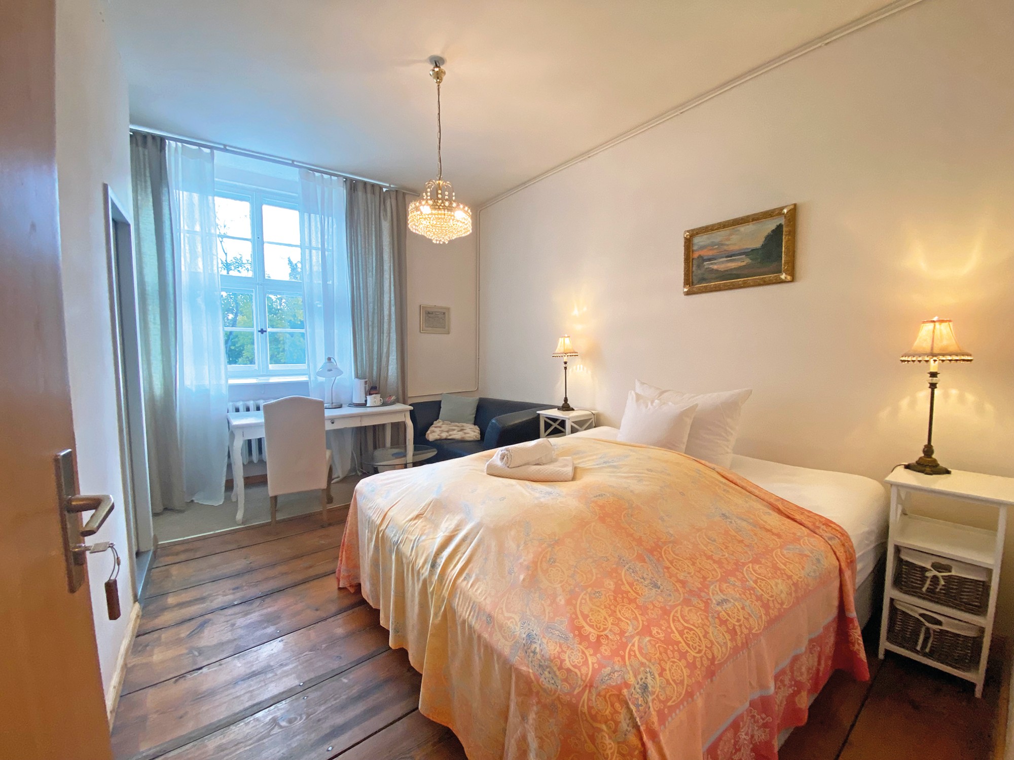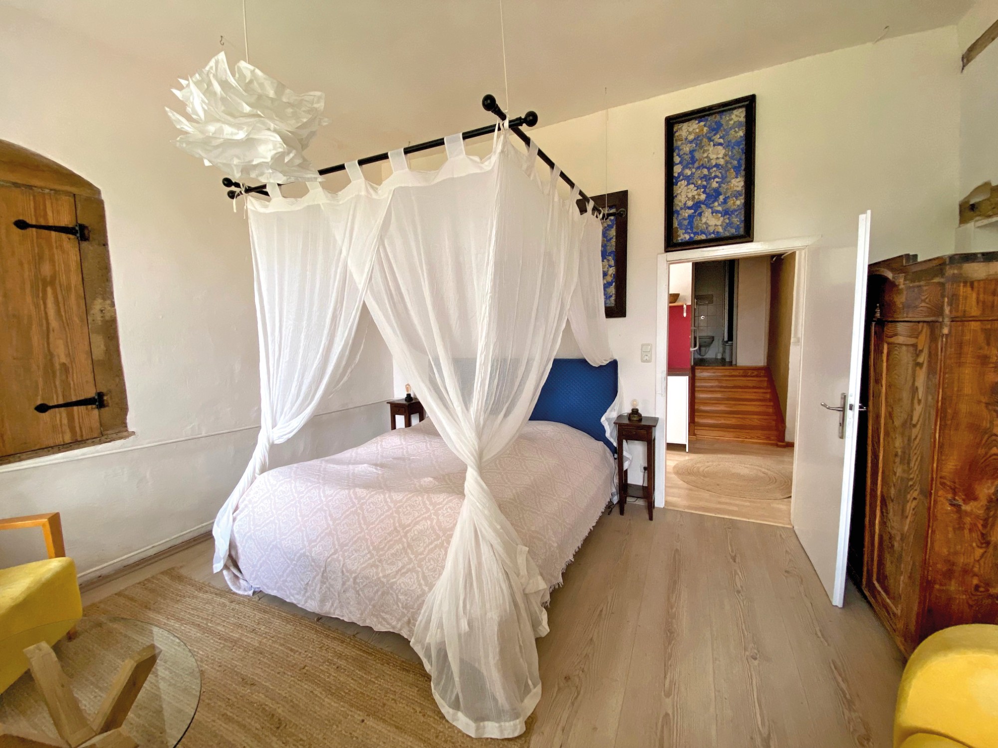 Nos dois pisos superiores e na torre encontram-se 15 quartos de hóspedes, dos quais 12 foram renovados, com um total de 36 camas. O sótão oferece cerca de 420 m² com potencial de ampliação. As caves abobadadas são adequadas para utilizações adicionais.