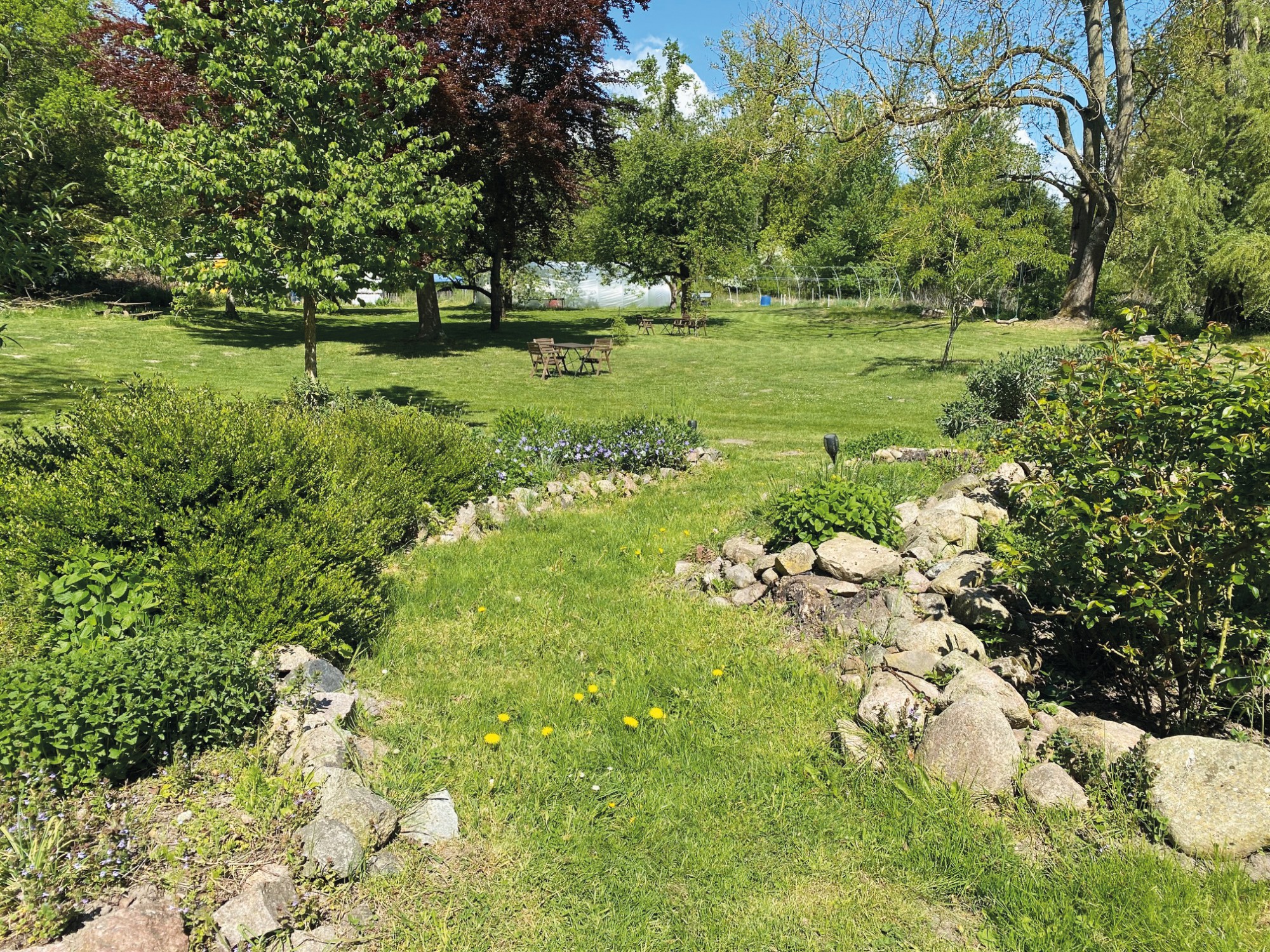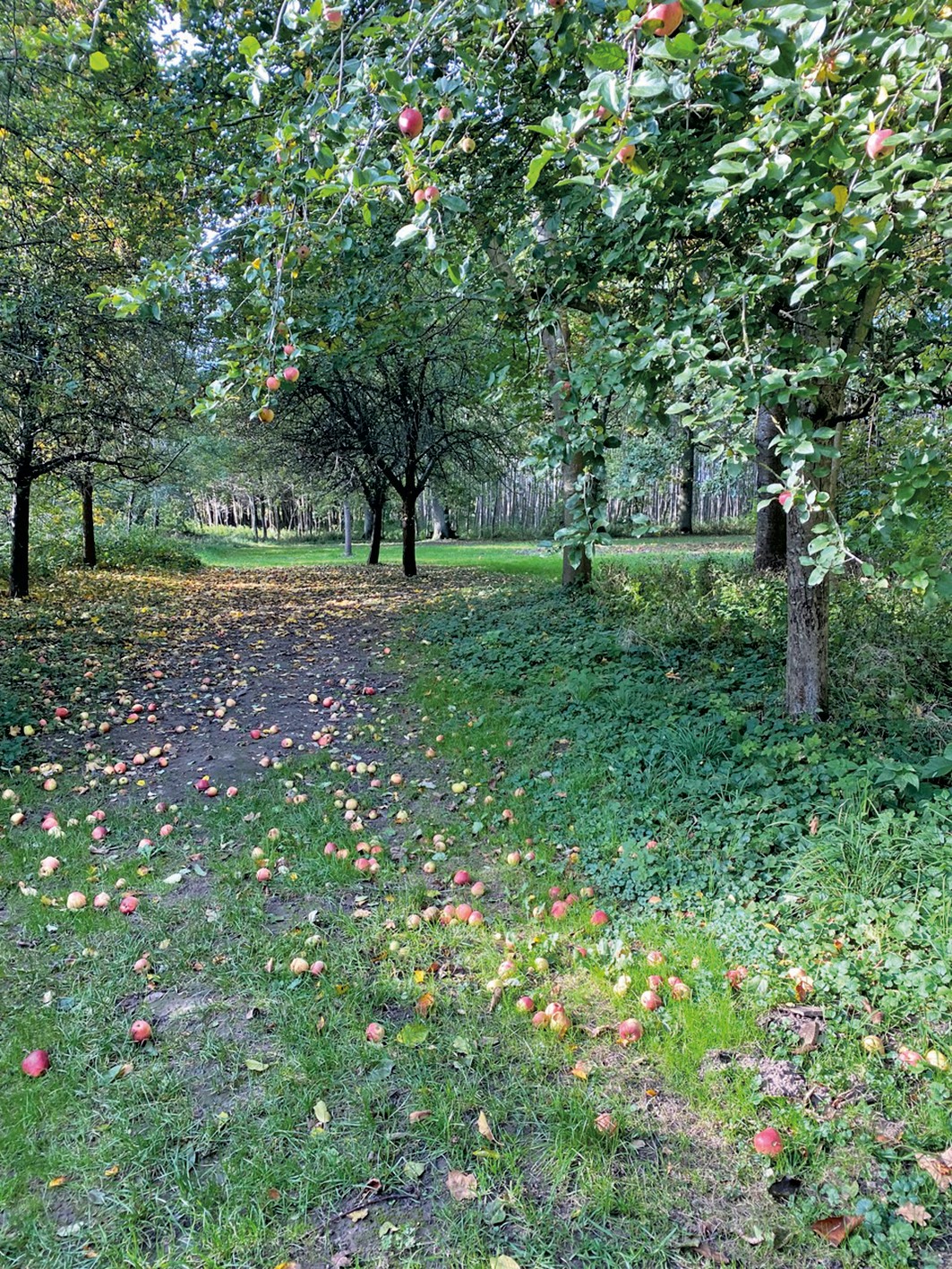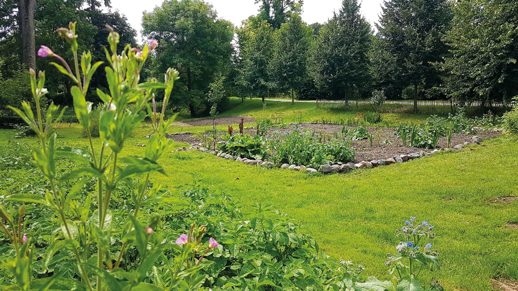 O pomar apresenta variedades históricas de macieiras, bem como cerejeiras, ameixeiras mirabel, ameixeiras, pereiras, pessegueiros e árvores de frutos secos, complementadas por arbustos de bagas e ervas culinárias. As terras agrícolas têm sido cultivadas de forma biológica nos últimos anos. Extensas áreas de pastagem permitem a criação de animais.