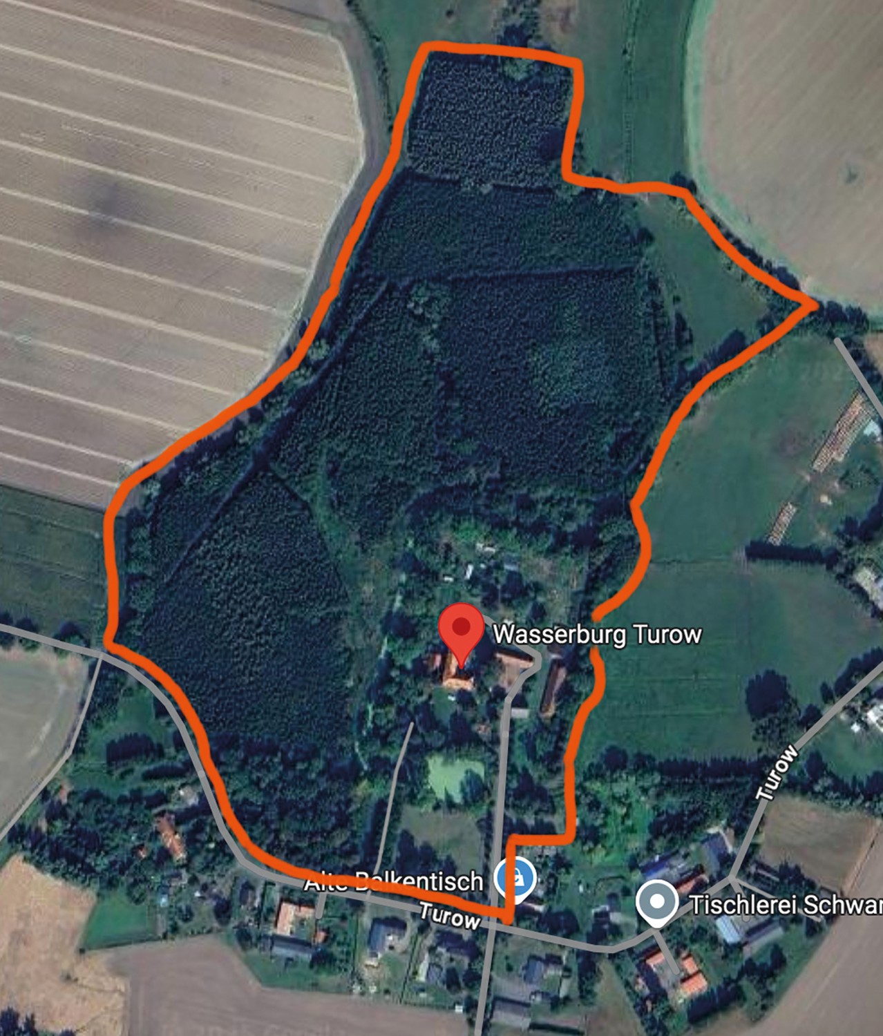 O castelo com fosso situa-se numa localização isolada dentro da aldeia de Turow (aprox. 60 habitantes). A autoestrada A20 encontra-se a 15 minutos. Greifswald, Stralsund e Rostock situam-se a 20–50 minutos; o Mar Báltico e a Região dos Lagos de Mecklemburgo a 40–50 minutos. Berlim e Hamburgo ficam a cerca de duas horas.
