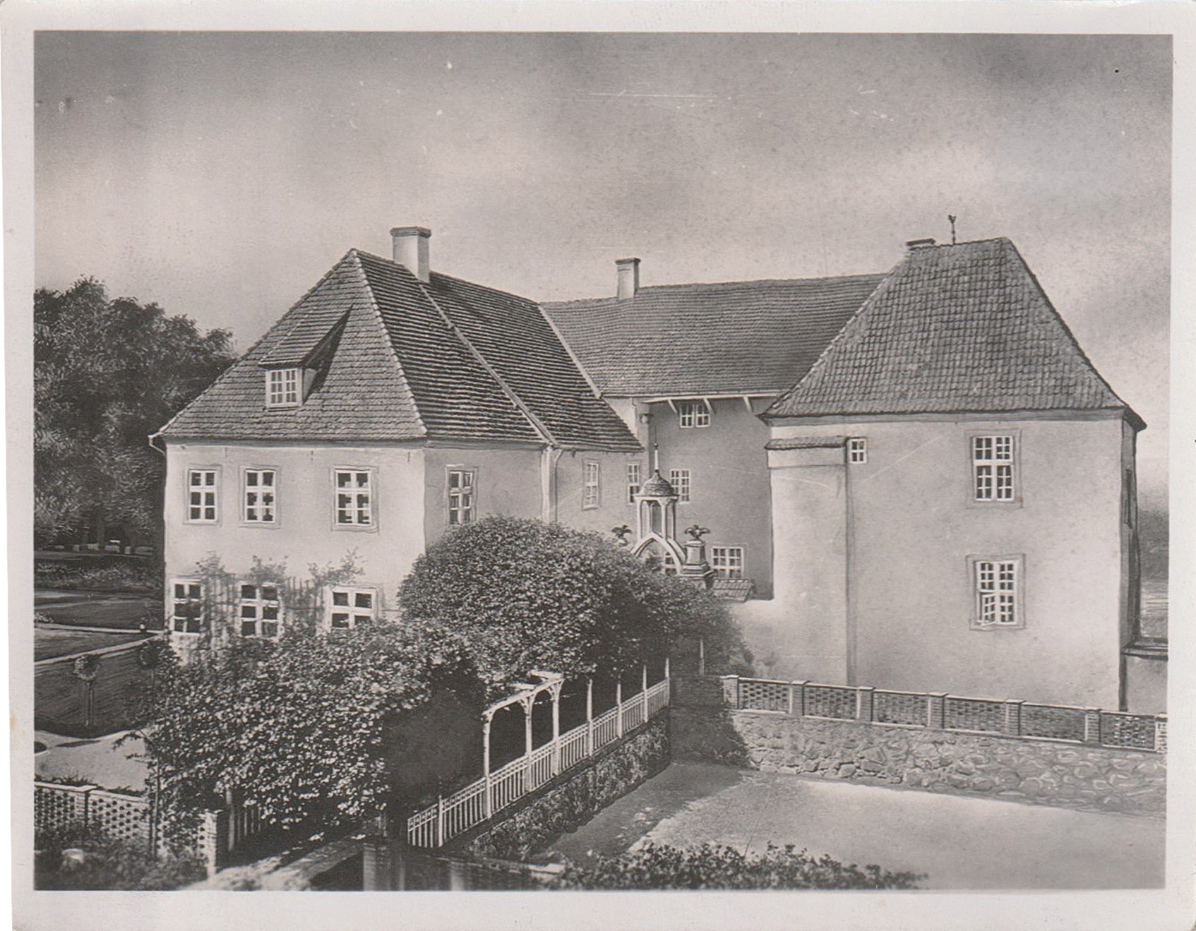 O castelo com fosso está situado numa ilha com quatro hectares, completamente rodeada por um fosso com água. O conjunto inclui o castelo principal, o edifício do portão de entrada, um celeiro em enxaimel, um celeiro de grãos com cobertura de colmo, uma casa de jardim e um estábulo para cavalos.