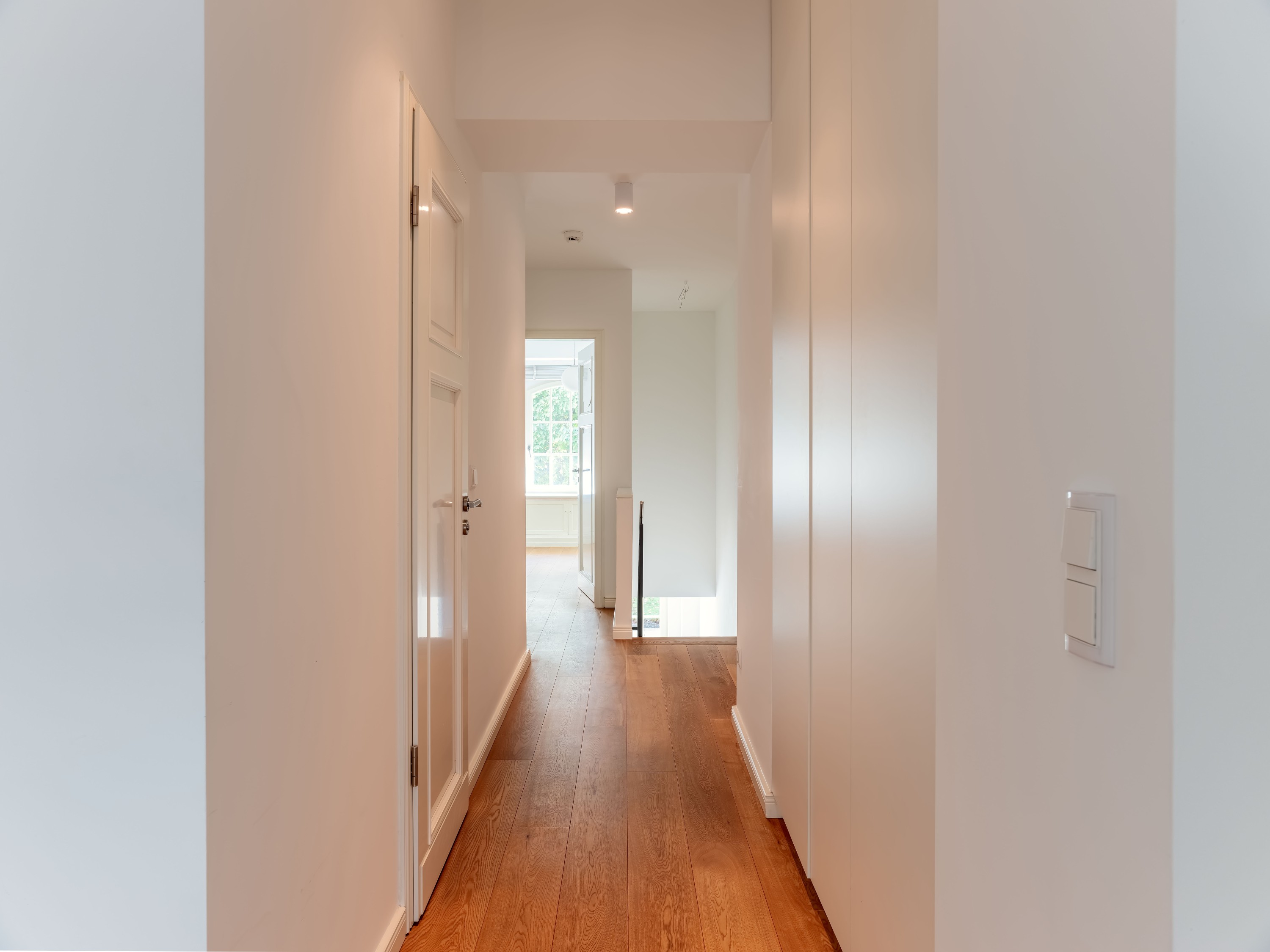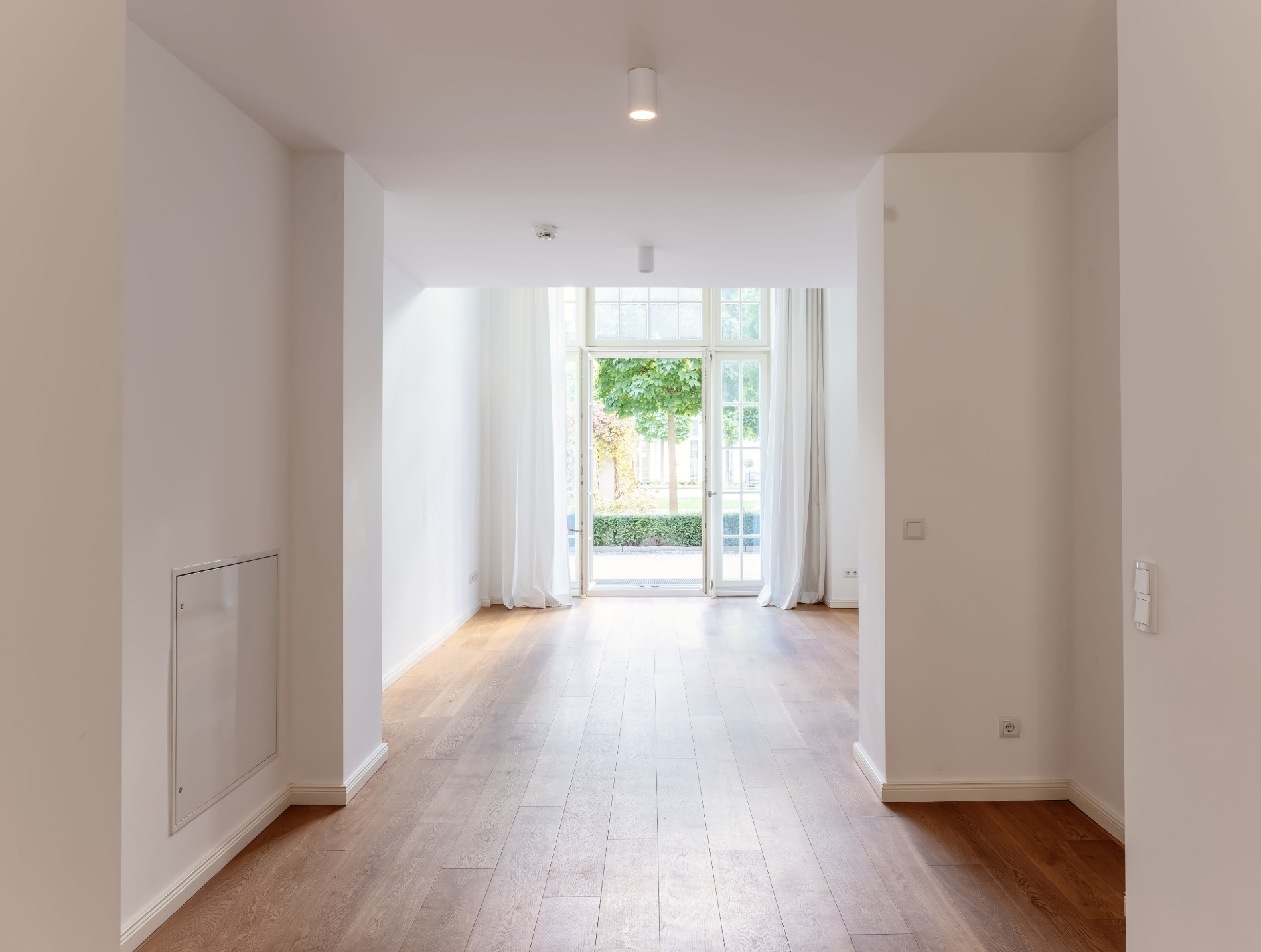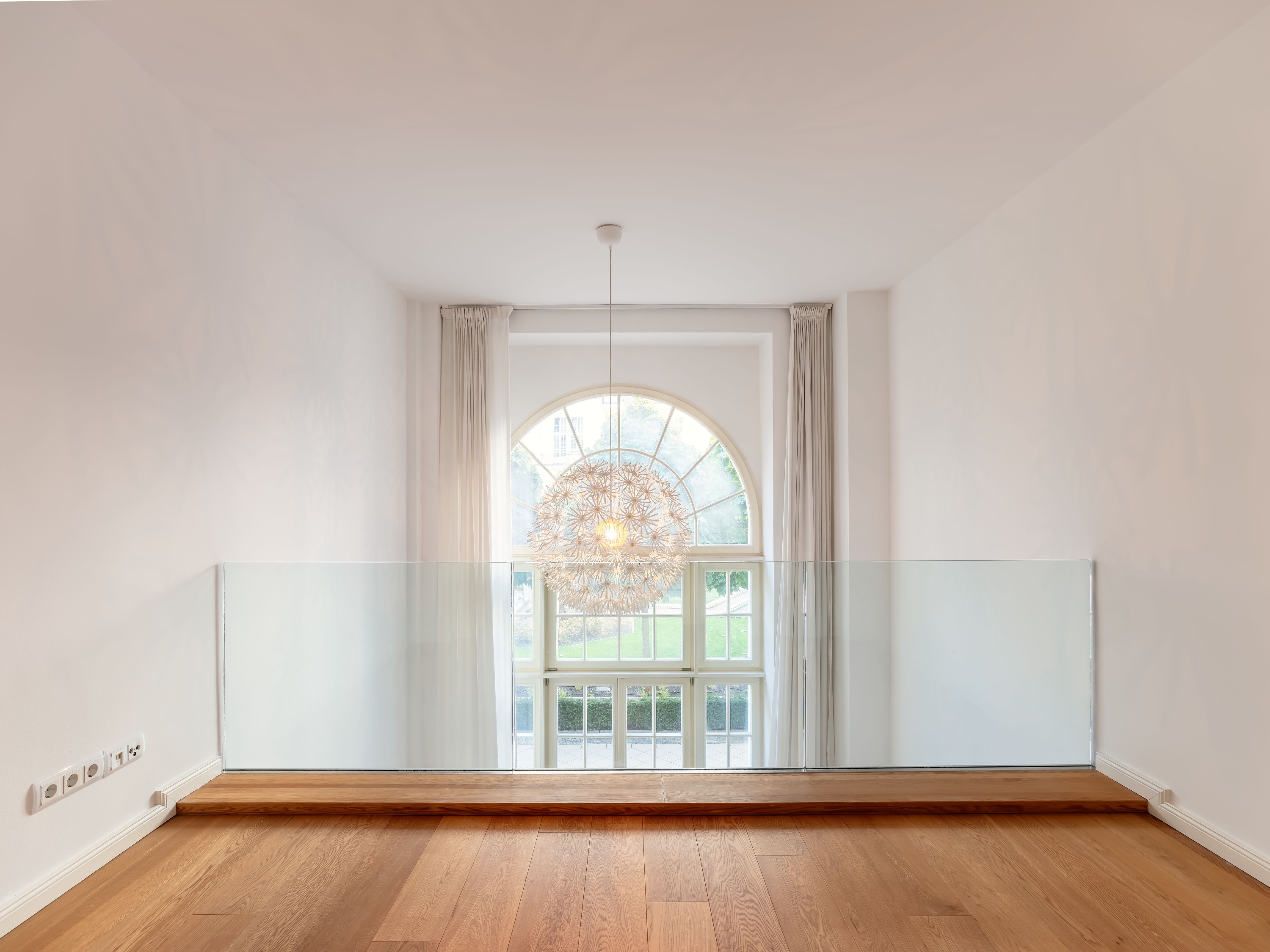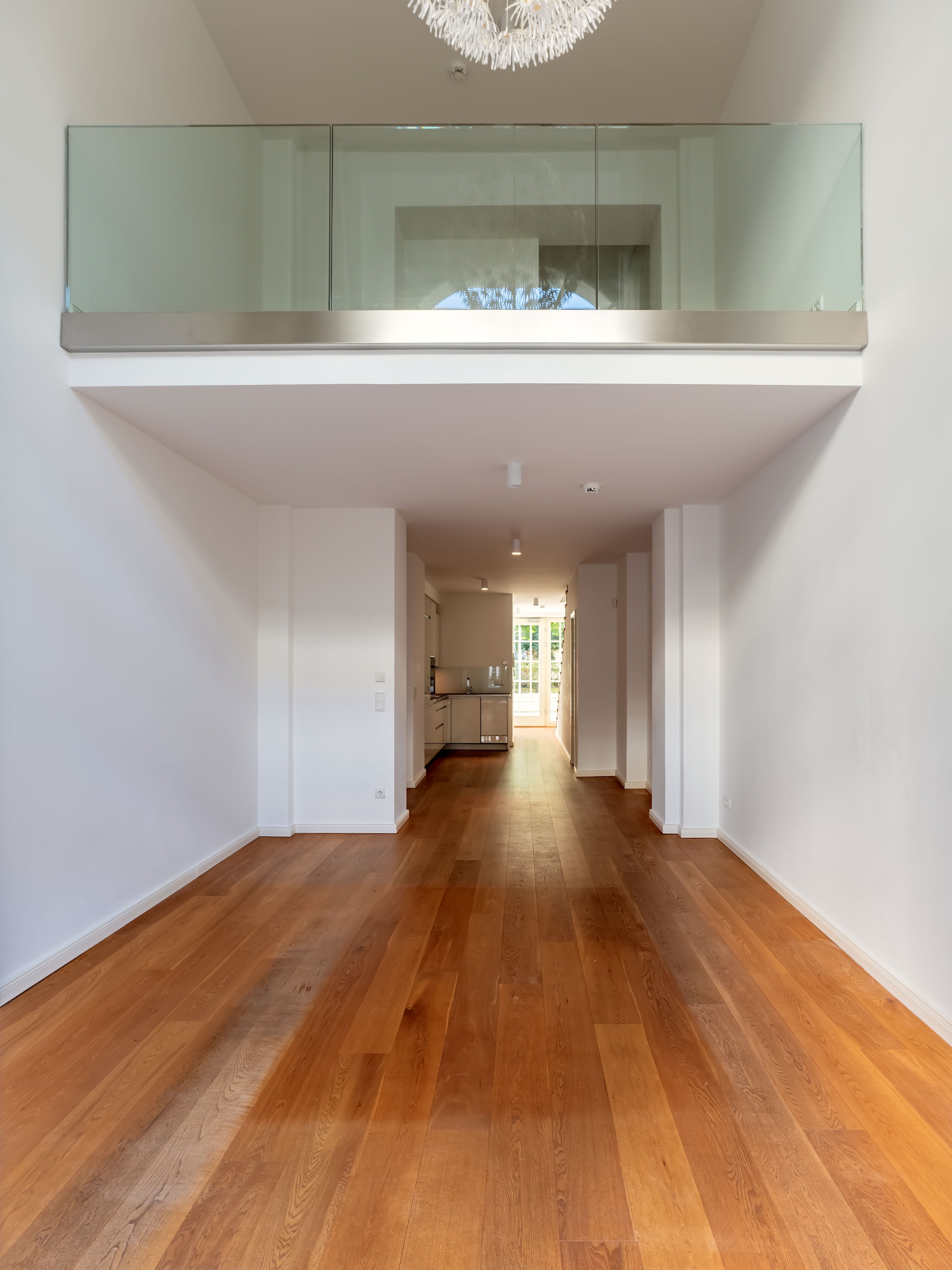 O loft se destaca pela generosa altura de aproximadamente 7 metros, com um elegante mezanino que complementa o espaço. O layout oferece uma sensação de amplitude e cria diversas opções de uso – seja como um amplo apartamento ou um espaço representativo para uso comercial. A orientação leste-oeste garante uma iluminação natural ideal, enquanto as janelas do chão ao teto proporcionam uma vista tranquila para o pátio interno e seu jardim cuidadosamente projetado.