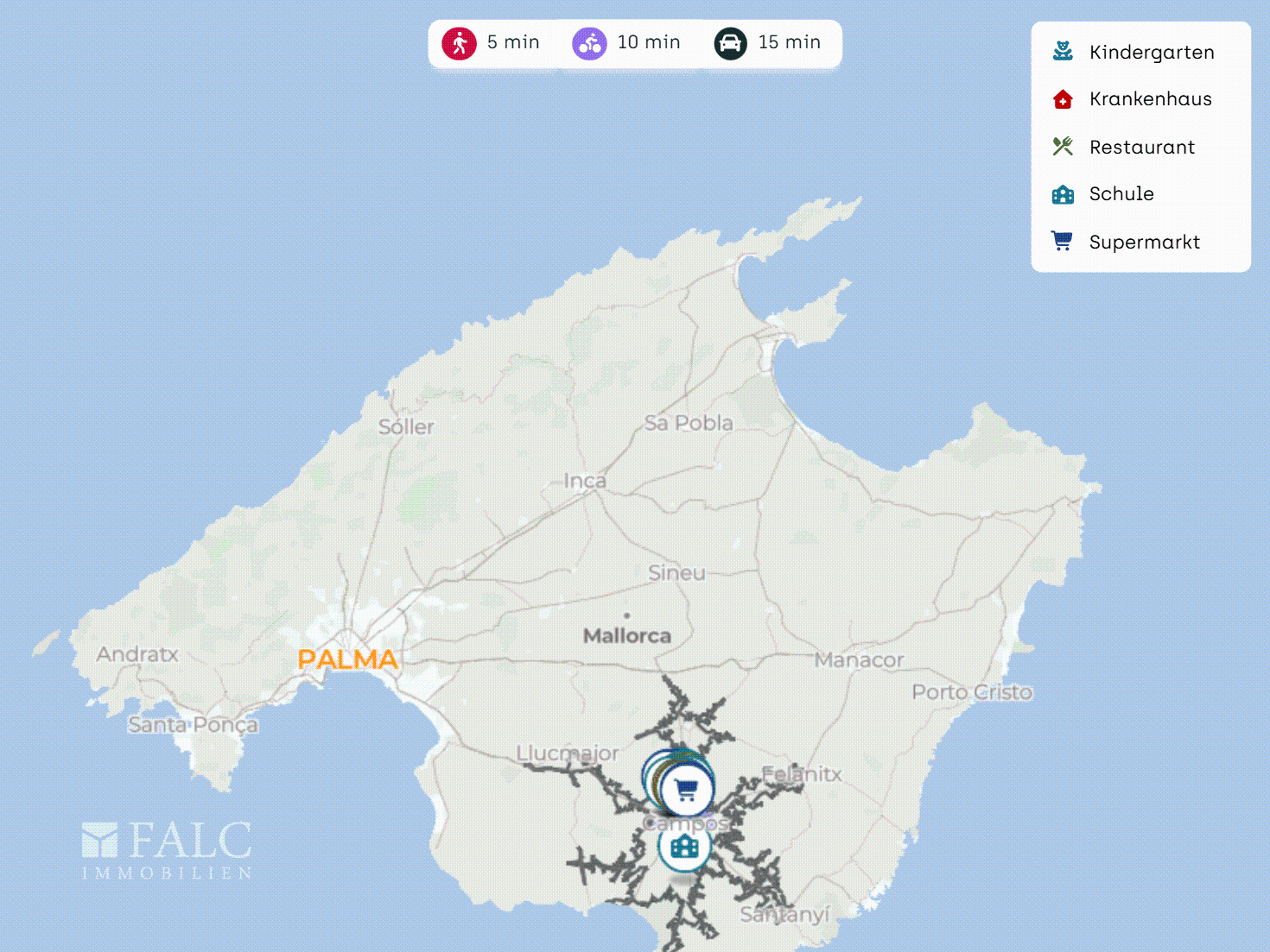 Campos é uma vila tradicional do sul de Maiorca, com todos os serviços de proximidade, distâncias curtas e a típica atmosfera maiorquina. A praia de Es Trenc fica a cerca de 15 minutos de carro, e o aeroporto de Palma a aproximadamente 25-30 minutos.