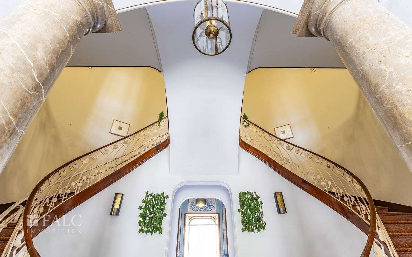 Uma escada curva leva ao primeiro piso, onde se encontram uma sala de estar luminosa com lustre e lareira, uma sala de jantar acolhedora, uma cozinha moderna, três quartos e outra casa de banho.