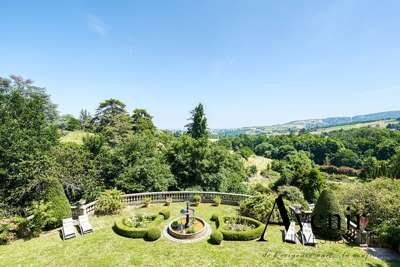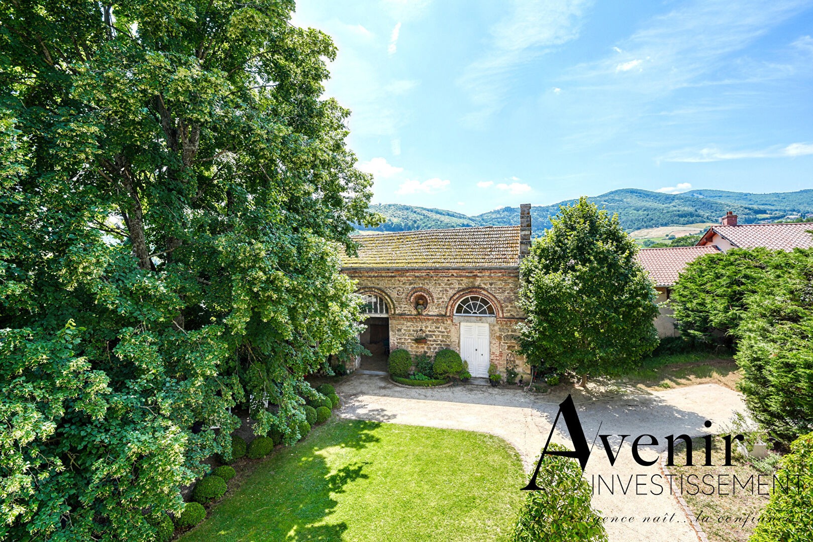 A propriedade distribui-se por três pisos de aproximadamente 180 m² cada, inserida num terreno com cerca de 8.000 m² e vista aberta para os Monts du Lyonnais.