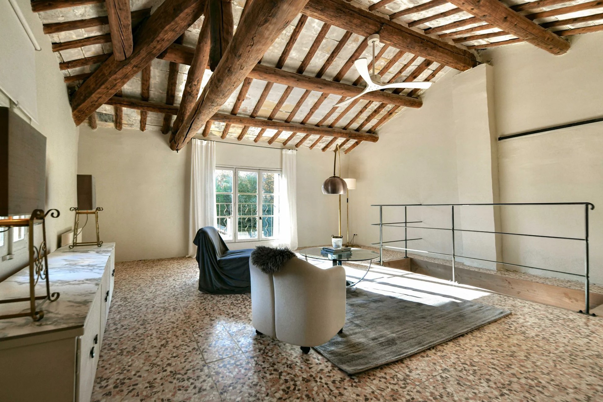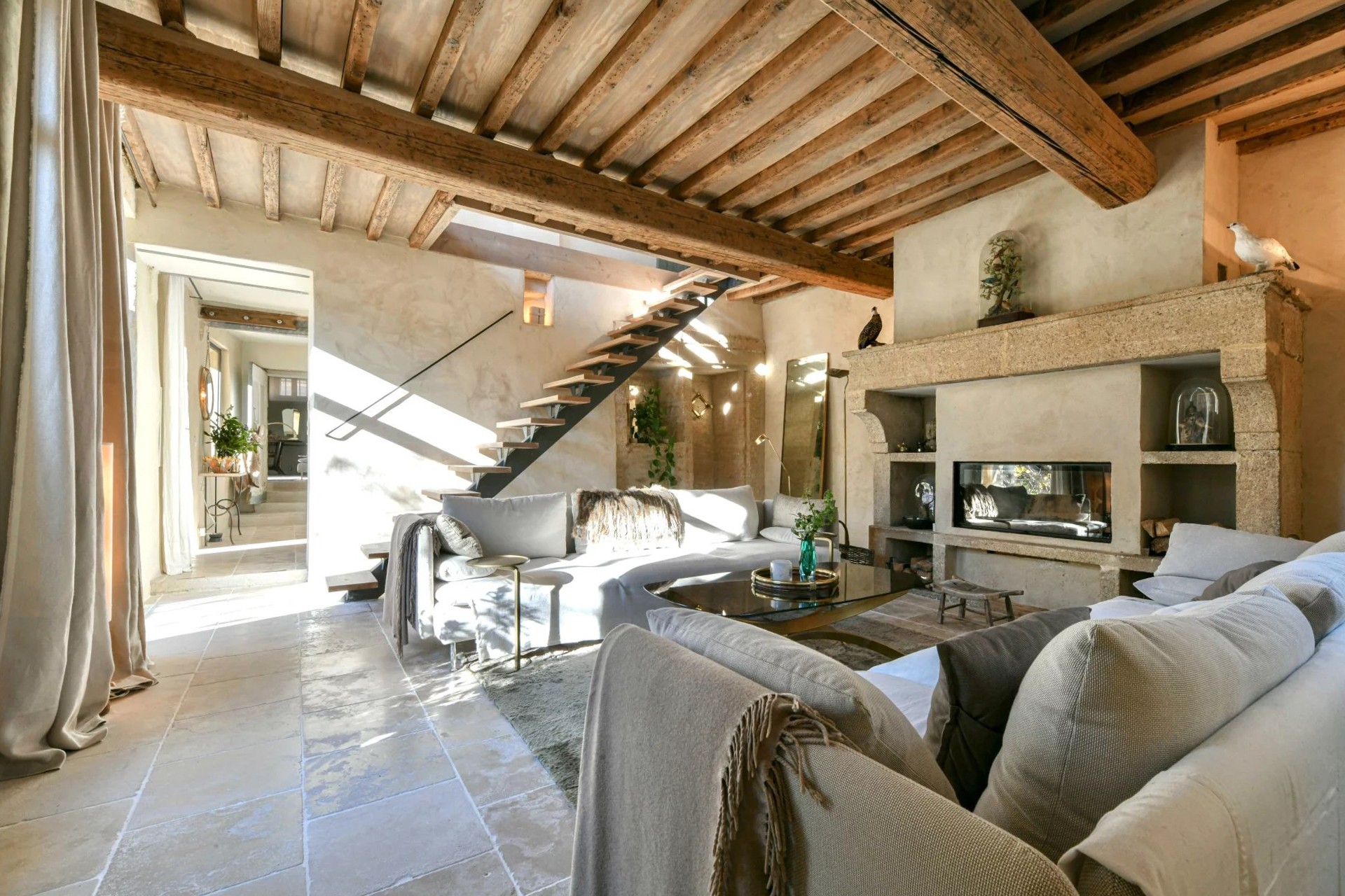 No piso superior, uma sala luminosa (33,40 m²) com lareira e vigas à vista conduz a duas suítes adicionais (20 e 30 m²), cada uma com casa de banho própria. Uma pequena kitchenette e o terraço oferecem maior privacidade.