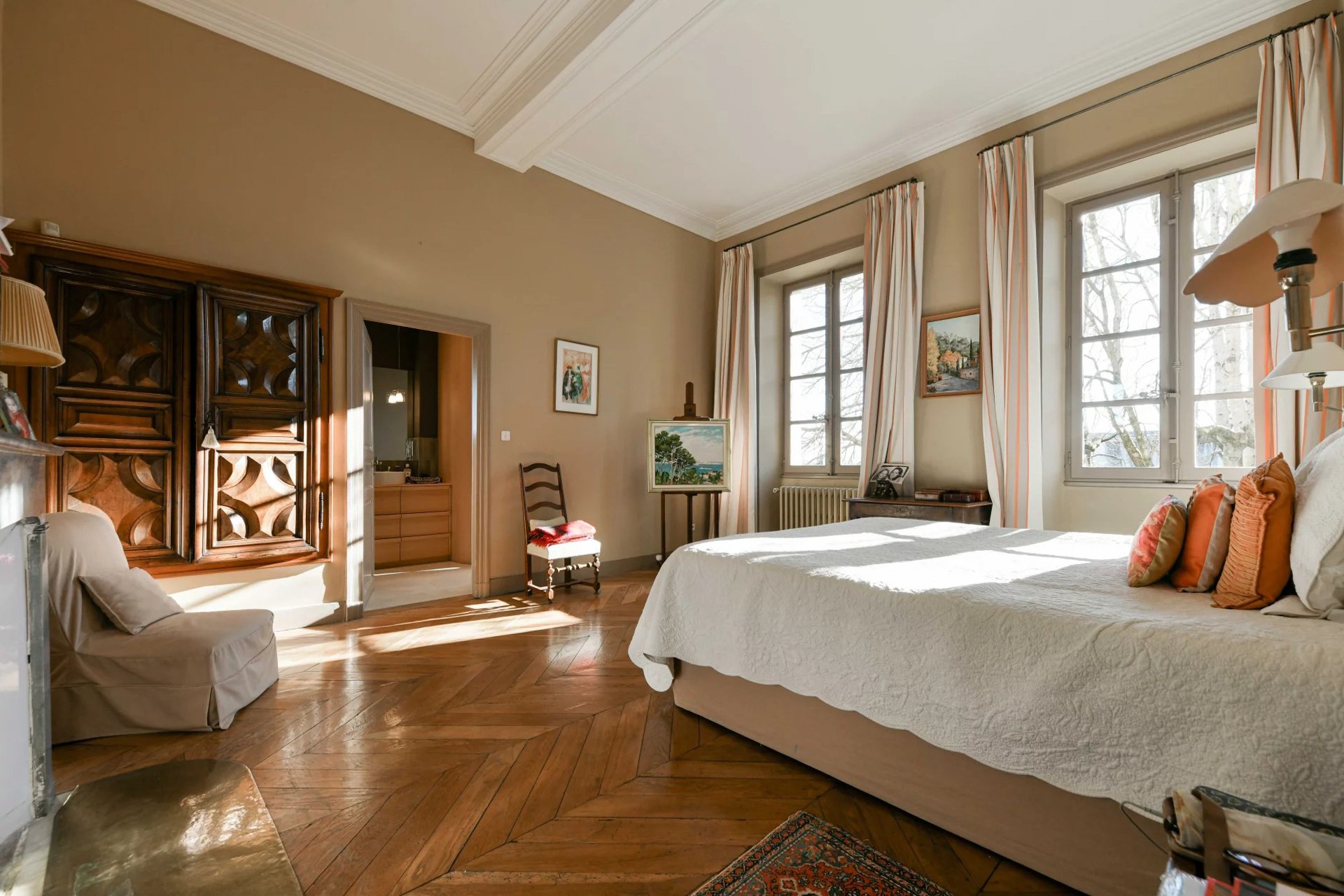 No exterior, o jardim paisagístico, com árvores antigas, inclui uma notável orangerie, uma zona de piscina (11 × 6 m) e um terraço coberto.