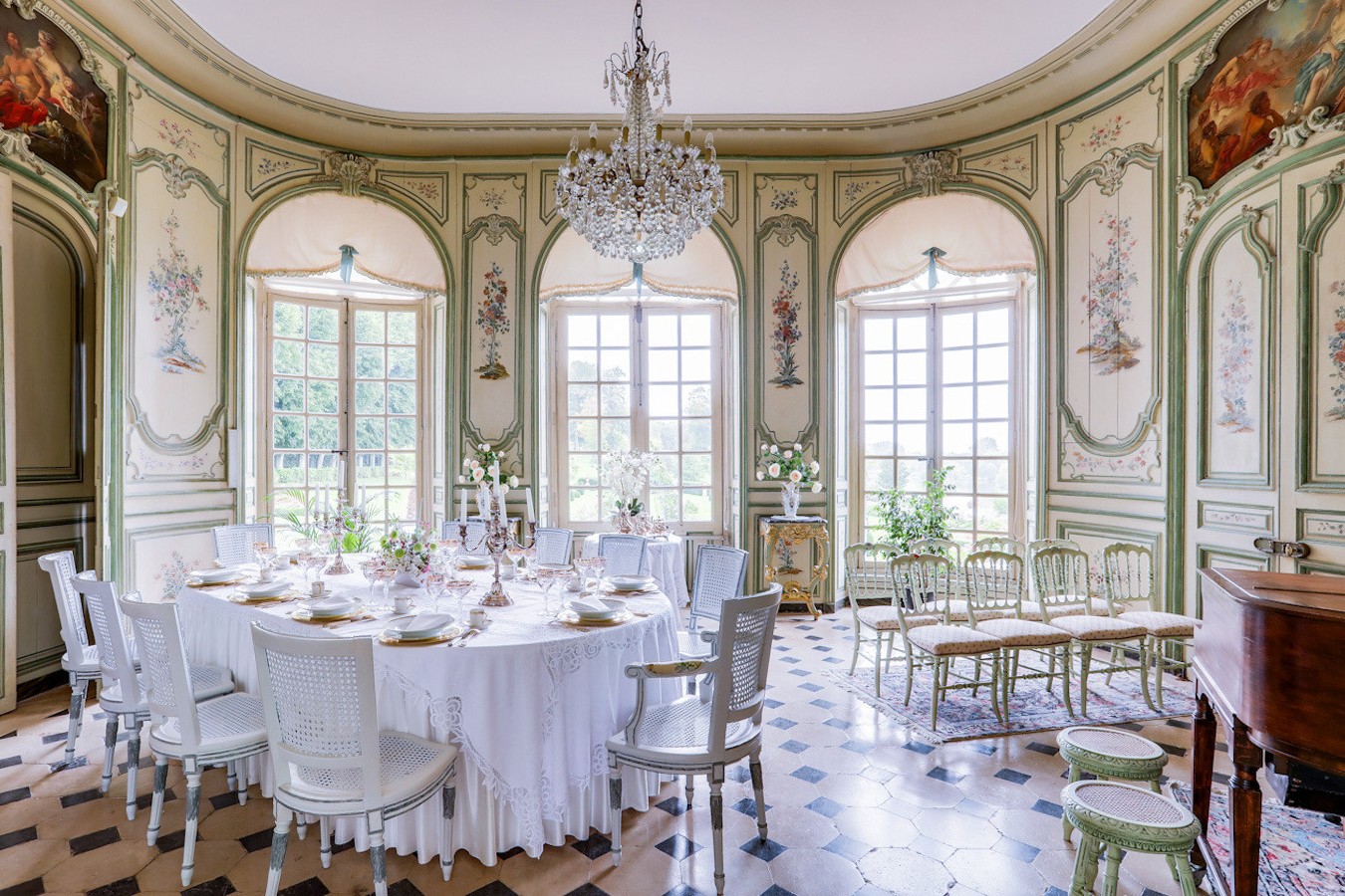 Os interiores estão totalmente preservados do século XVIII, com madeira dourada, pinturas originais de Jean-Baptiste Huet e salões elegantes que mantêm a opulência da época. Entre os destaques estão o Salão do Zodíaco, as salas de jantar com painéis pintados e o luminoso hall oval de entrada.