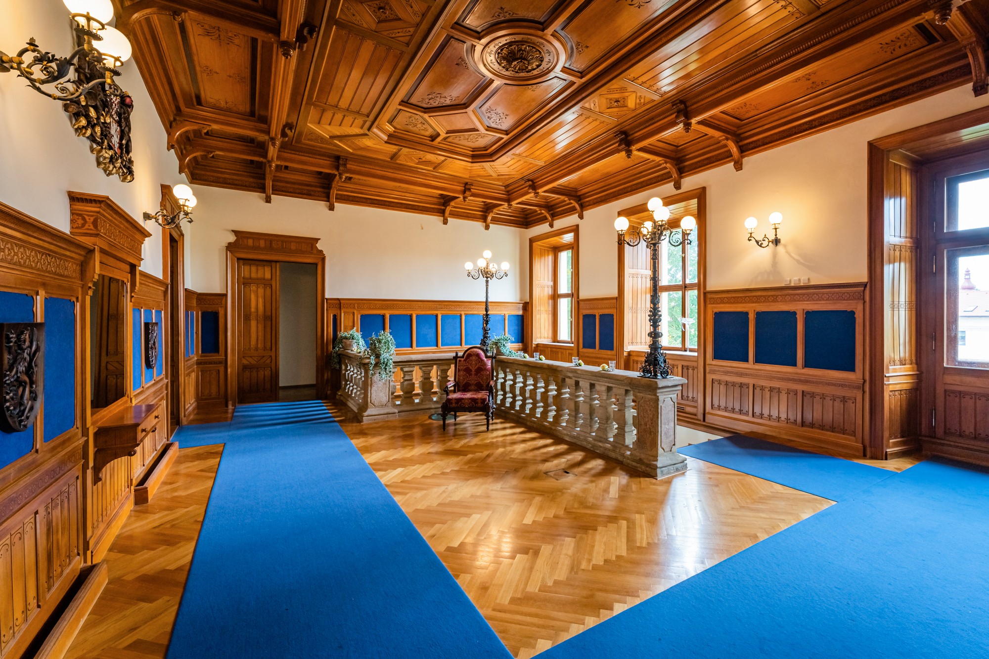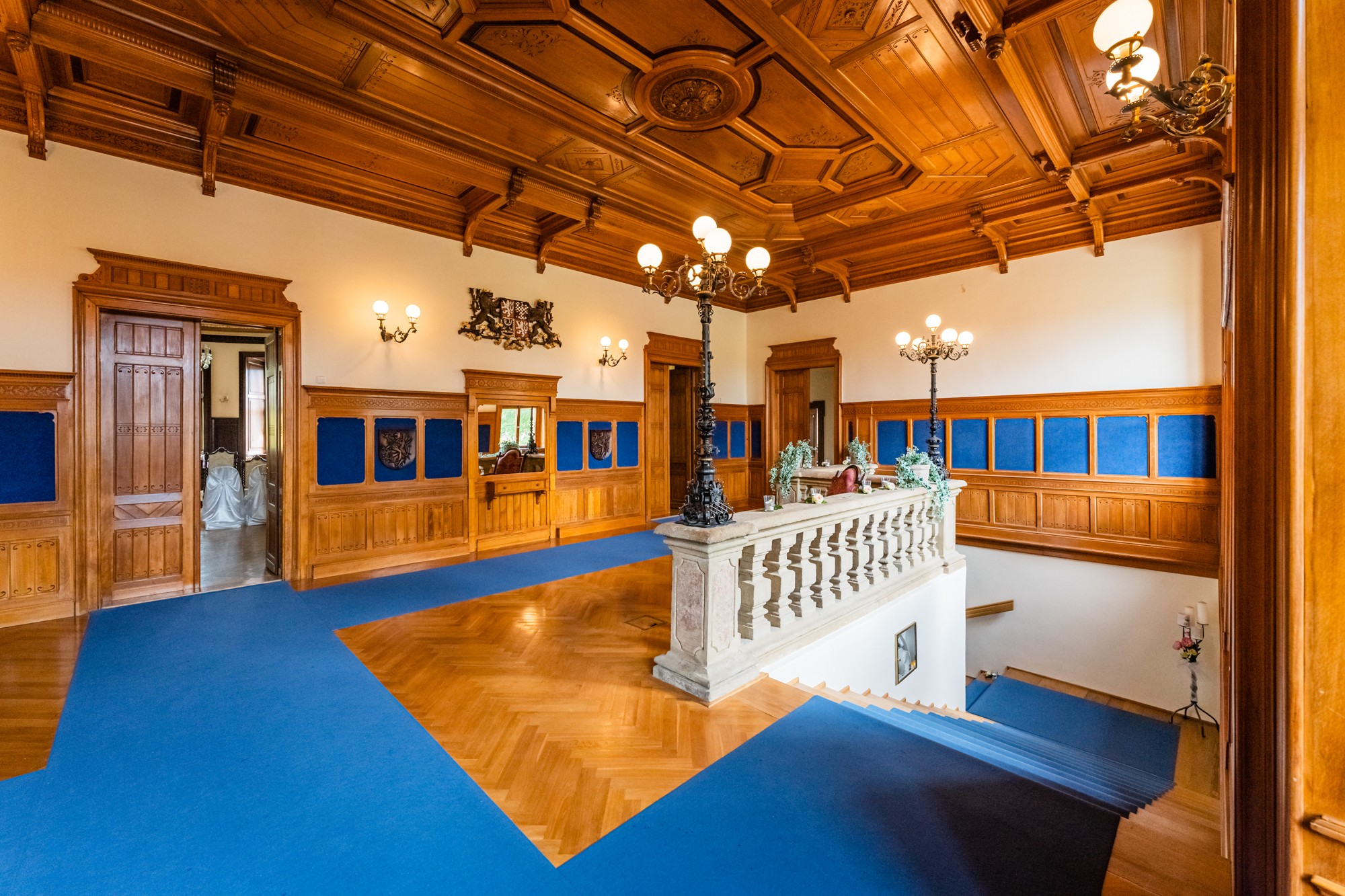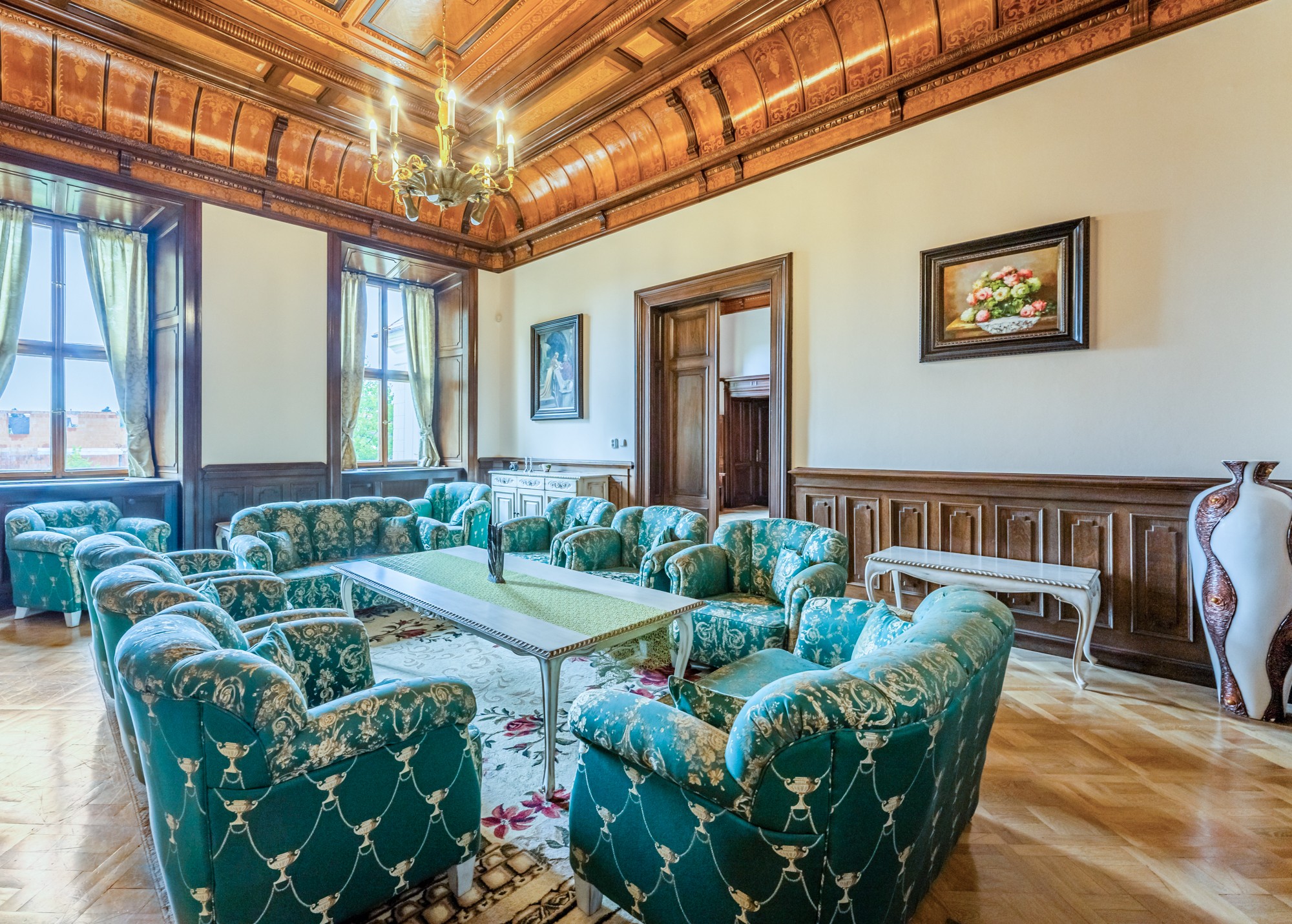 No interior, todos os detalhes arquitetónicos originais estão preservados em excelente estado. Reentrâncias de janelas com entalhes em madeira, um salão oval com salas adjacentes e uma escadaria em espiral escondida que conduz aos apartamentos da torre (77 m²) destacam o trabalho artesanal histórico.