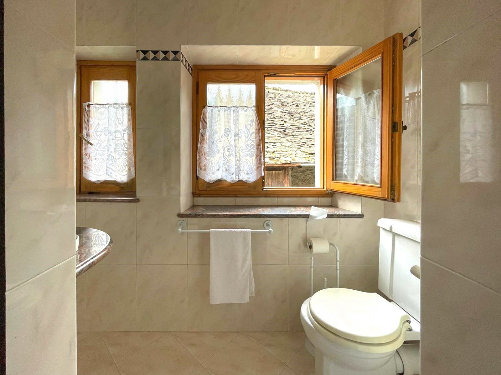 O rés-do-chão dispõe de um amplo hall de entrada, sala de jantar, cozinha com lareira, uma casa de banho e dois compartimentos de cave. O primeiro piso inclui dois quartos, uma sala com painéis de madeira e outra casa de banho. O segundo piso oferece quatro quartos duplos adicionais. O sótão pode ser ampliado, complementado por uma garagem ampla, um celeiro com potencial de aproveitamento e um jardim privado.