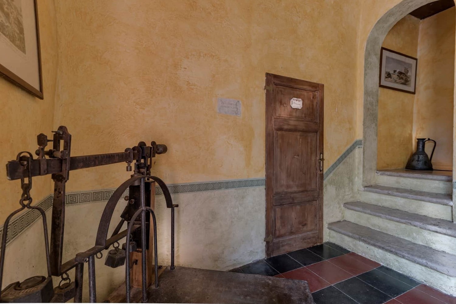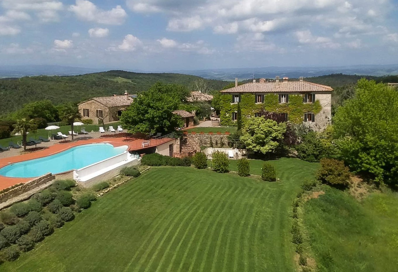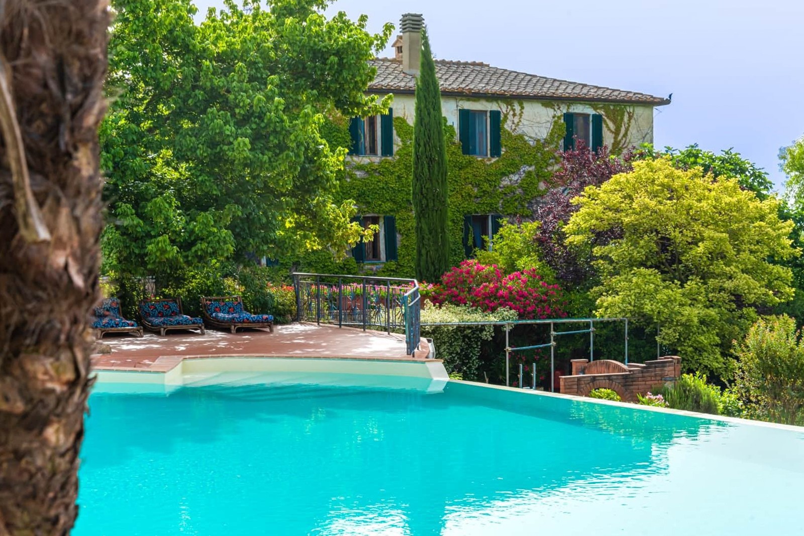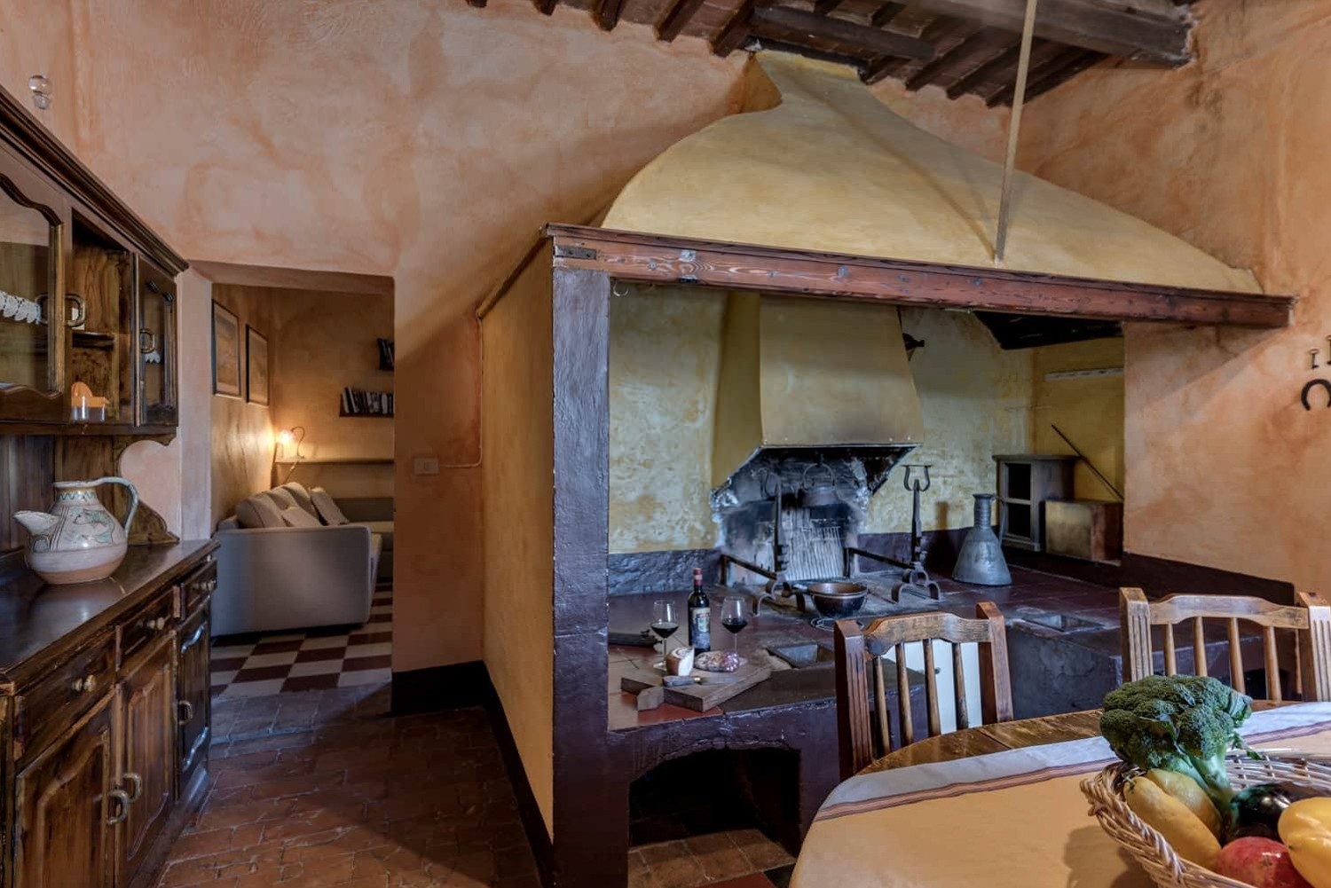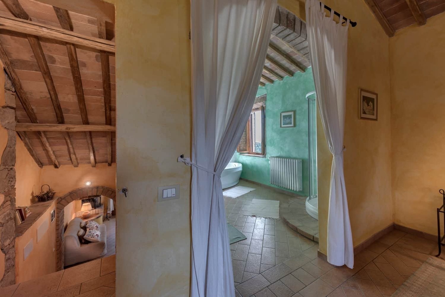 A villa principal tem acesso direto à piscina panorâmica rodeada por vegetação, e inclui cinco apartamentos luxuosos, projetados para garantir privacidade e conforto. Os apartamentos podem ser mantidos separados ou unidos para formar uma residência ampla, contando com oito quartos espaçosos e cinco banheiros com acabamentos de alta qualidade. As áreas de estar apresentam lareiras originais, pisos de terracota e vigas de madeira expostas, preservando o estilo tradicional toscano.