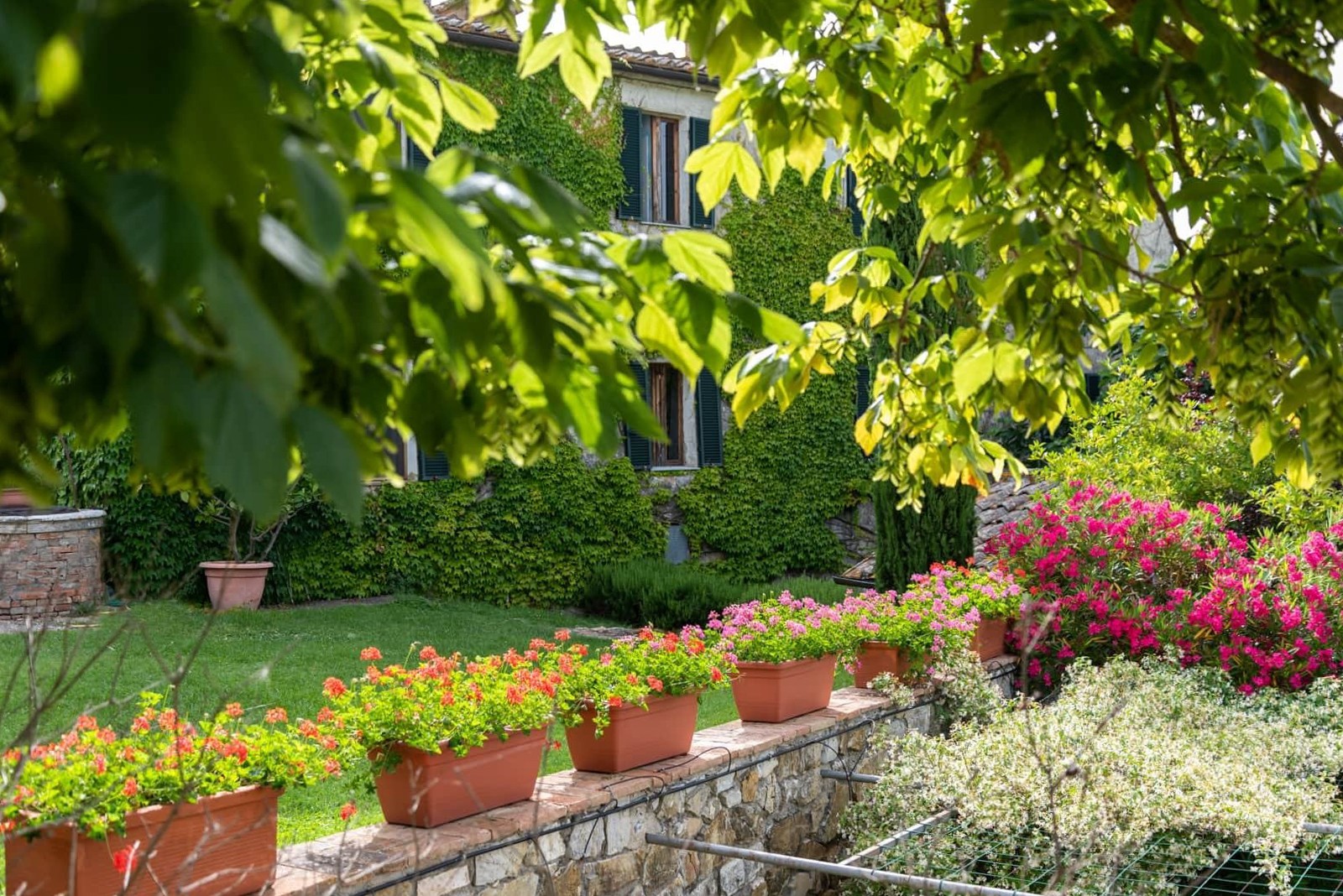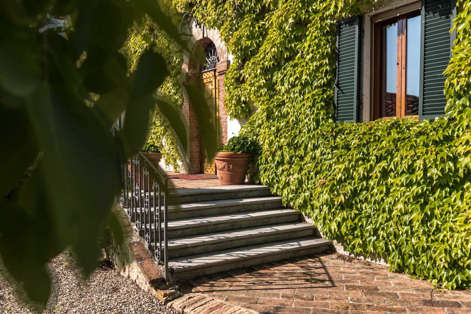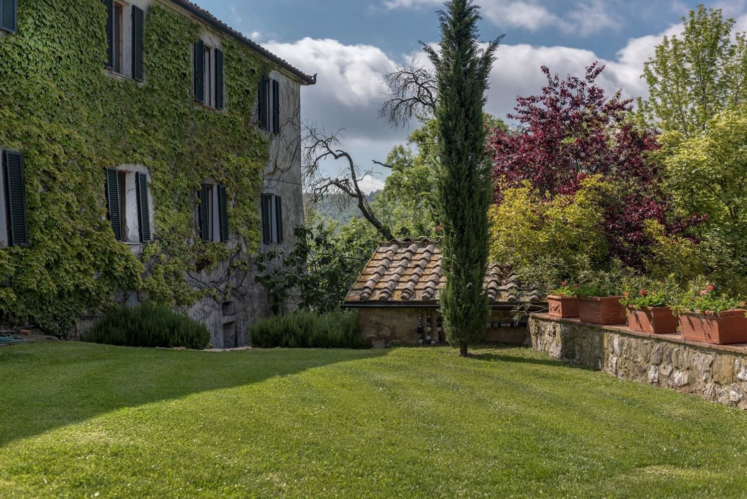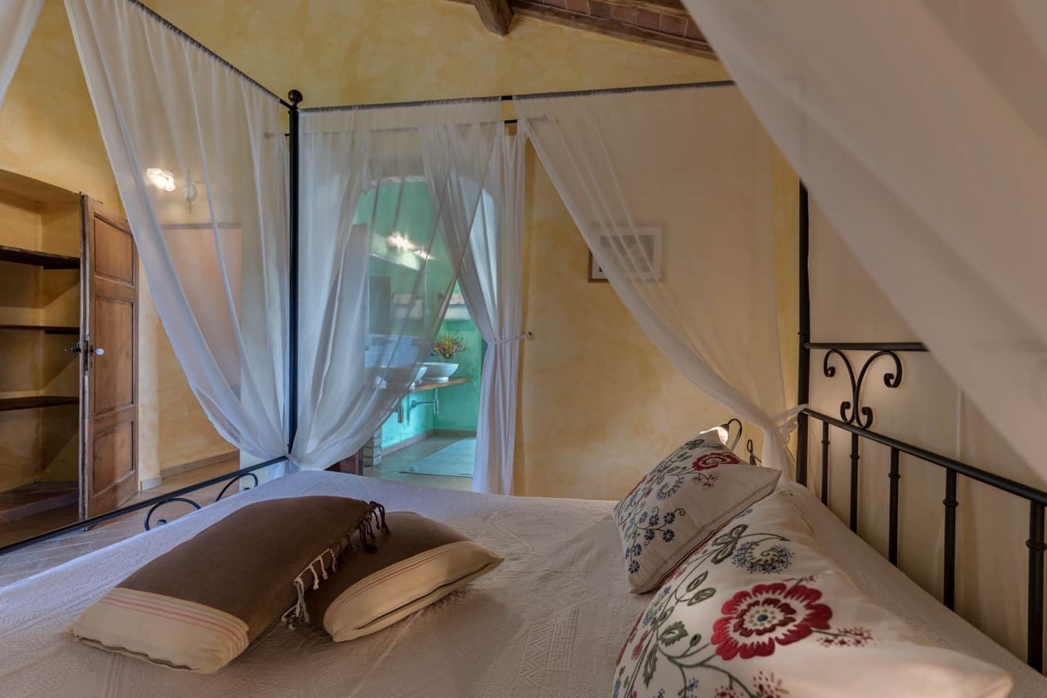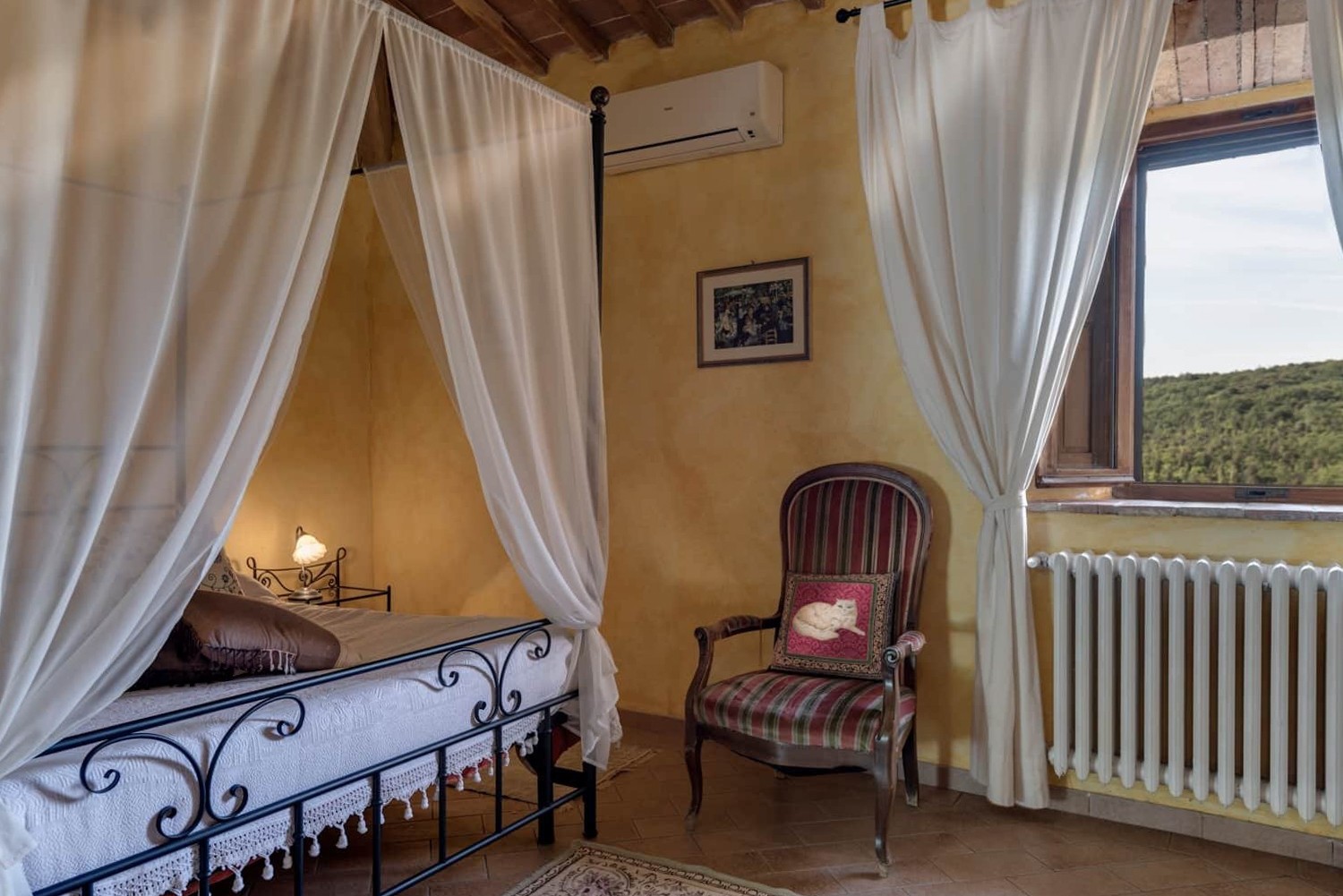 A villa principal tem acesso direto à piscina panorâmica rodeada por vegetação, e inclui cinco apartamentos luxuosos, projetados para garantir privacidade e conforto. Os apartamentos podem ser mantidos separados ou unidos para formar uma residência ampla, contando com oito quartos espaçosos e cinco banheiros com acabamentos de alta qualidade. As áreas de estar apresentam lareiras originais, pisos de terracota e vigas de madeira expostas, preservando o estilo tradicional toscano.