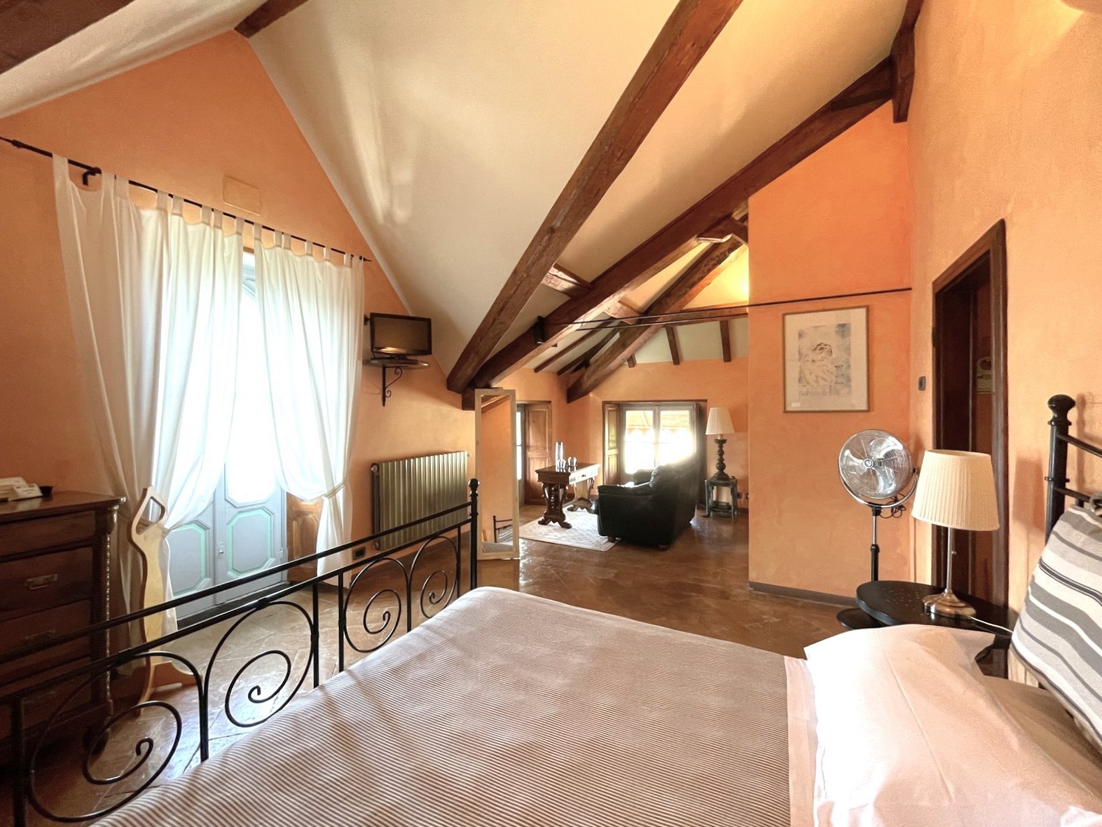 No rés-do-chão do edifício principal encontram-se um hall de entrada, uma ampla sala de estar com lareira e belos frescos originais, duas casas de banho e uma lavandaria. No primeiro e segundo andar há, em cada piso, dois quartos espaçosos, todos com casa de banho privativa. No sótão existem dois quartos adicionais com varanda, ambos também com casa de banho privativa. O piso inferior dispõe de uma adega ampla e acesso ao jardim.