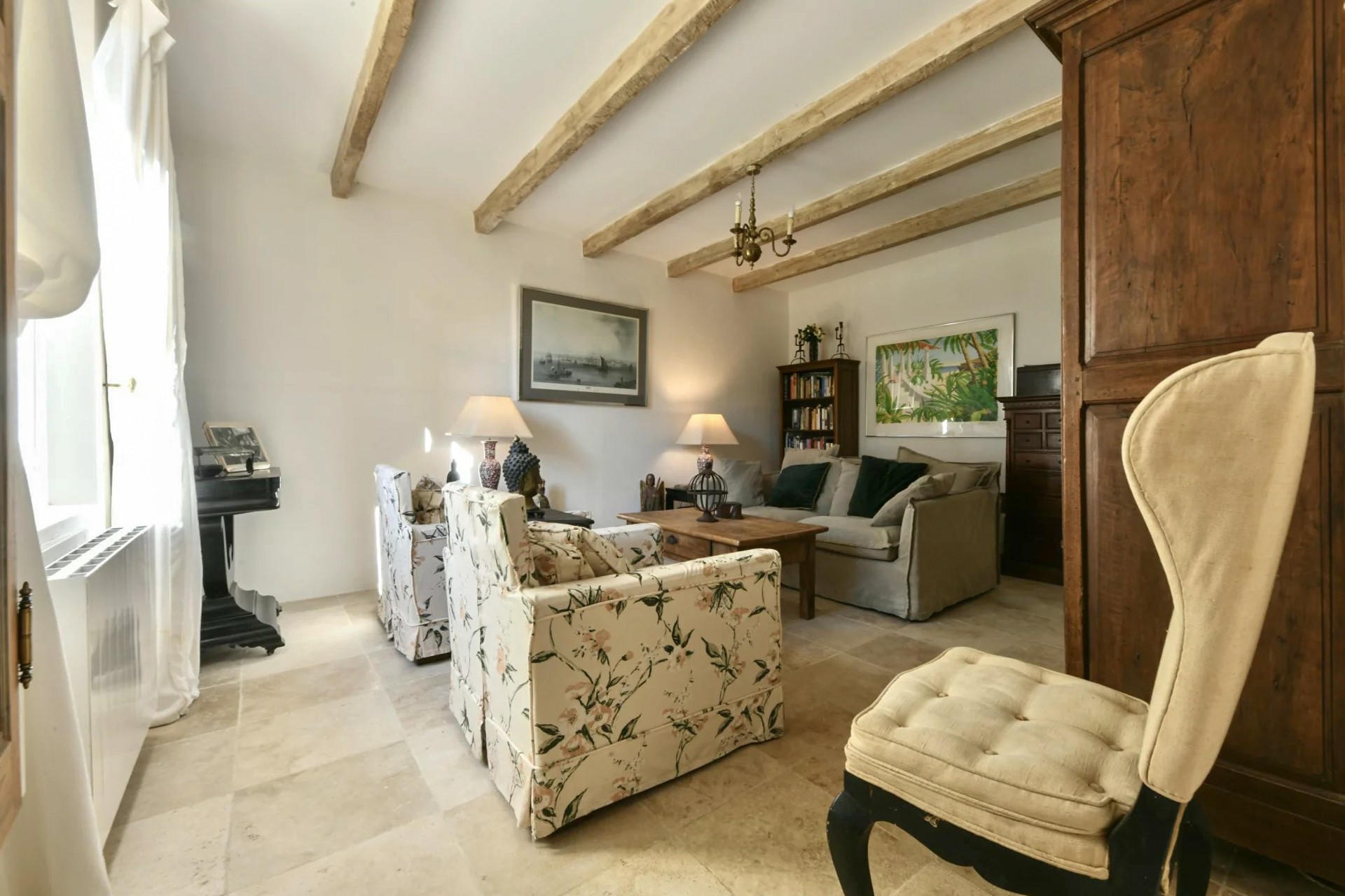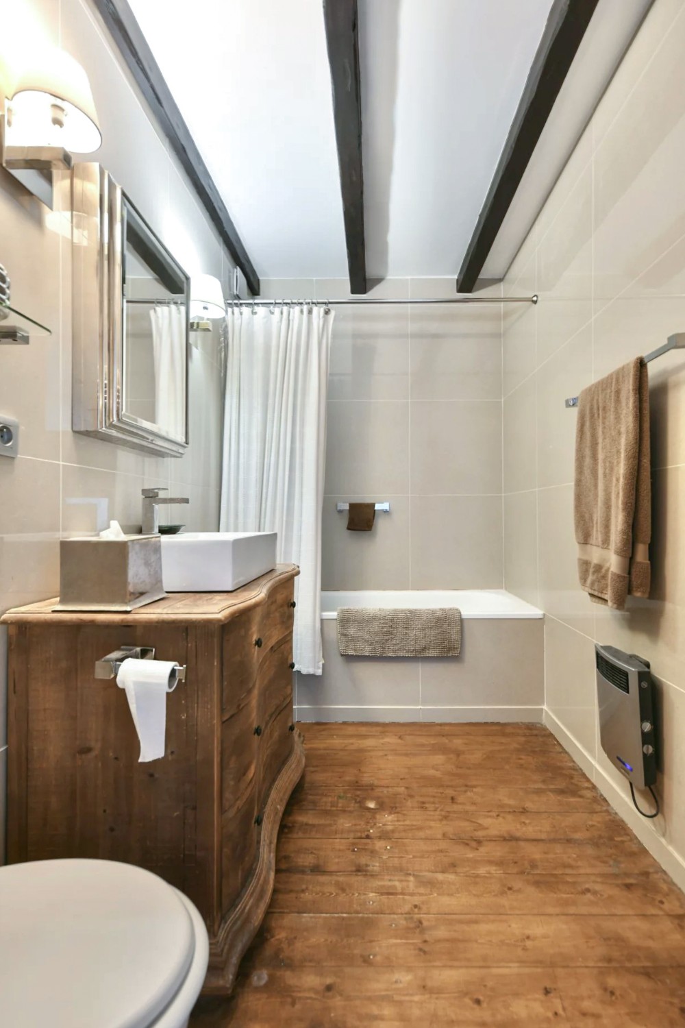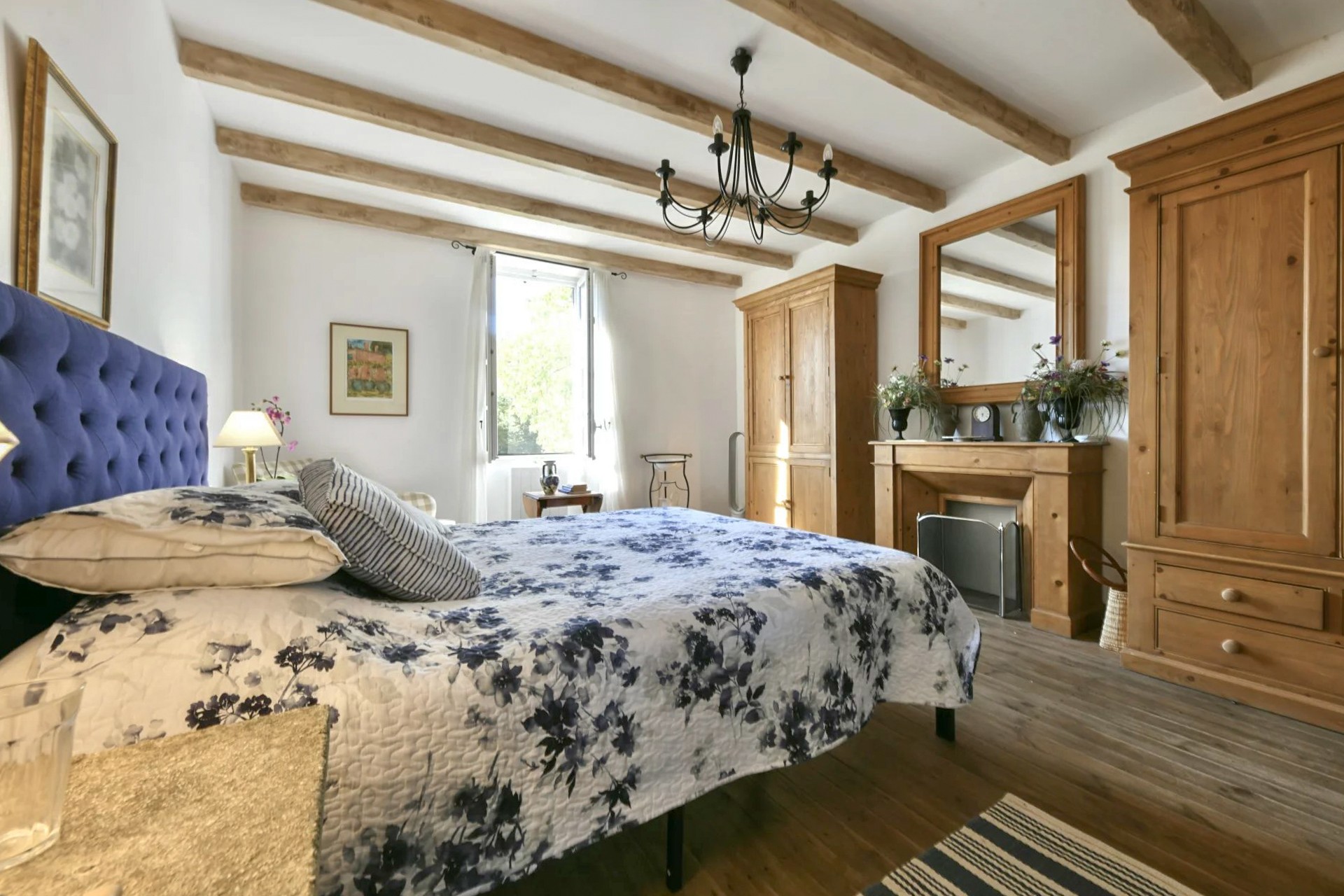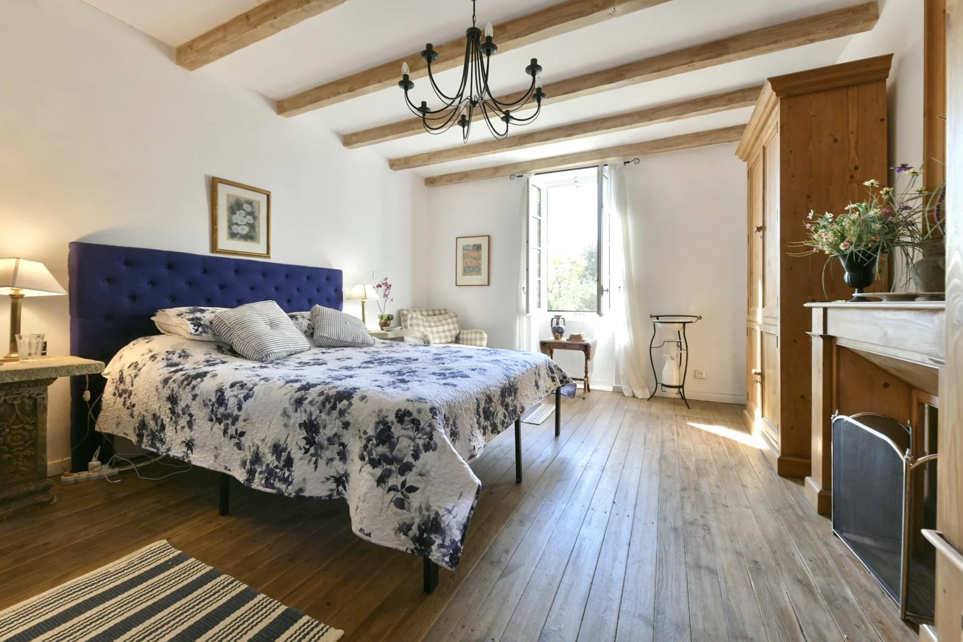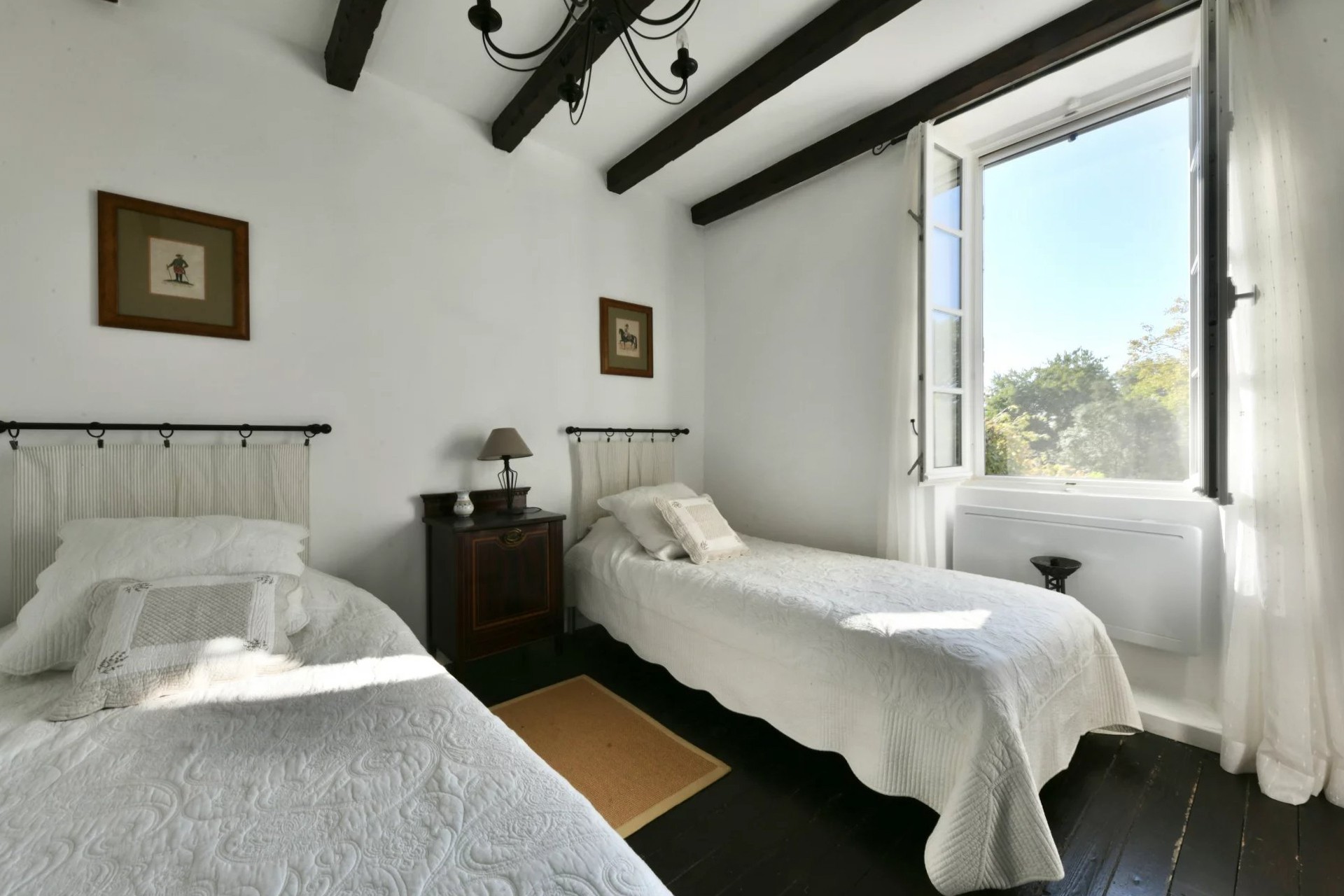 No primeiro andar, à esquerda do patamar, situa-se um quarto espaçoso com vista para o jardim e vigas de madeira à vista. Do lado oposto encontram-se um segundo quarto e uma elegante casa de banho com lavatório, banheira e WC.