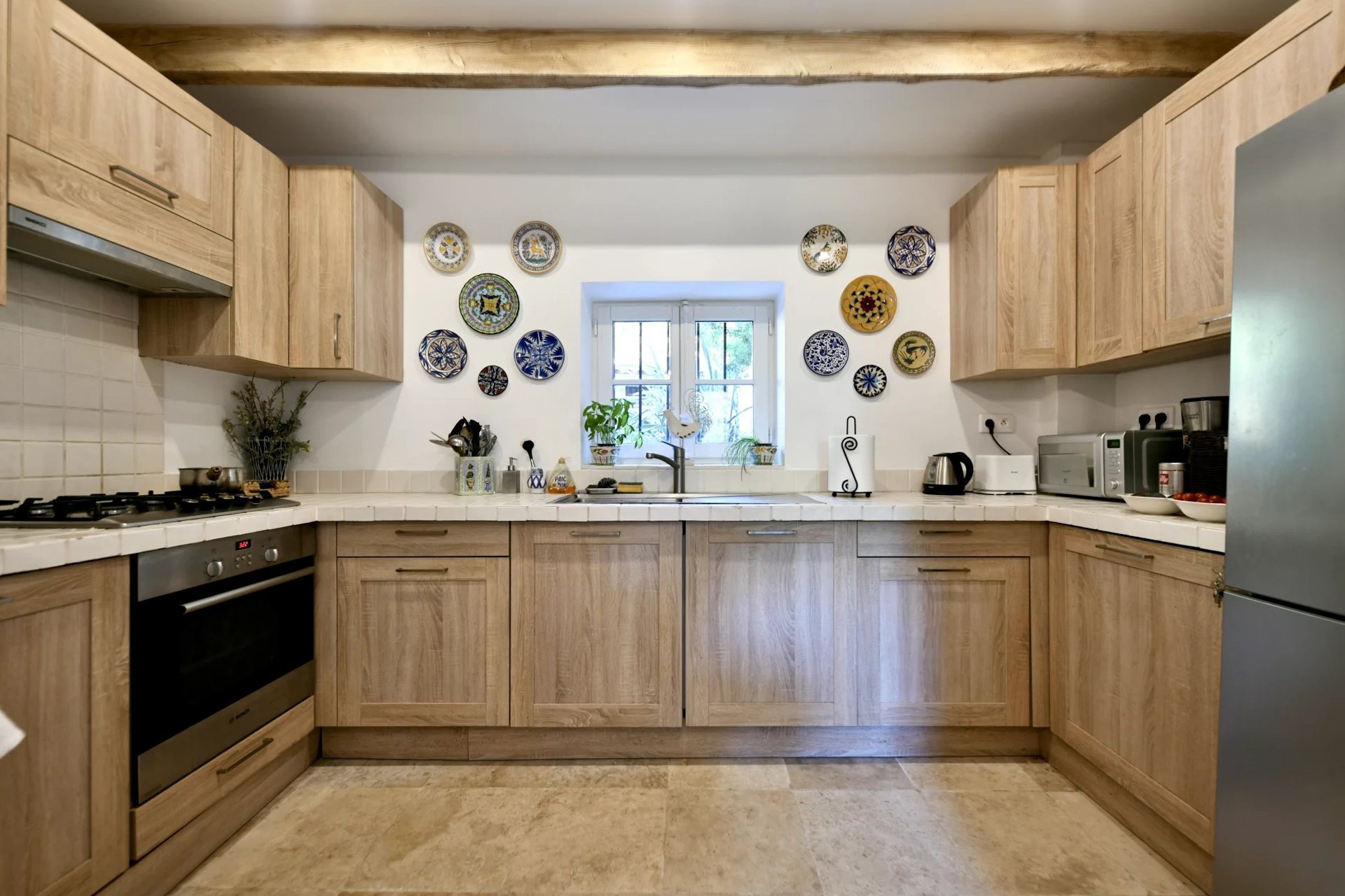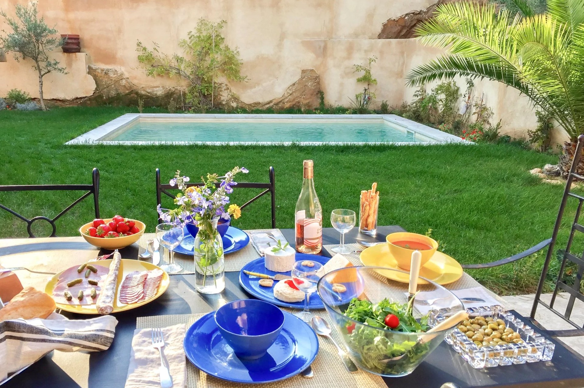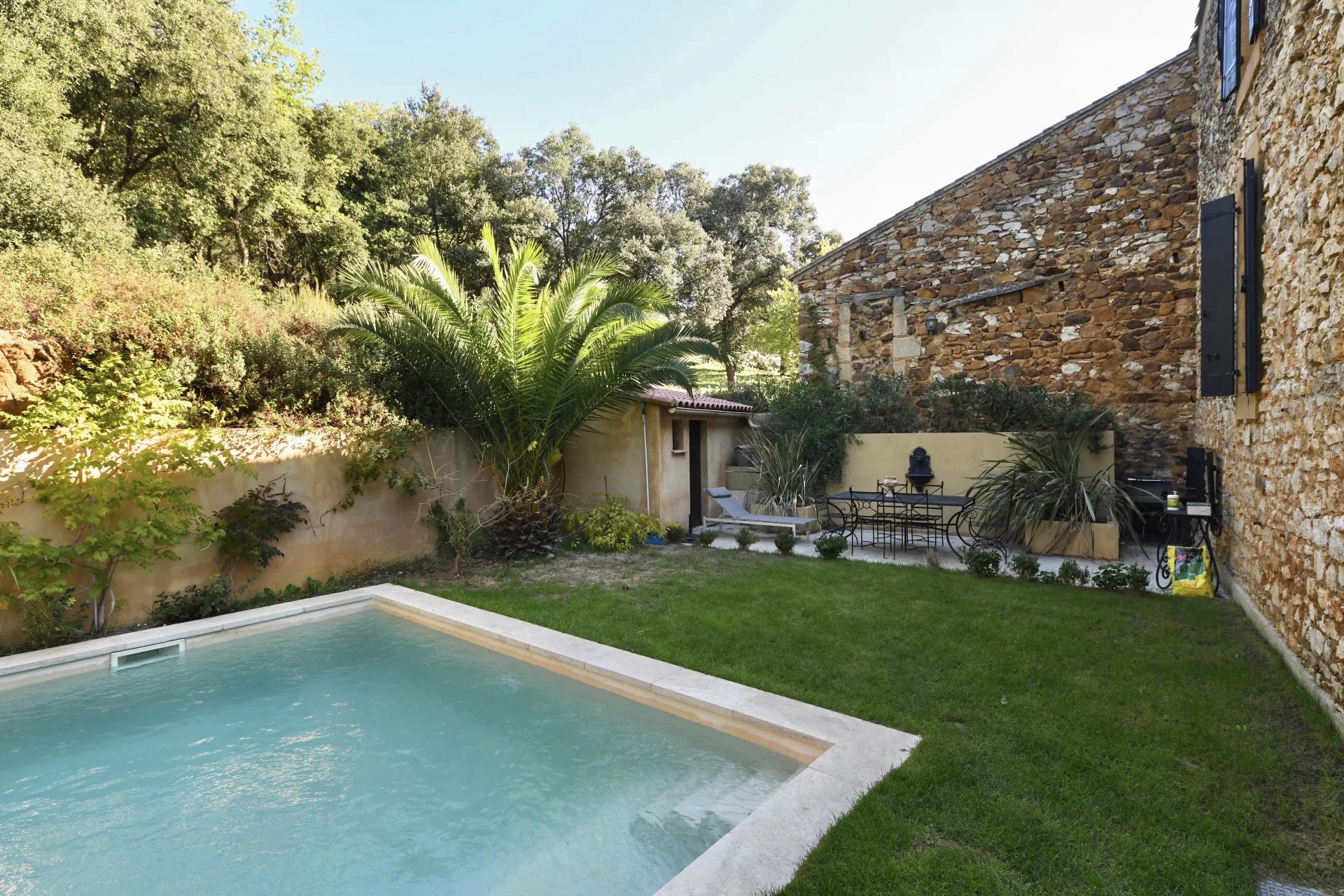 A chegada à propriedade através do jardim transmite imediatamente uma atmosfera tipicamente provençal. A fachada em pedra clara, as proporções equilibradas da casa e a vegetação mediterrânea criam um conjunto harmonioso que reflete o caráter da região.