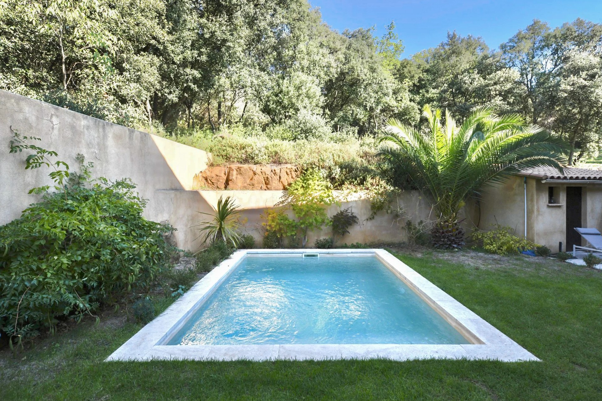 O jardim envolve a casa em três lados e inclui uma piscina voltada a sul (3,5 × 5 m, sistema de cloro). Uma área exterior de estar e de refeições oferece um espaço convidativo para desfrutar momentos relaxantes ao ar livre.