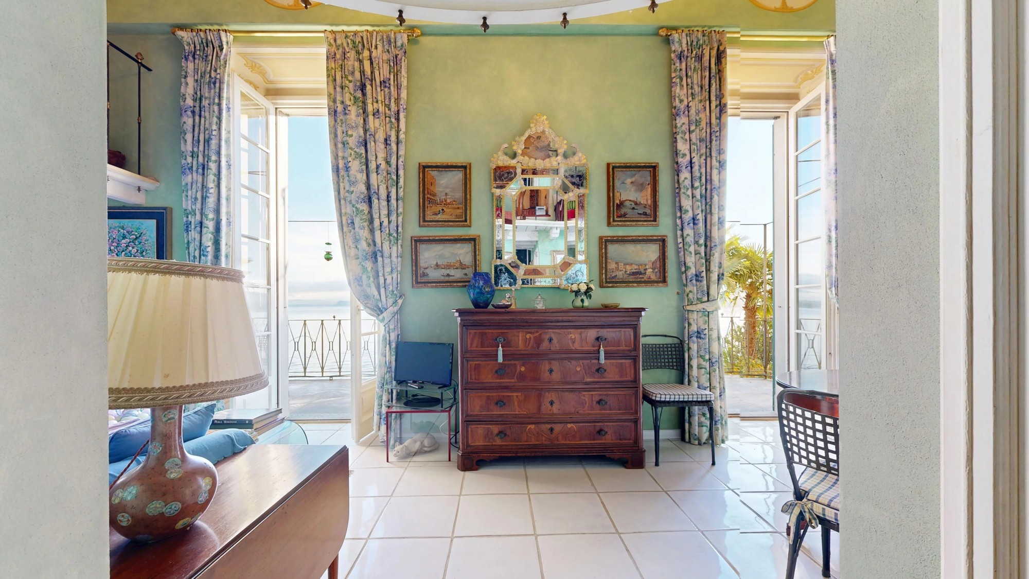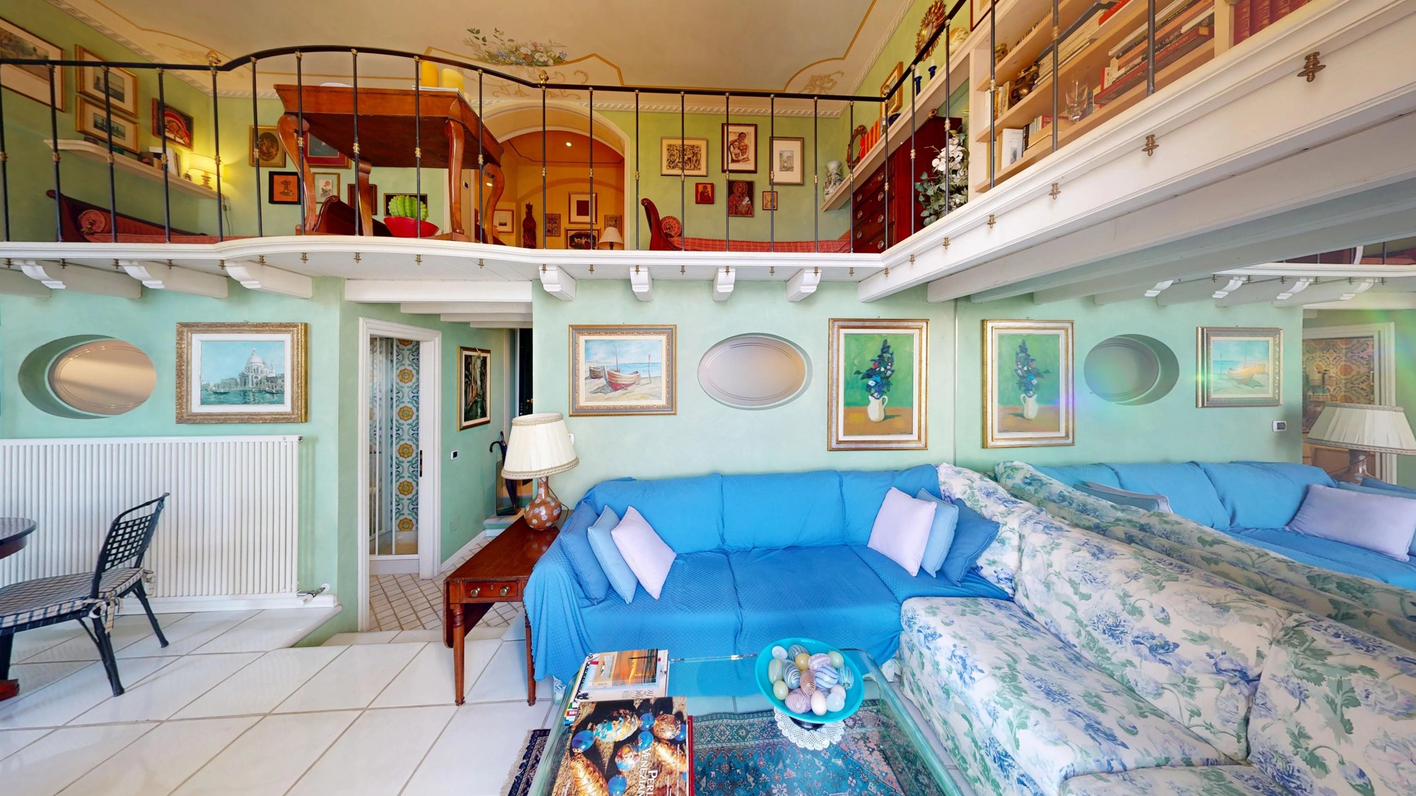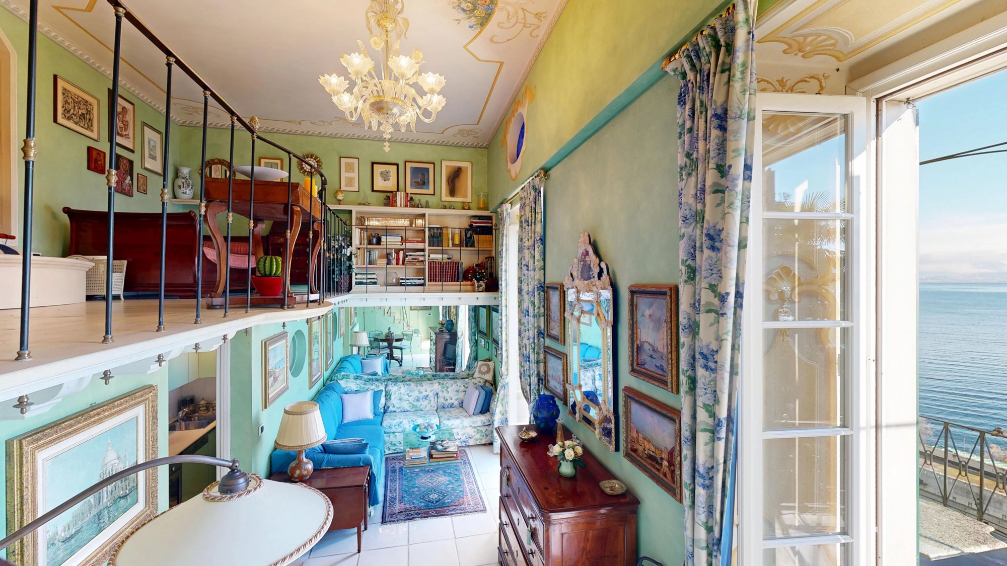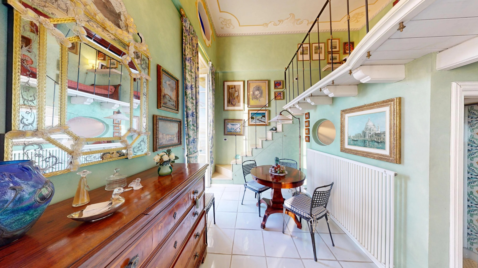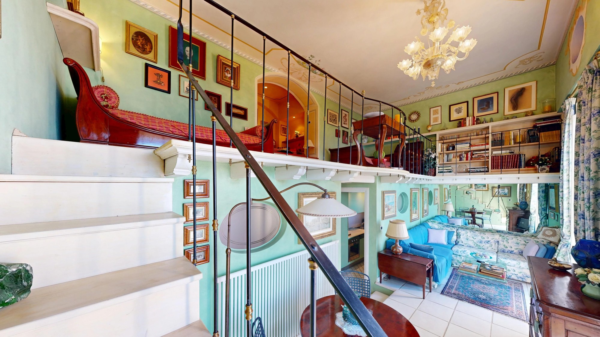 A área de estar no piso térreo abre-se para um grande terraço com vistas deslumbrantes do lago. Este piso inclui também uma kitchenette e um banheiro com cerâmica Vietri. O mezanino abriga a área de dormir com cama embutida e estante personalizada. Os tetos em tons pastel com afrescos e os detalhes em estuque ao estilo veneziano caracterizam o interior.