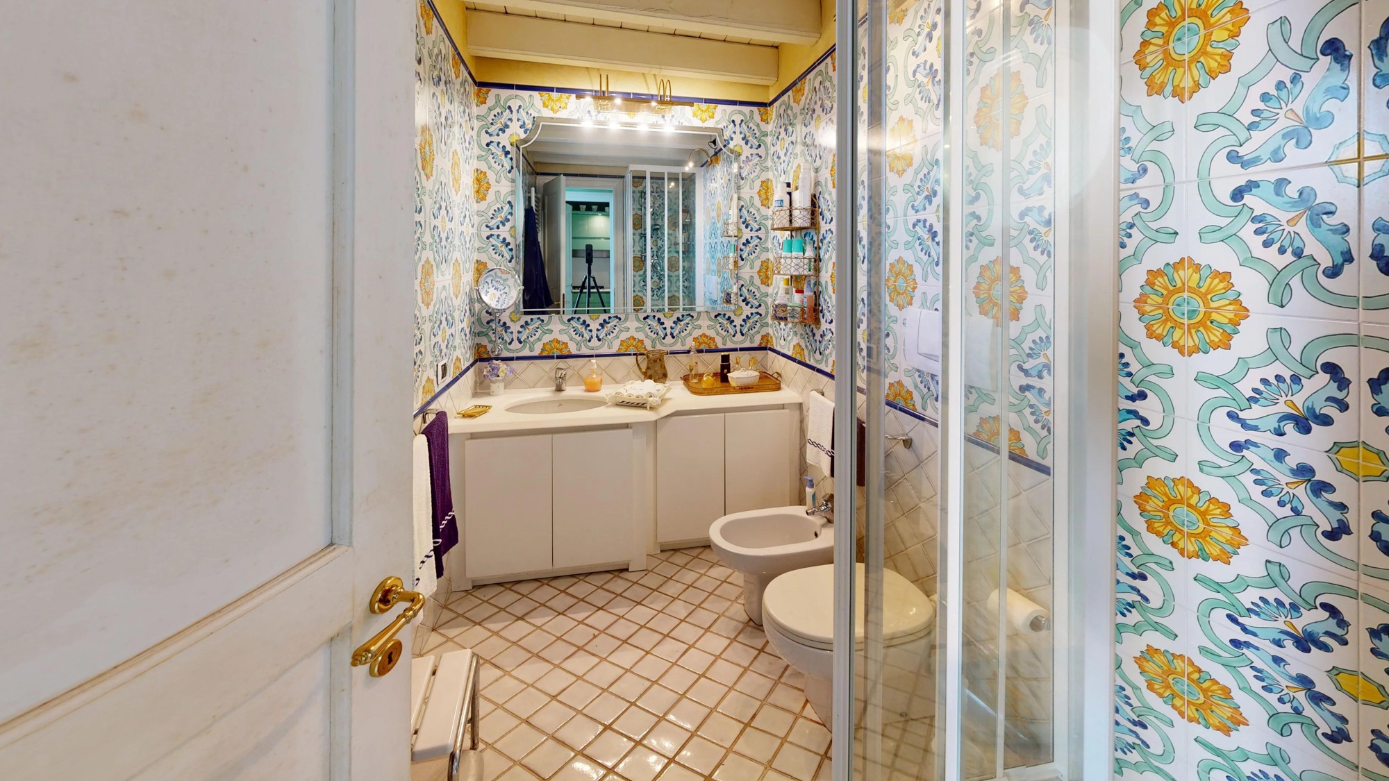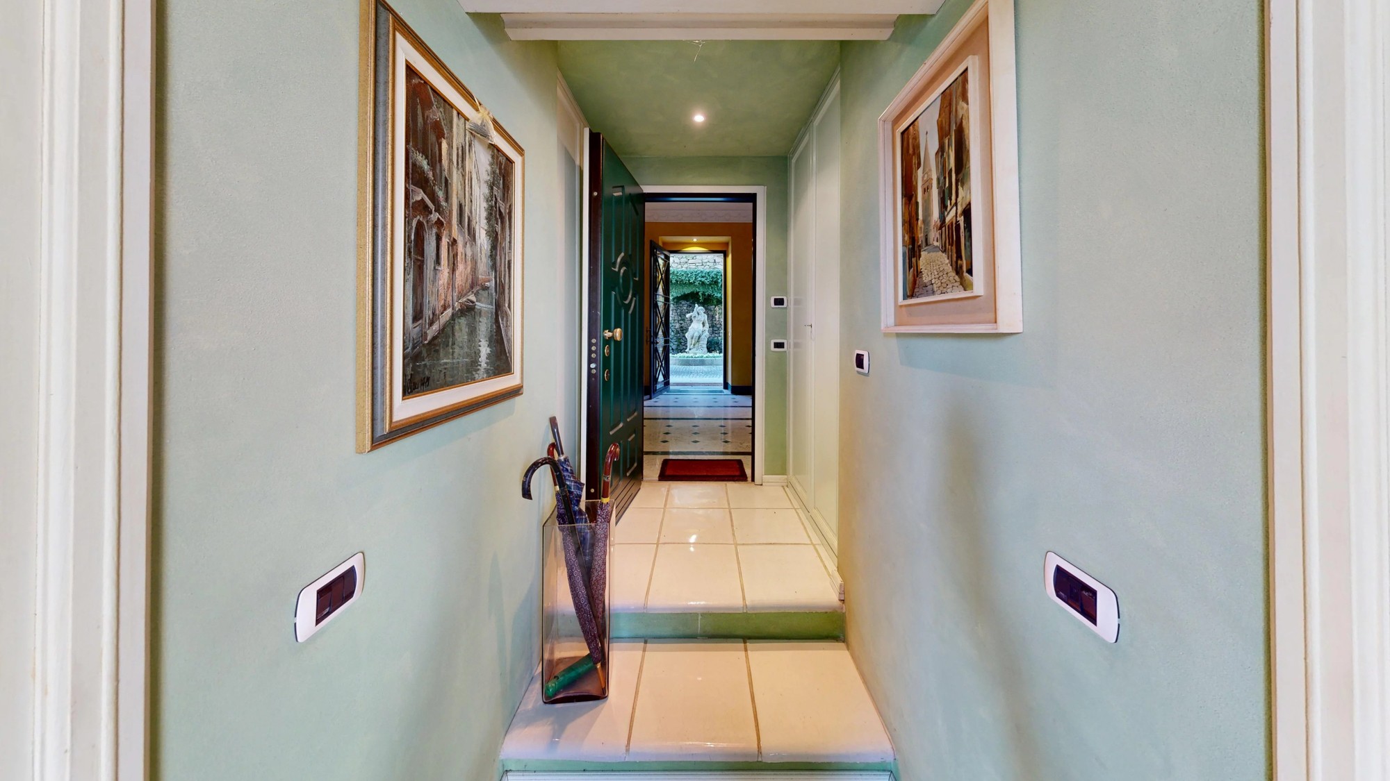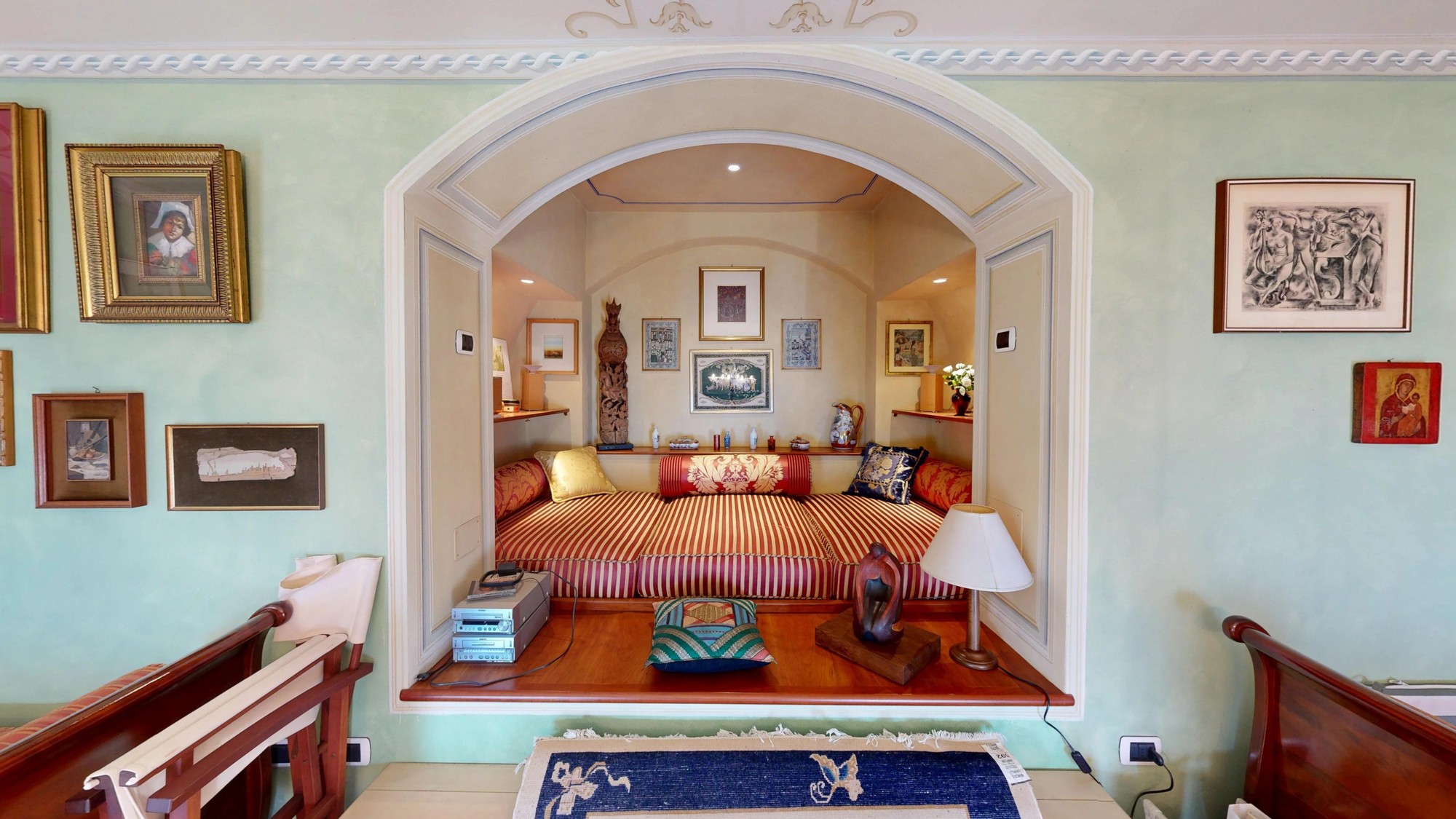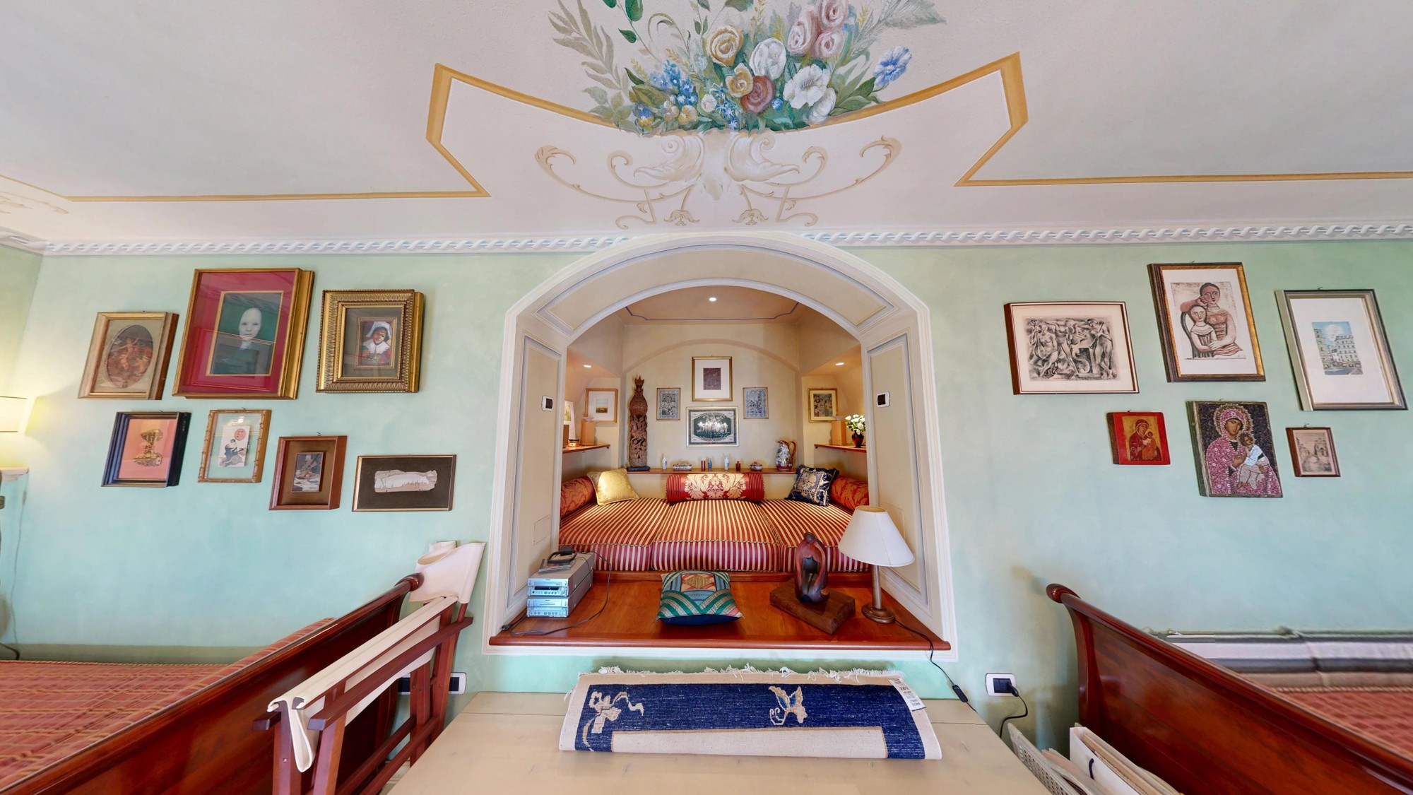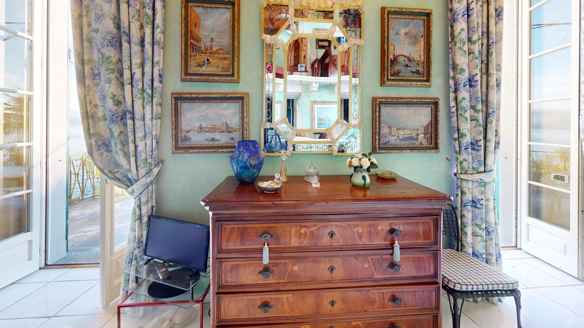 A área de estar no piso térreo abre-se para um grande terraço com vistas deslumbrantes do lago. Este piso inclui também uma kitchenette e um banheiro com cerâmica Vietri. O mezanino abriga a área de dormir com cama embutida e estante personalizada. Os tetos em tons pastel com afrescos e os detalhes em estuque ao estilo veneziano caracterizam o interior.