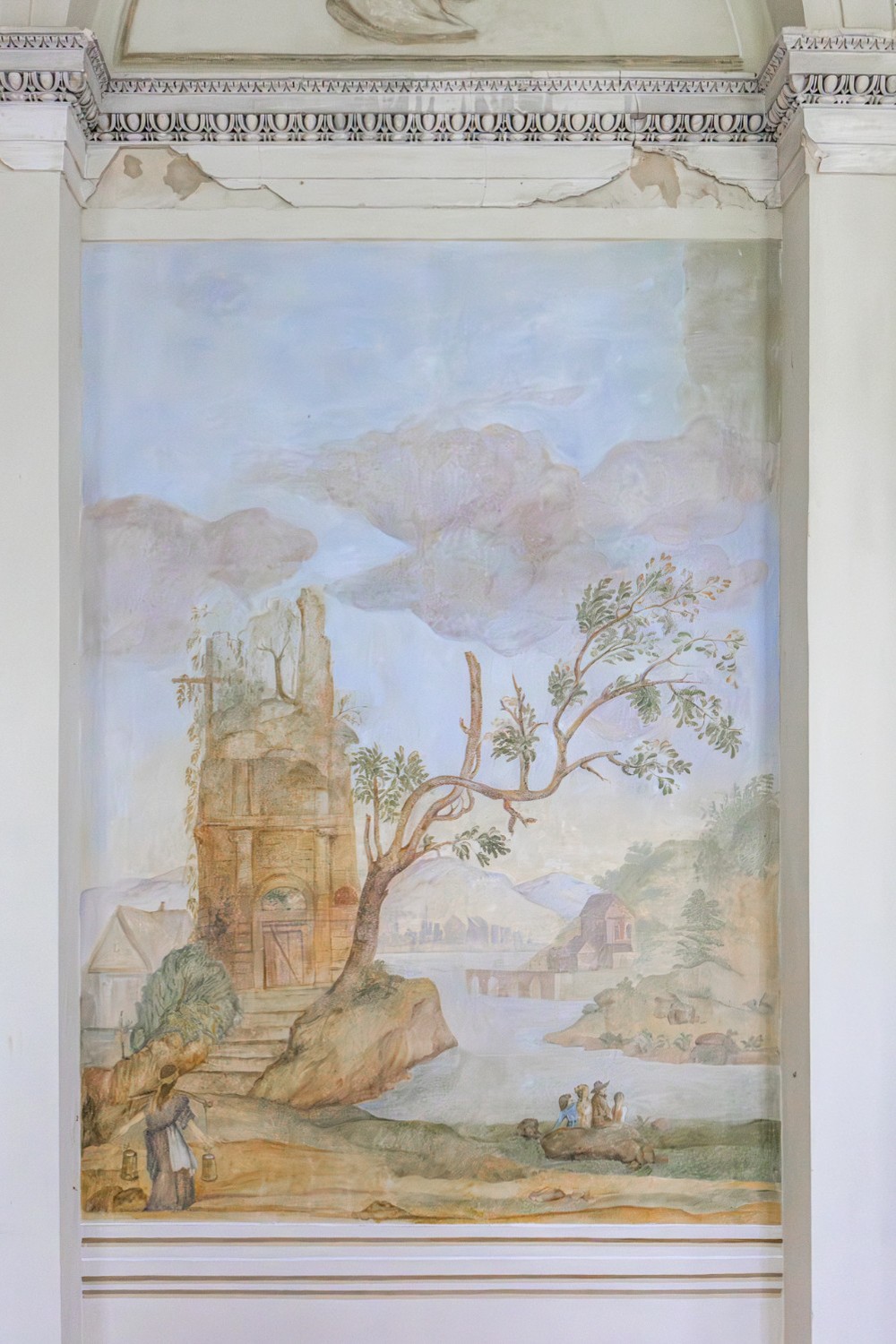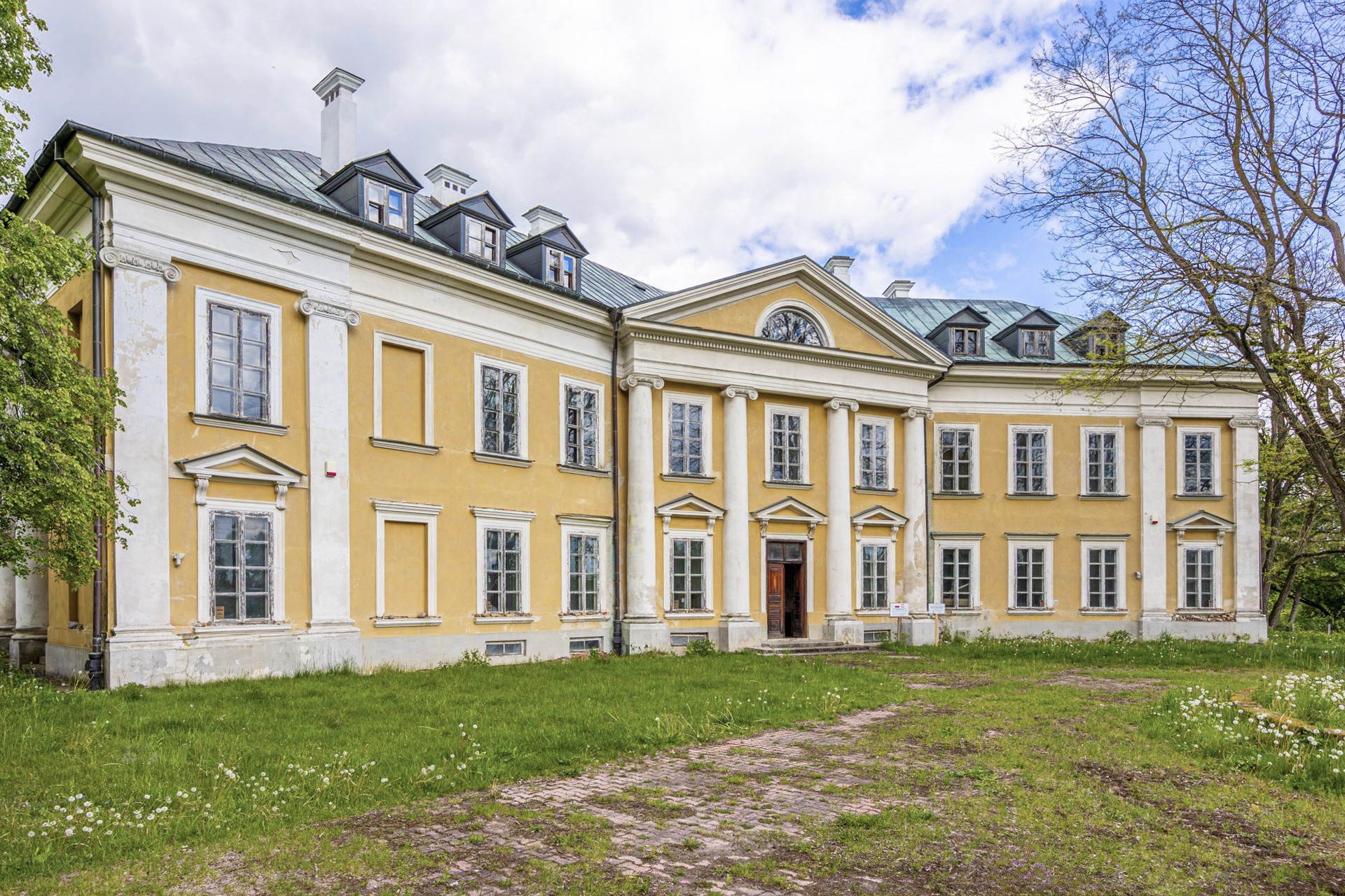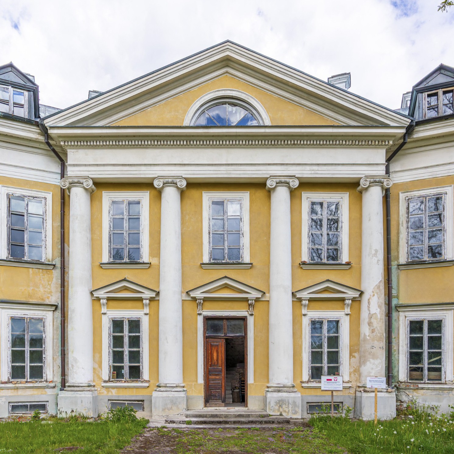 A entrada conduz a um amplo conjunto de divisões. No rés-do-chão situavam-se as áreas de estar e uma sala de jantar decorada com frescos al fresco que mostram vistas do Parque Łazienki de Varsóvia e um monumento ao rei João III Sobieski. Estes frescos ainda são visíveis, embora em estado frágil, e poderiam ser restaurados por especialistas em conservação artística.