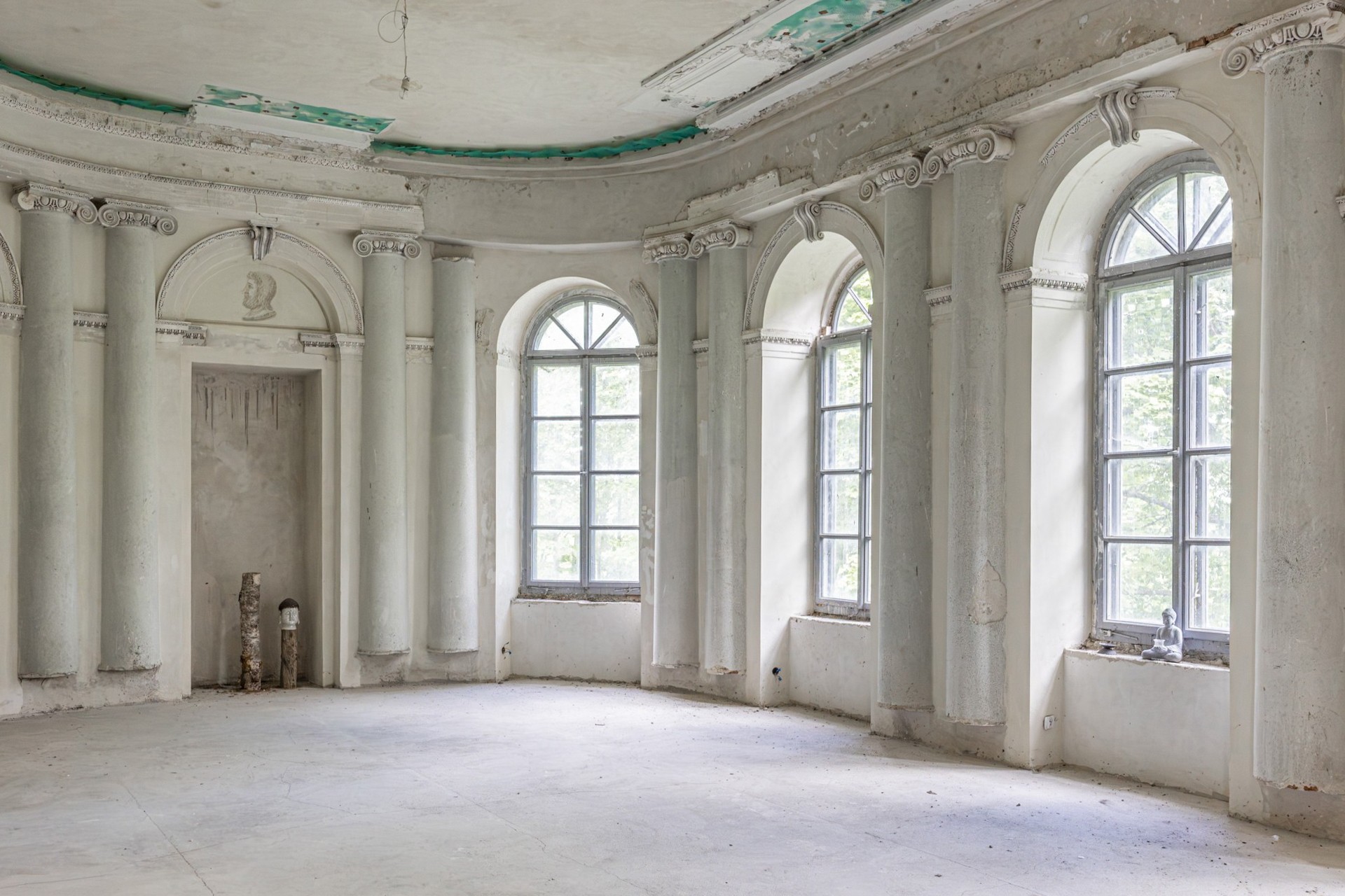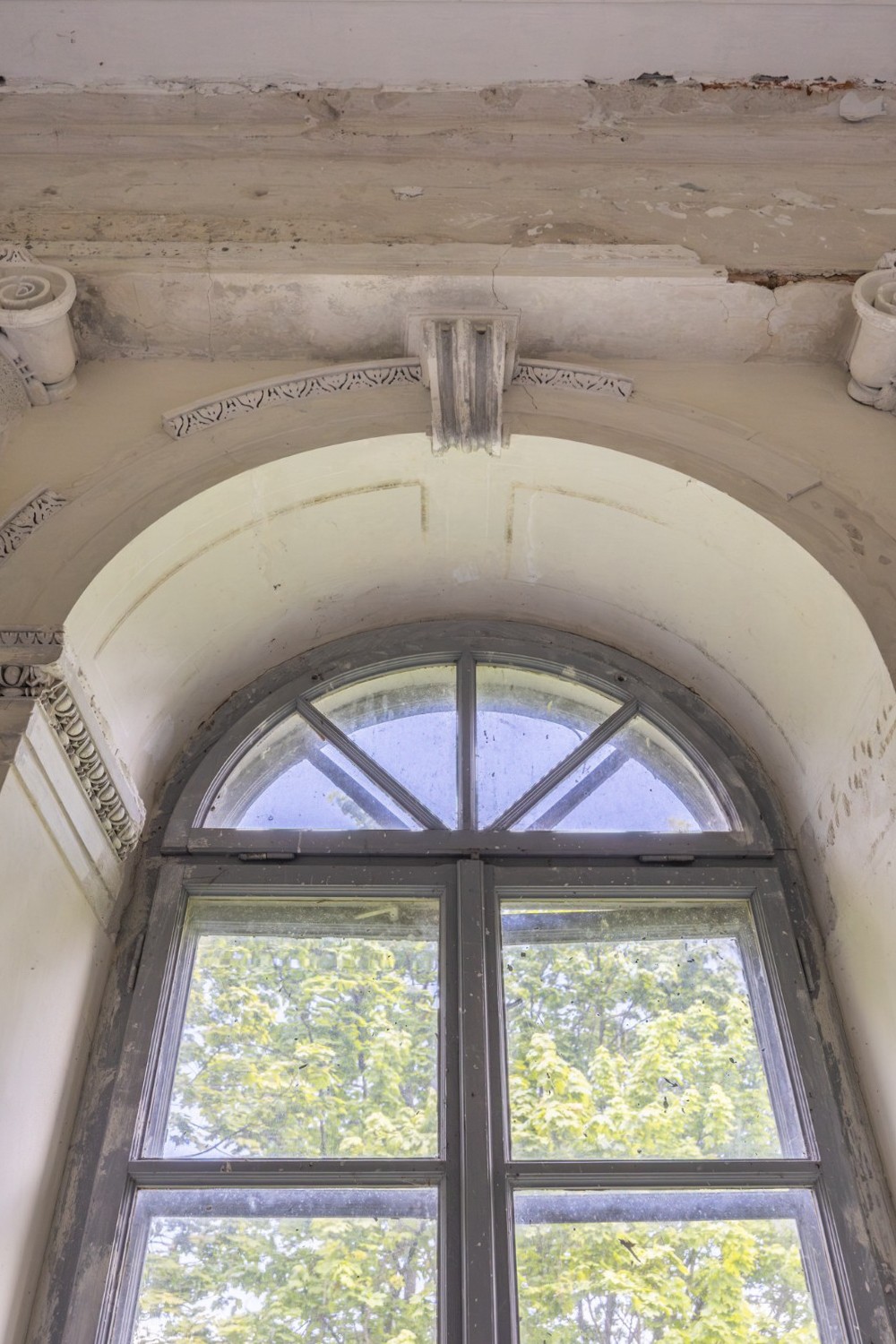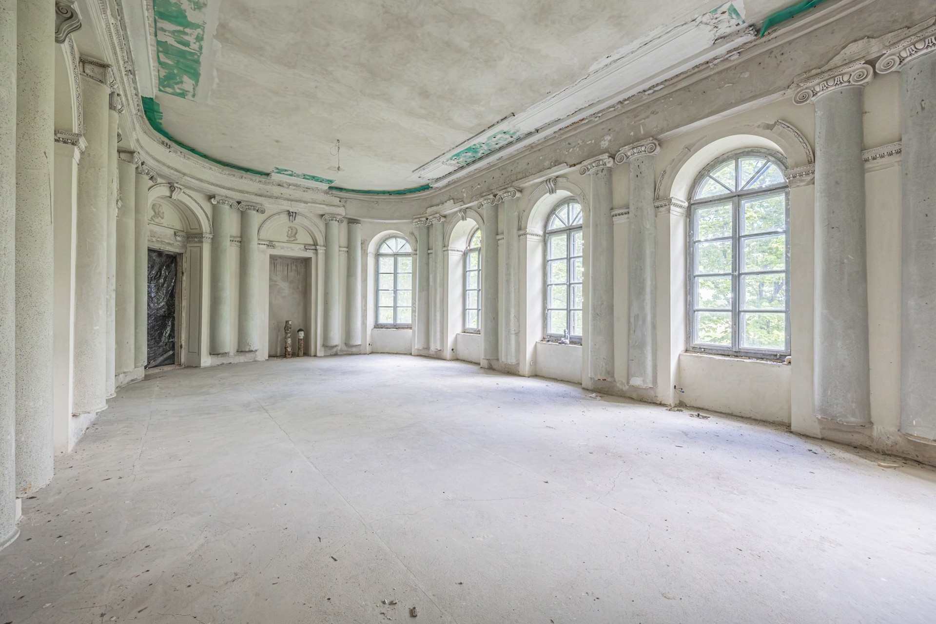 A entrada conduz a um amplo conjunto de divisões. No rés-do-chão situavam-se as áreas de estar e uma sala de jantar decorada com frescos al fresco que mostram vistas do Parque Łazienki de Varsóvia e um monumento ao rei João III Sobieski. Estes frescos ainda são visíveis, embora em estado frágil, e poderiam ser restaurados por especialistas em conservação artística.