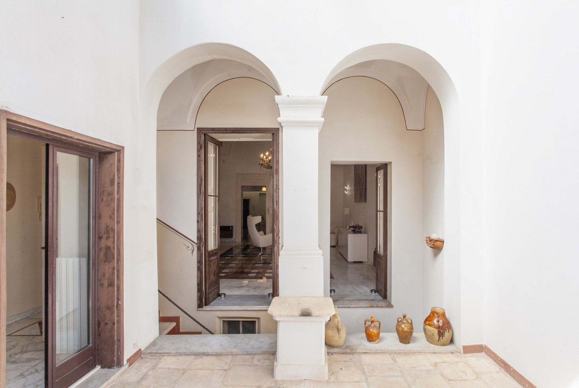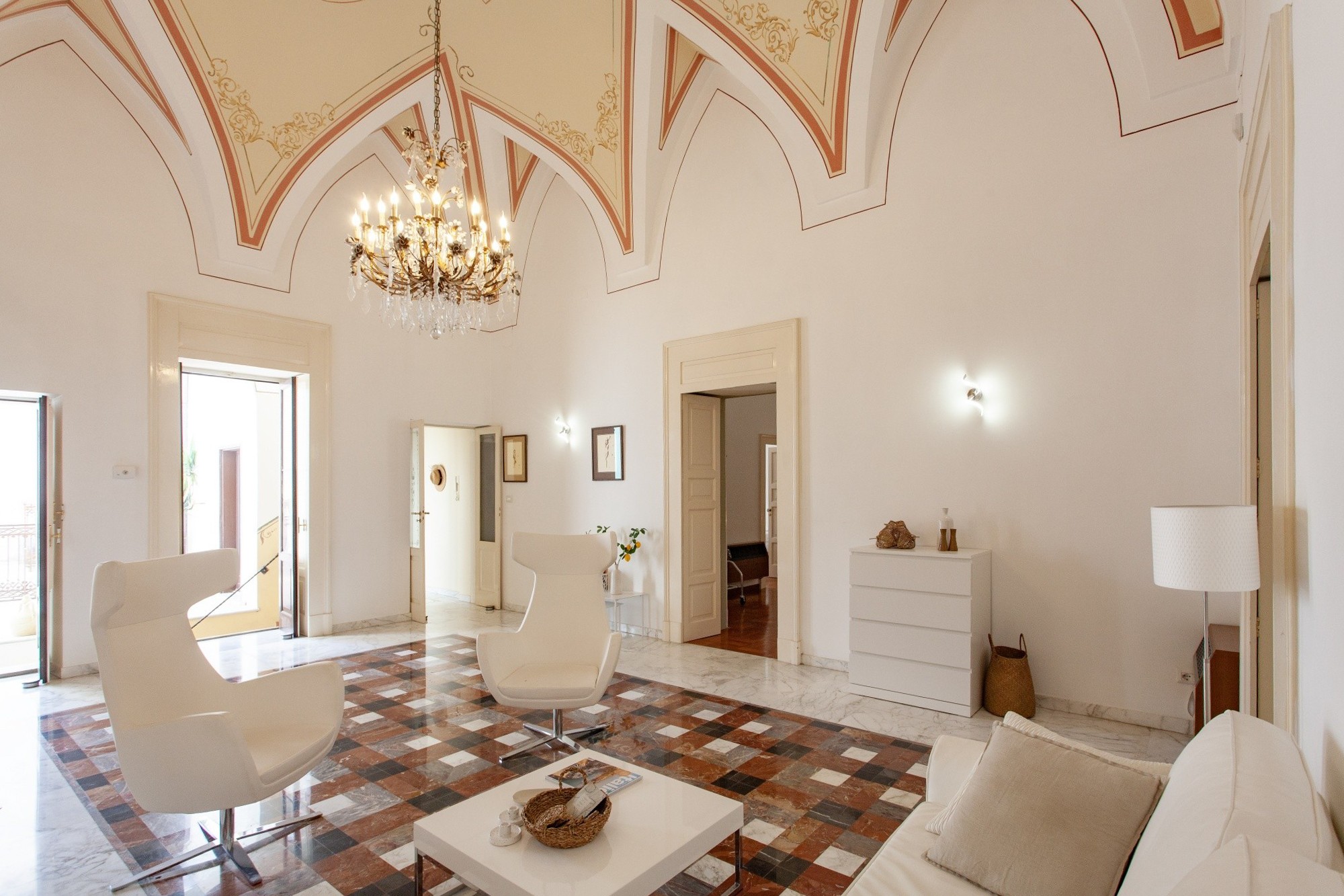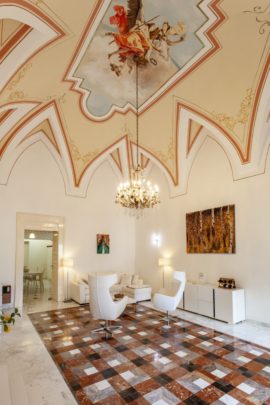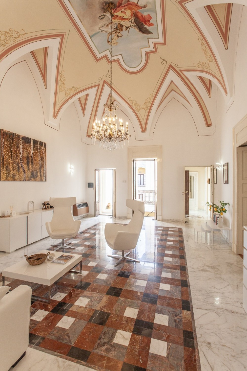 A residência principal situa-se no primeiro andar e tem 167 m² distribuídos num único nível. Os interiores preservam o carácter da arquitetura local, com abóbadas estreladas, de canhão e de luneta, algumas delicadamente decoradas com frescos. A mobília moderna e minimalista complementa os elementos históricos. Os pavimentos combinam mármore colorido e parquet.