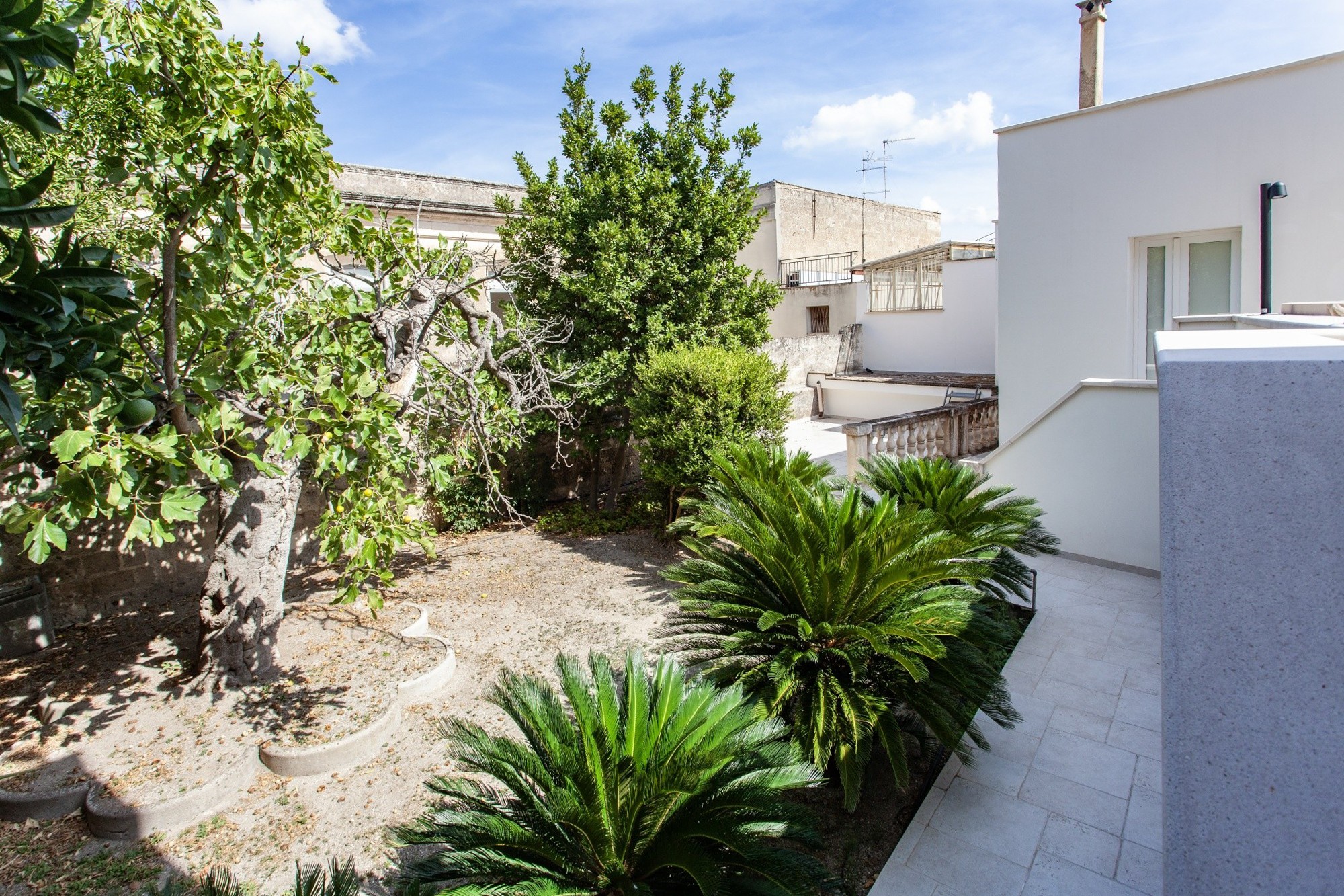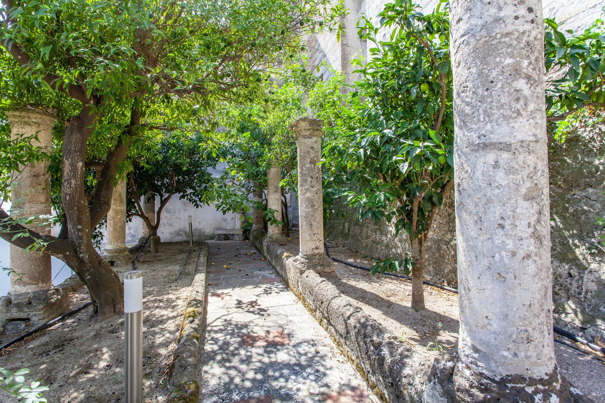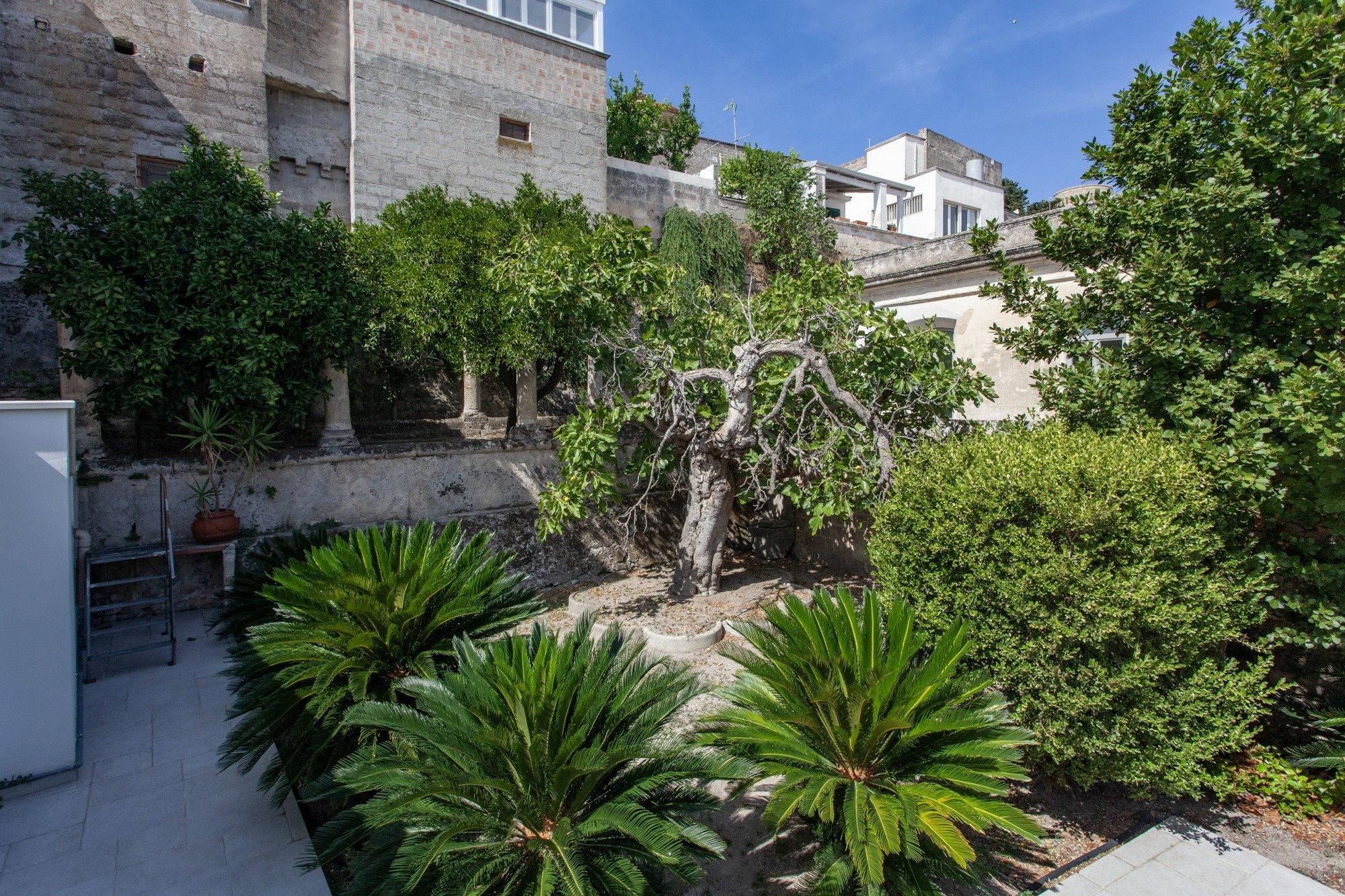 Uma escada conduz a uma área exterior privada de aproximadamente 265 m². Este espaço combina jardim e terraços com plantas mediterrânicas, incluindo palmeiras, citrinos e uma figueira de grande porte. A área oferece vistas panorâmicas sobre o castelo de Oria, a cúpula colorida da catedral e os telhados da cidade antiga. No jardim preserva-se um elemento histórico notável: uma secção da colunata do antigo convento dos Celestinos, que acrescenta prestígio à propriedade.