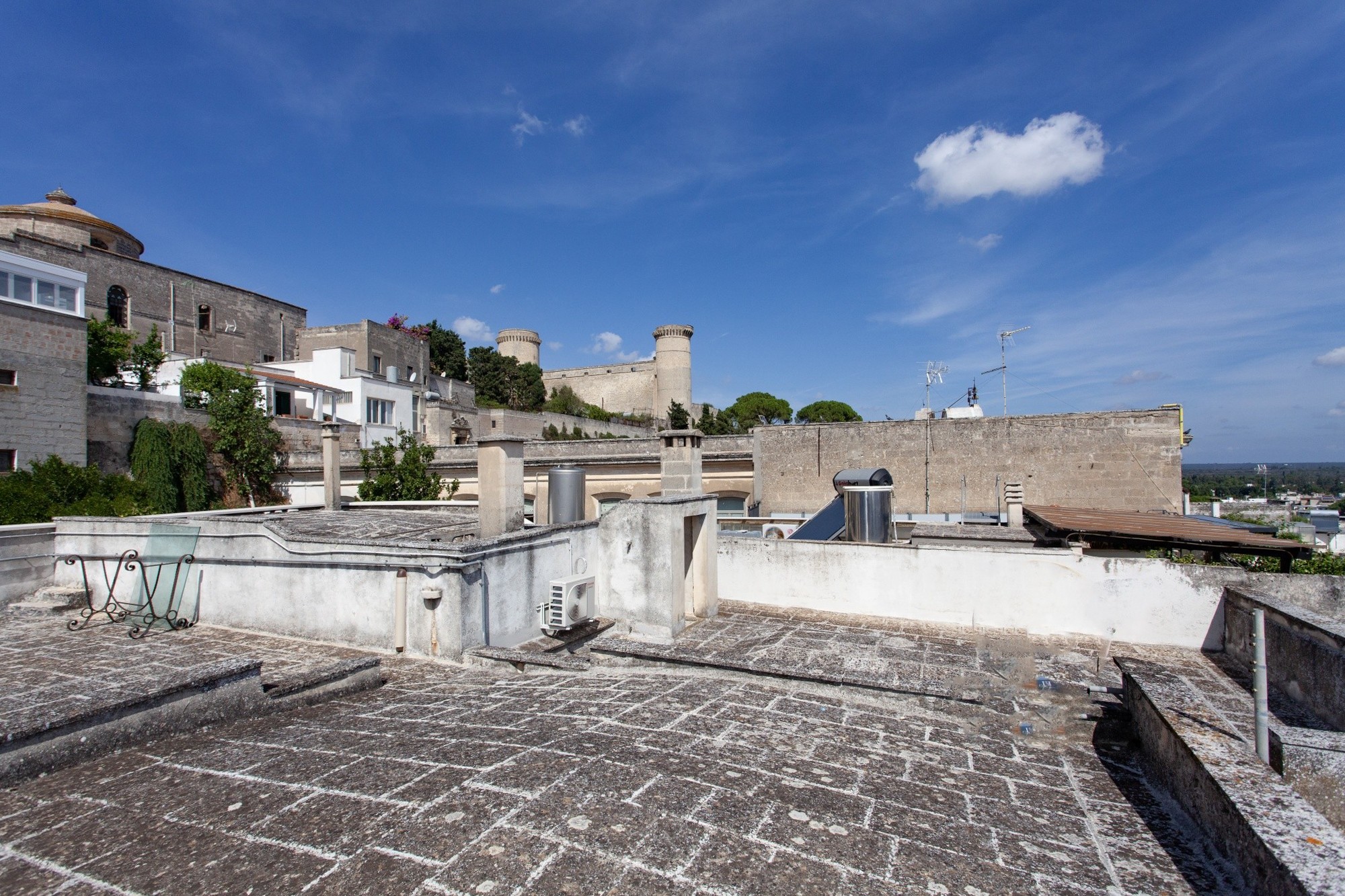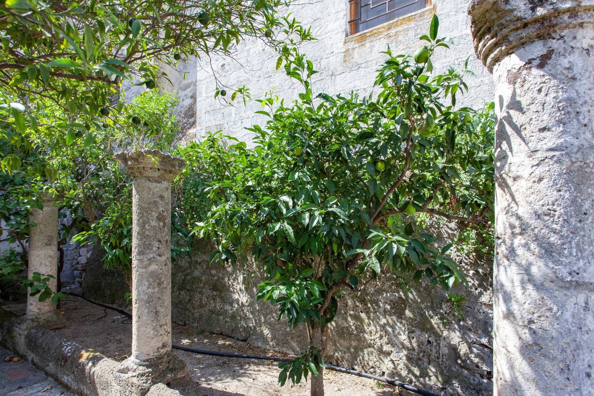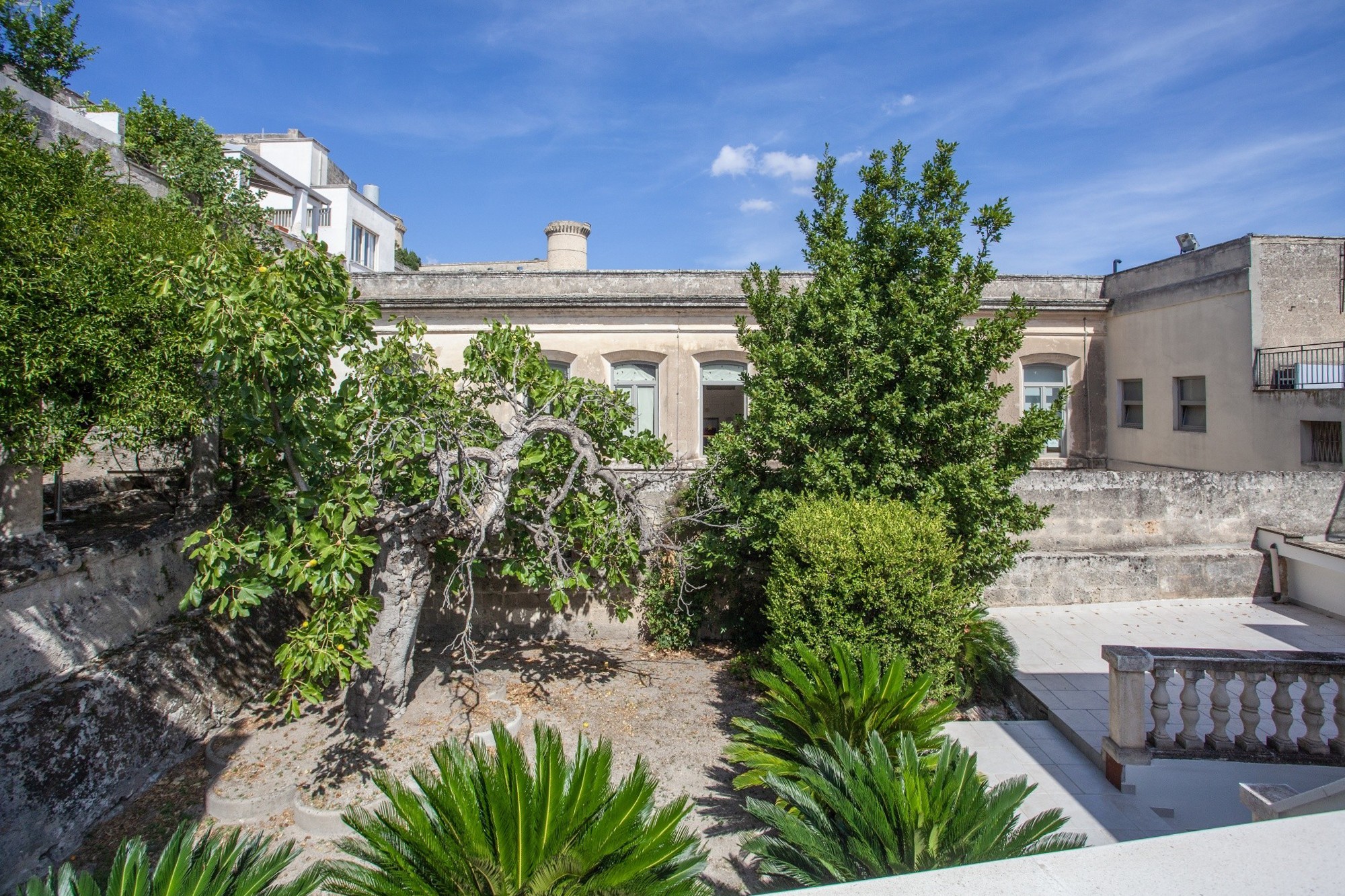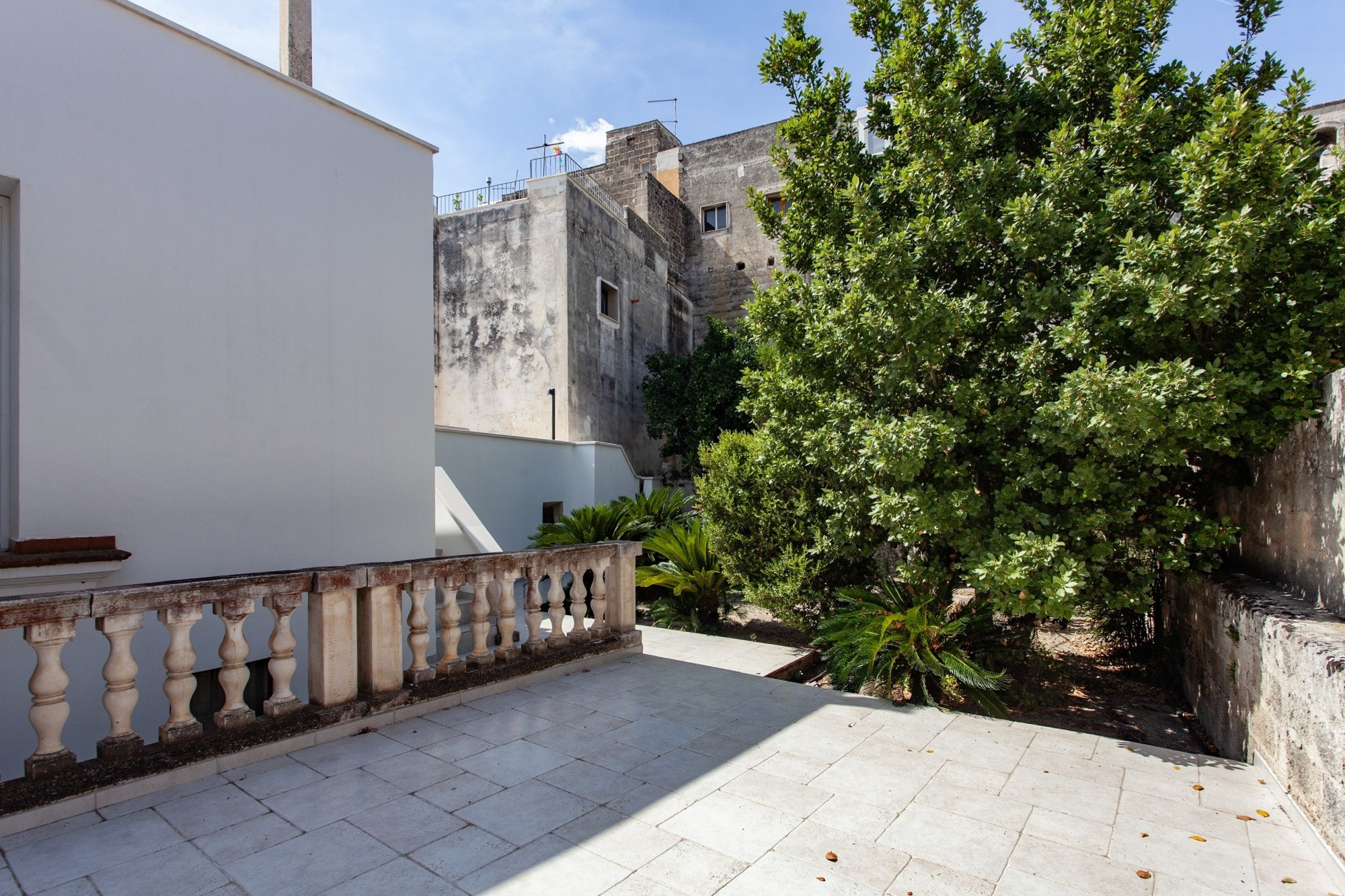 Uma escada conduz a uma área exterior privada de aproximadamente 265 m². Este espaço combina jardim e terraços com plantas mediterrânicas, incluindo palmeiras, citrinos e uma figueira de grande porte. A área oferece vistas panorâmicas sobre o castelo de Oria, a cúpula colorida da catedral e os telhados da cidade antiga. No jardim preserva-se um elemento histórico notável: uma secção da colunata do antigo convento dos Celestinos, que acrescenta prestígio à propriedade.