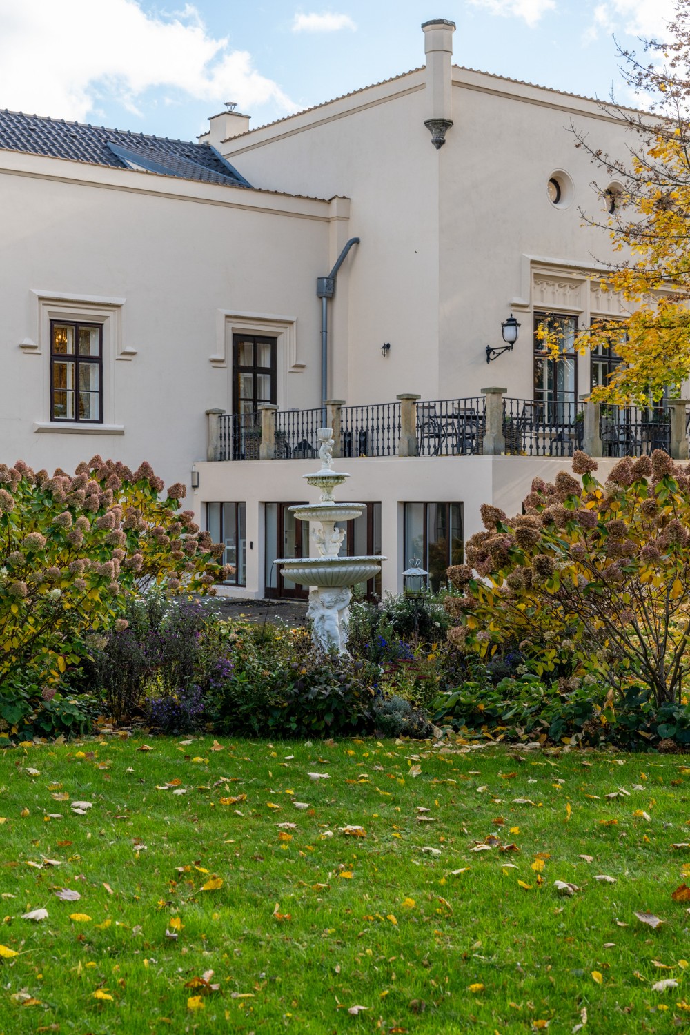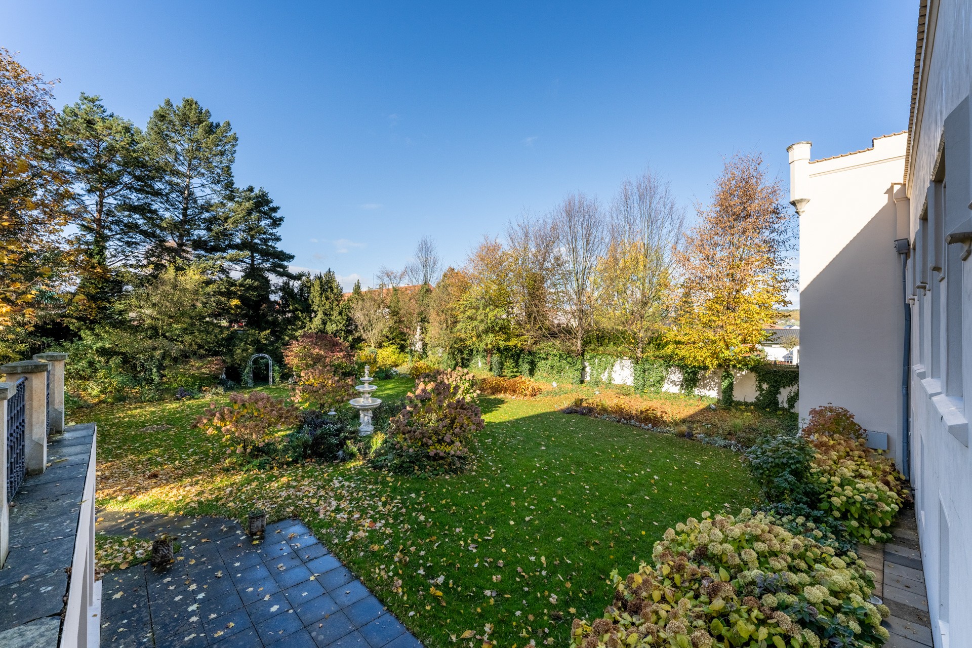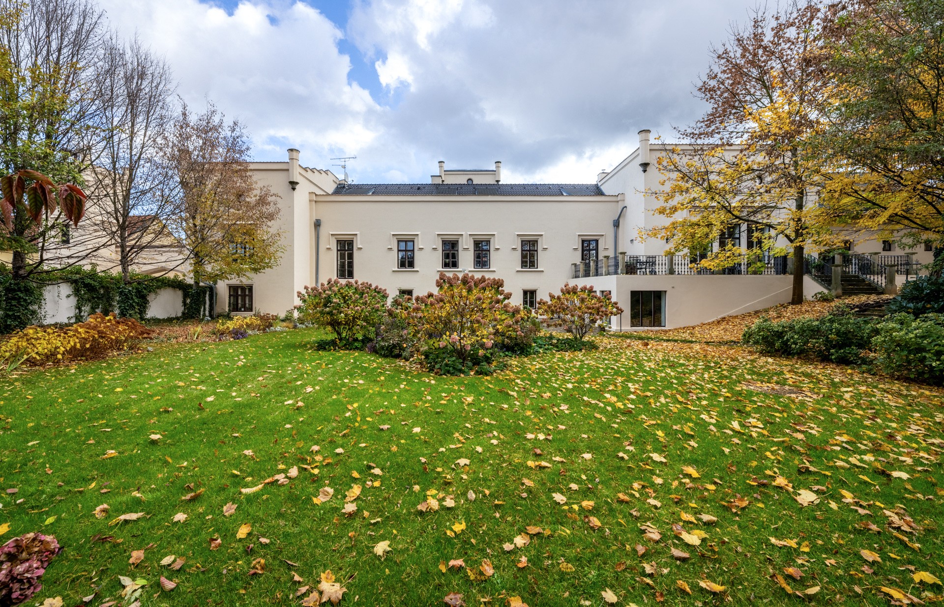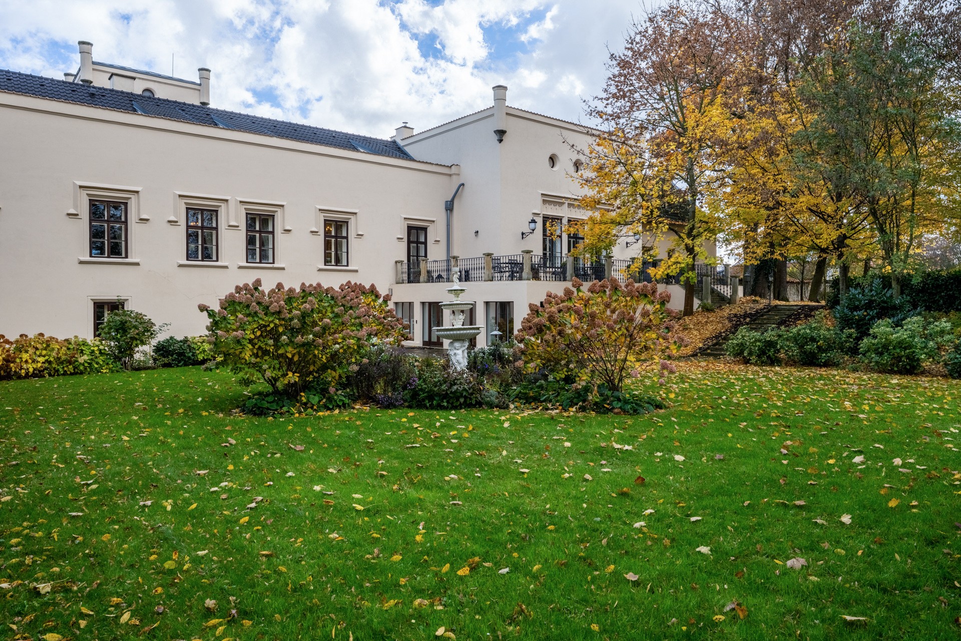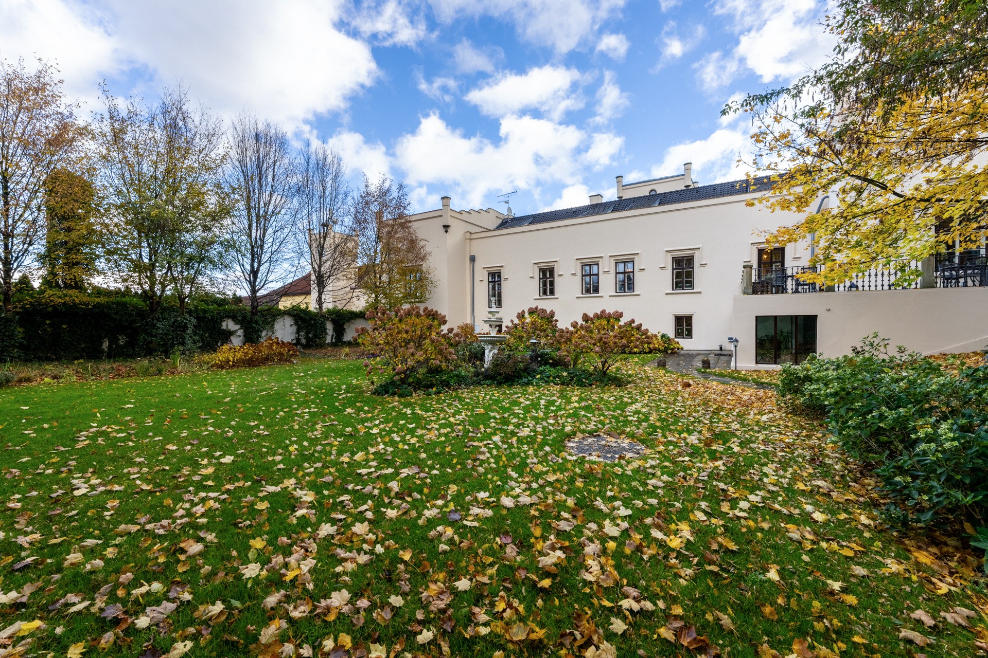 O coração desta magnífica residência, com uma área útil de 1.585 m², apresenta um salão principal nobre com lareira, criando uma atmosfera majestosa e acolhedora, ideal para encontros familiares e sociais. O salão liga-se a um terraço que se prolonga suavemente até ao jardim do castelo (4.253 m²), com lago (1.536 m²), gazebo e fonte. O jardim está dividido em duas partes: a primeira, em estilo inglês romântico, cujo aparente arranjo aleatório das plantas é, na realidade, uma composição cuidadosamente planeada; a segunda, concebida em estilo francês formal e simétrico, transmitindo elegância e ordem.