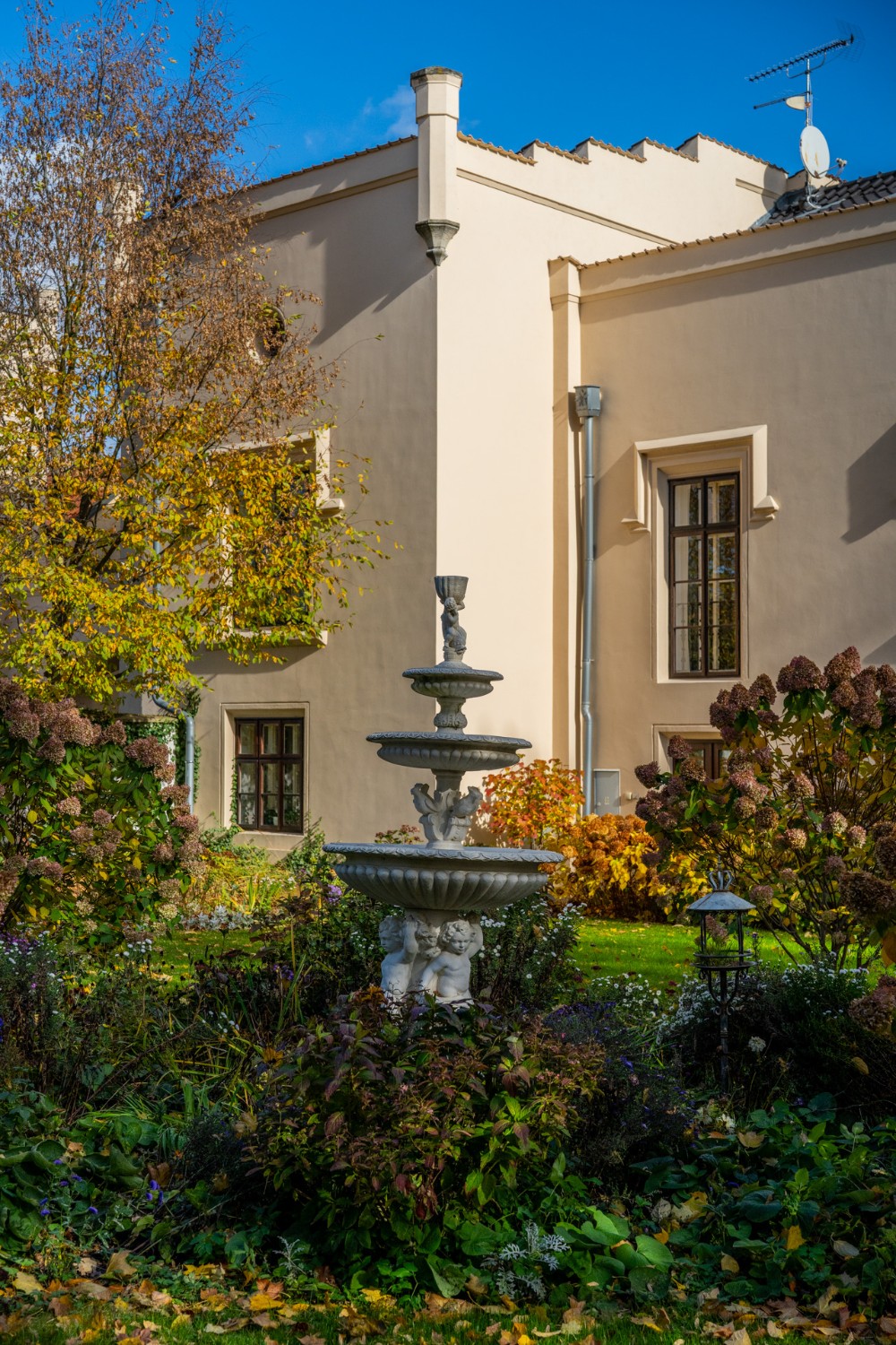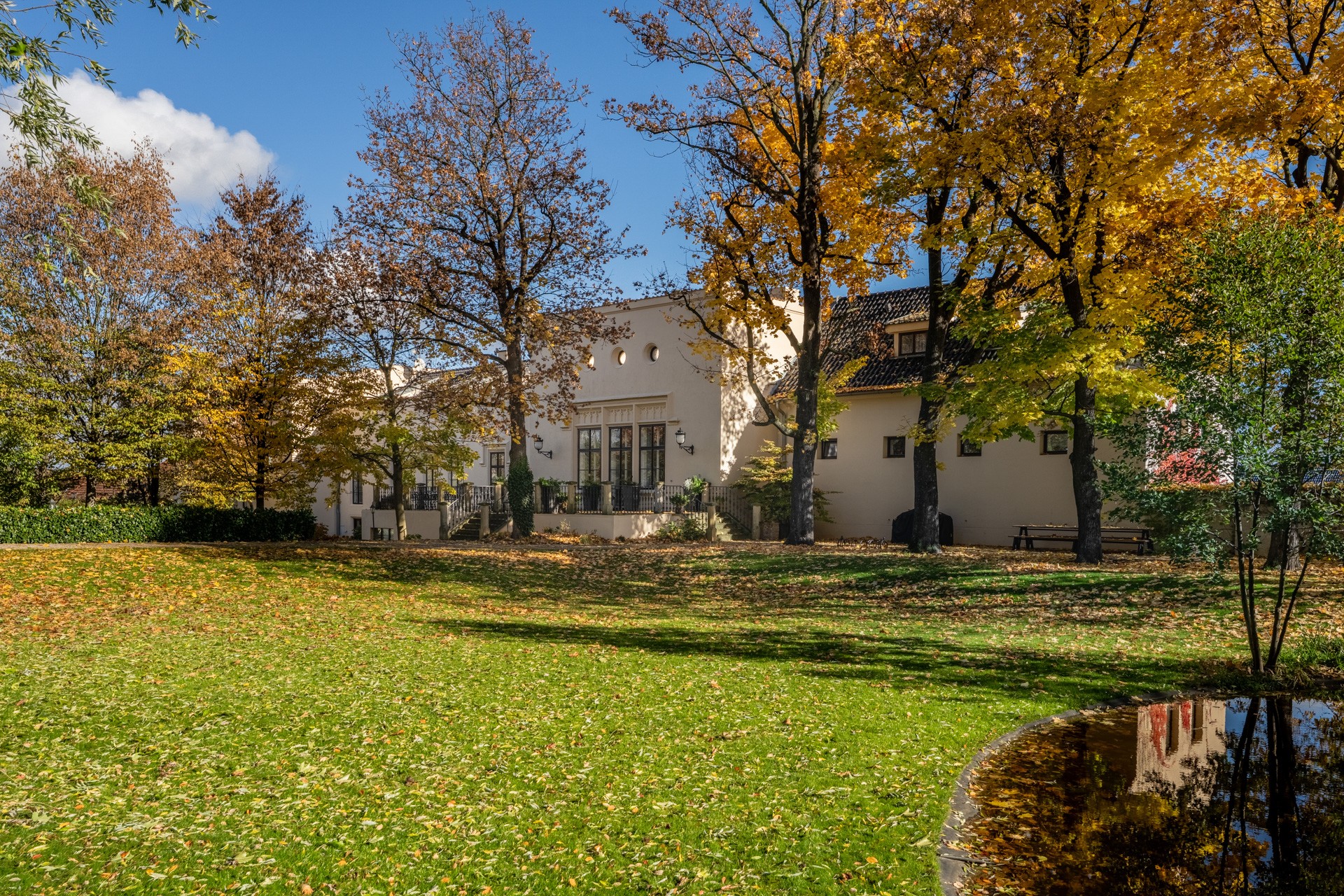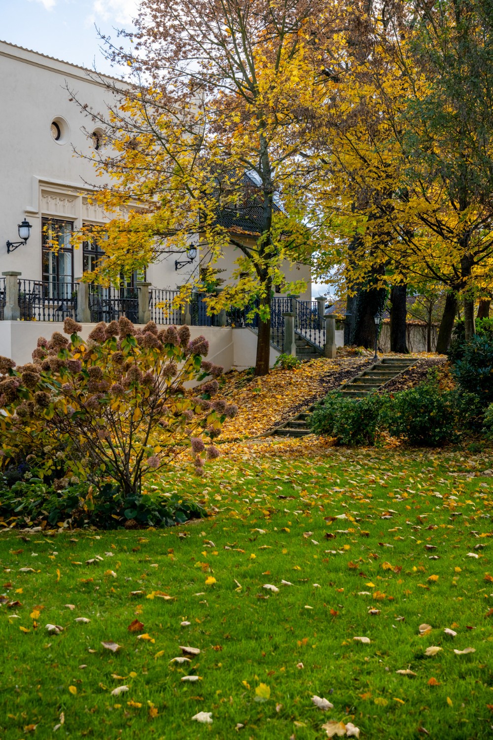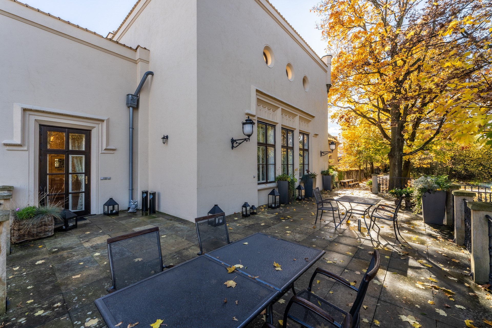 O coração desta magnífica residência, com uma área útil de 1.585 m², apresenta um salão principal nobre com lareira, criando uma atmosfera majestosa e acolhedora, ideal para encontros familiares e sociais. O salão liga-se a um terraço que se prolonga suavemente até ao jardim do castelo (4.253 m²), com lago (1.536 m²), gazebo e fonte. O jardim está dividido em duas partes: a primeira, em estilo inglês romântico, cujo aparente arranjo aleatório das plantas é, na realidade, uma composição cuidadosamente planeada; a segunda, concebida em estilo francês formal e simétrico, transmitindo elegância e ordem.