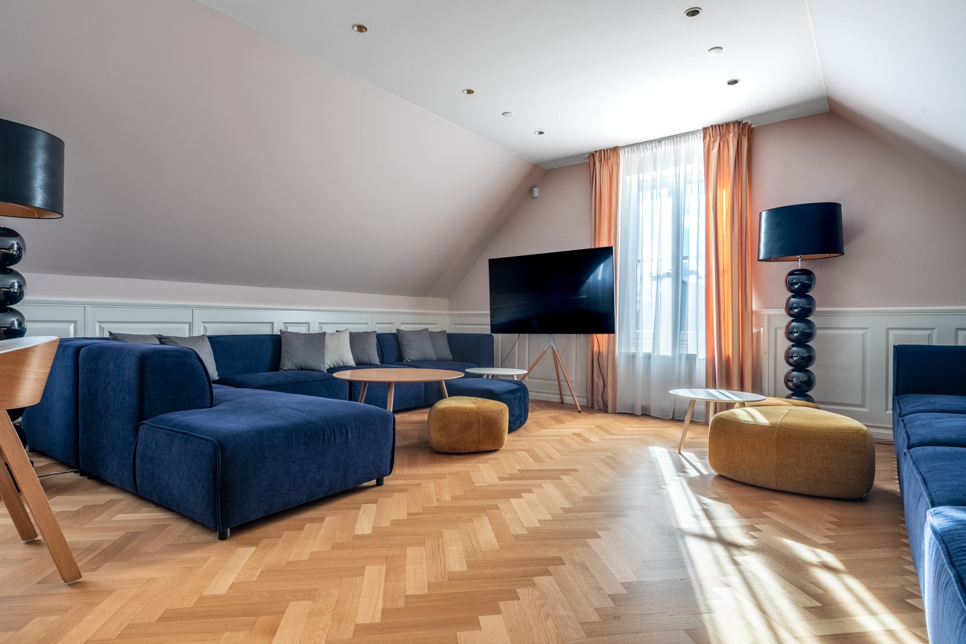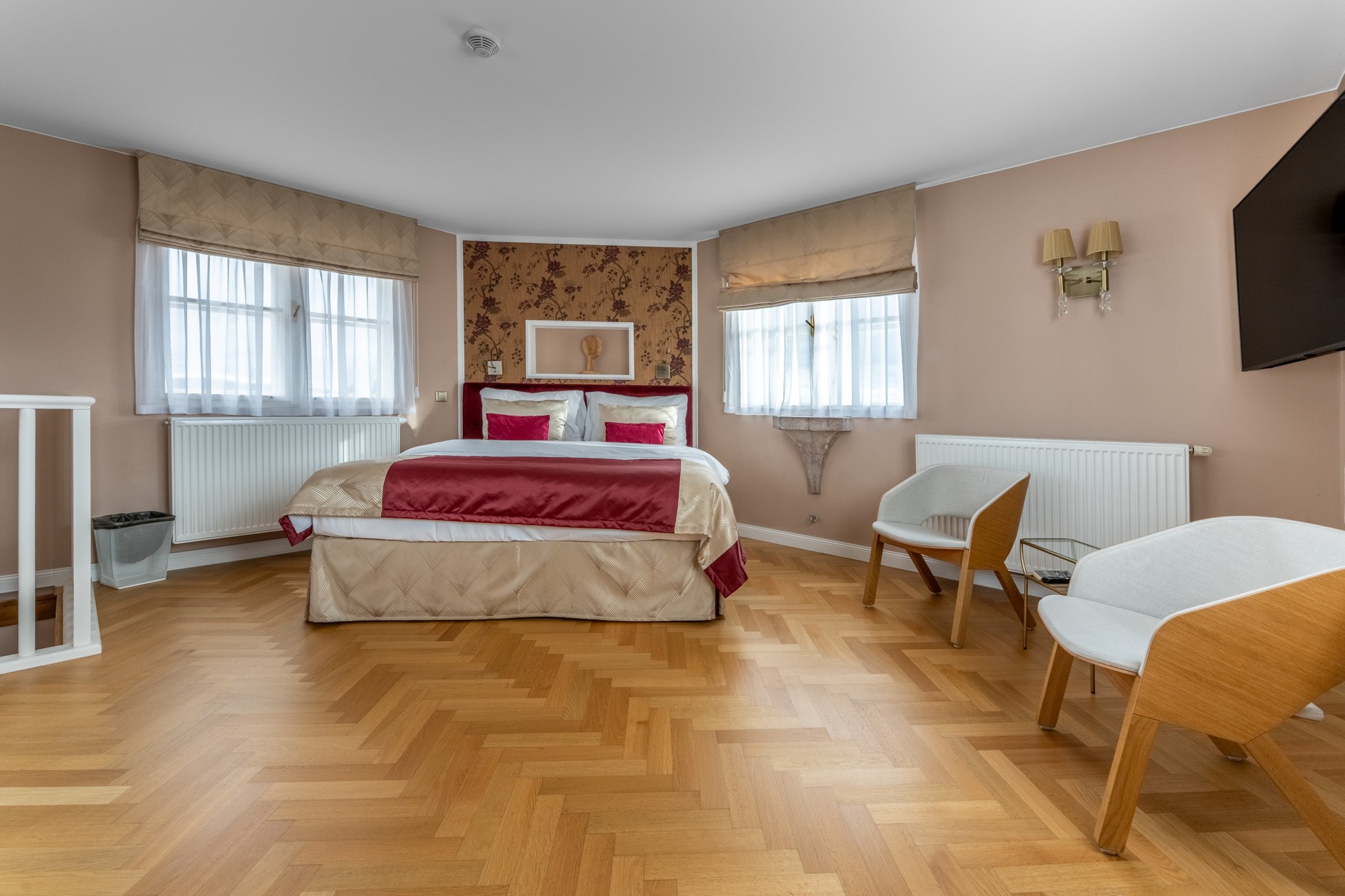 No rés-do-chão do castelo encontra-se o apartamento privado dos proprietários, com casas de banho, escritório, bar, adega e a clássica biblioteca do castelo, sala de jantar e outras dependências utilitárias. O castelo possui duas cozinhas independentes equipadas para operações gastronómicas profissionais. Nos pisos superiores há dois salões e salas de jantar, quartos com casas de banho privativas (capacidade total de alojamento de 22 pessoas em 10 quartos), espaços de bem-estar no terraço com jacuzzi para 4 a 6 pessoas, sauna para 6 a 8 pessoas, sala de massagens com duas camas e piscina interior aquecida (no rés-do-chão). Estacionamento disponível na garagem (4 carros), no terreno (mínimo de 8 lugares) ou no parque junto à igreja de Trnová, nas proximidades (15 lugares).