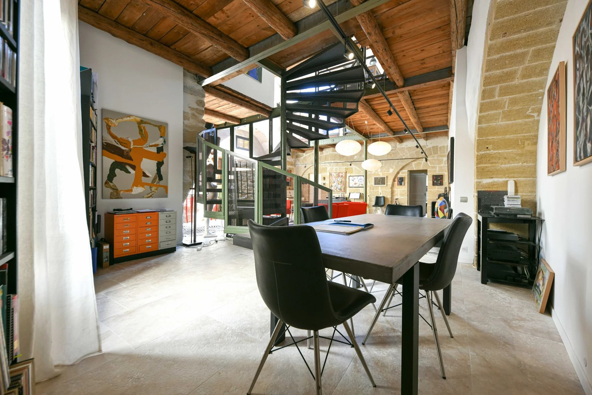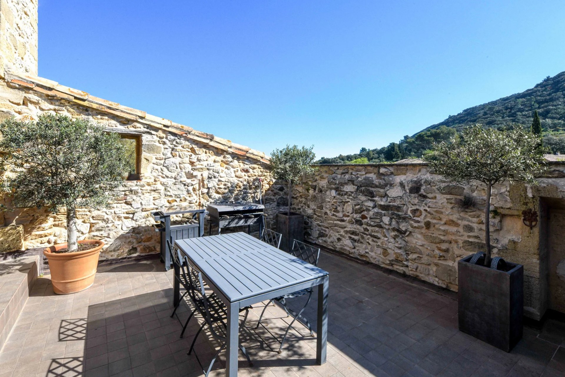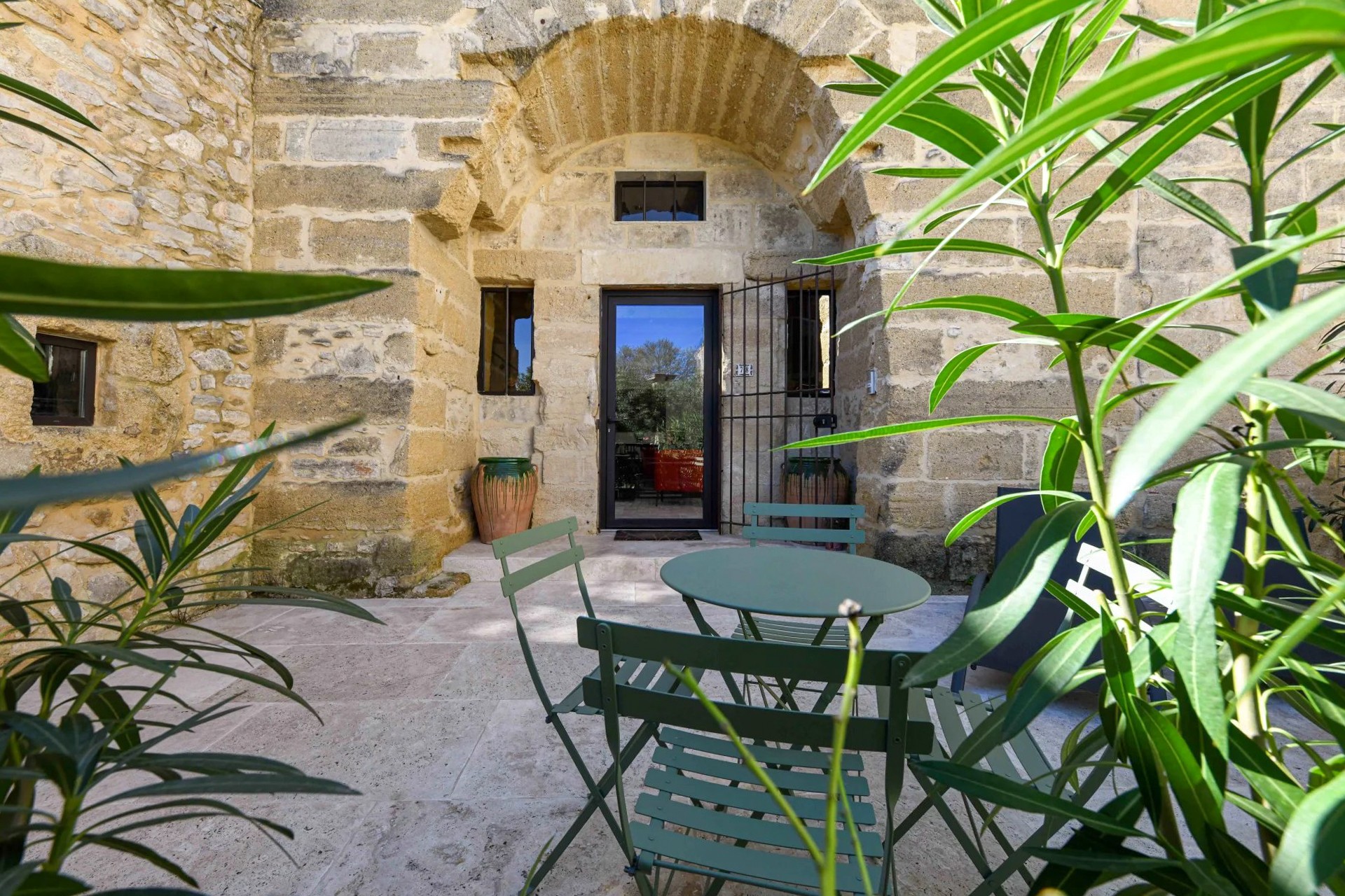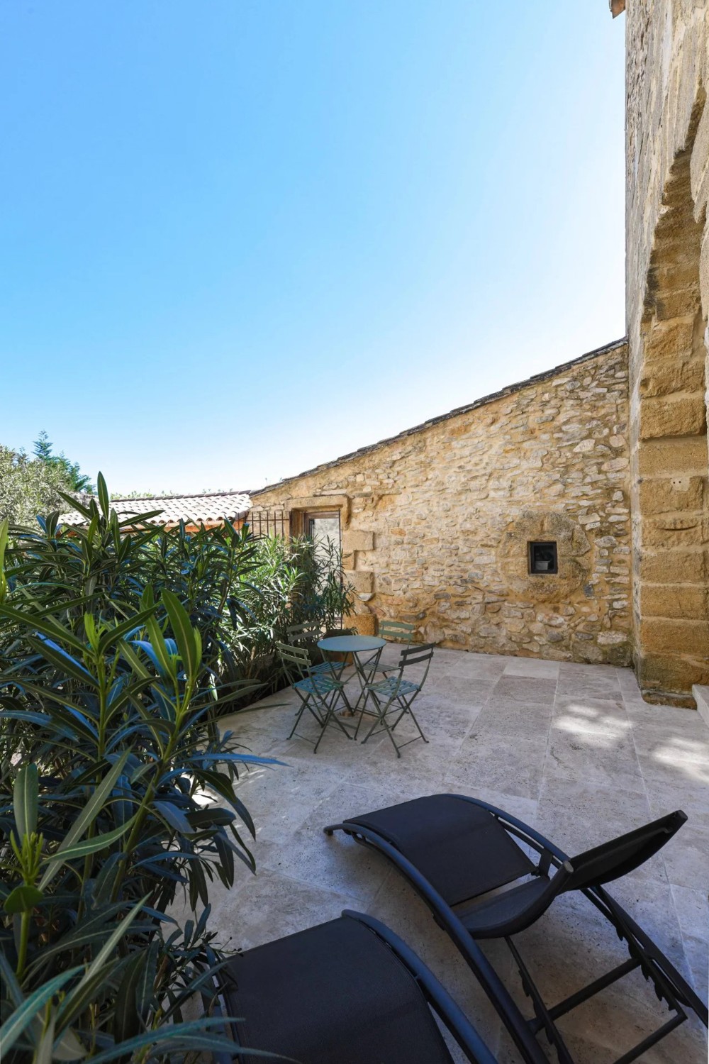 Um antigo lagar de azeite convertido em habitação, localizado a cerca de 17,5 km de Uzès. O edifício desenvolve-se em dois pisos e mantém os volumes característicos da sua arquitetura industrial original.