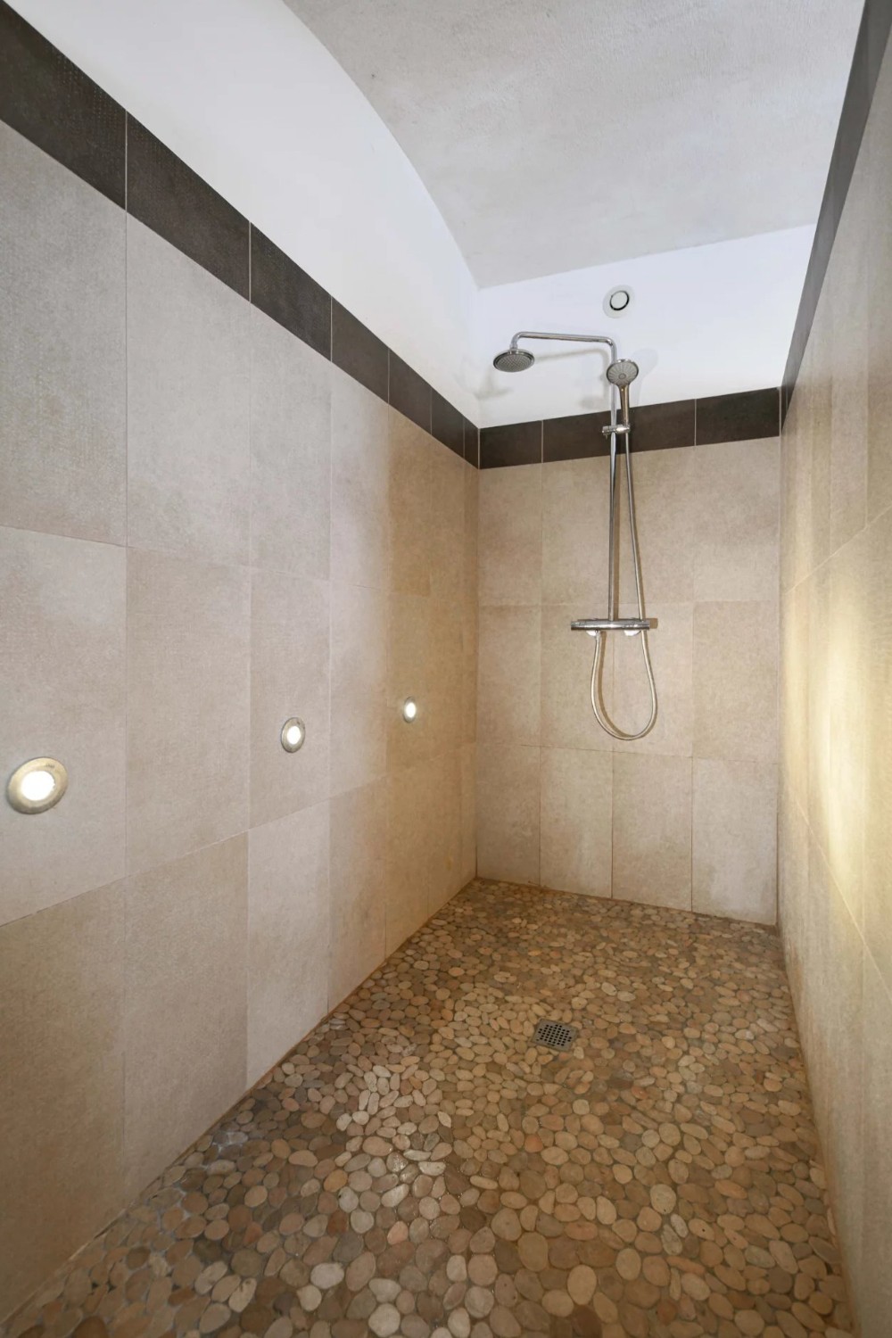 No rés-do-chão encontra-se uma área de sala de estar e jantar com pé-direito duplo, aberta para um pátio ajardinado. Neste nível há também um quarto e uma casa de banho com banheira, duche ao nível do chão e lavatório. WC de hóspedes separado.