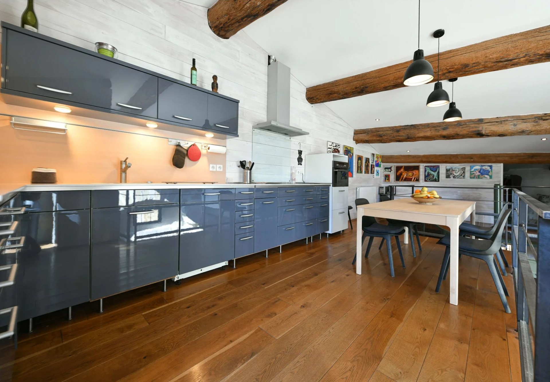 O piso superior inclui uma cozinha em plano aberto com vista para a sala, bem como um quarto com closet. Um terraço privado dá acesso a um terceiro quarto independente.