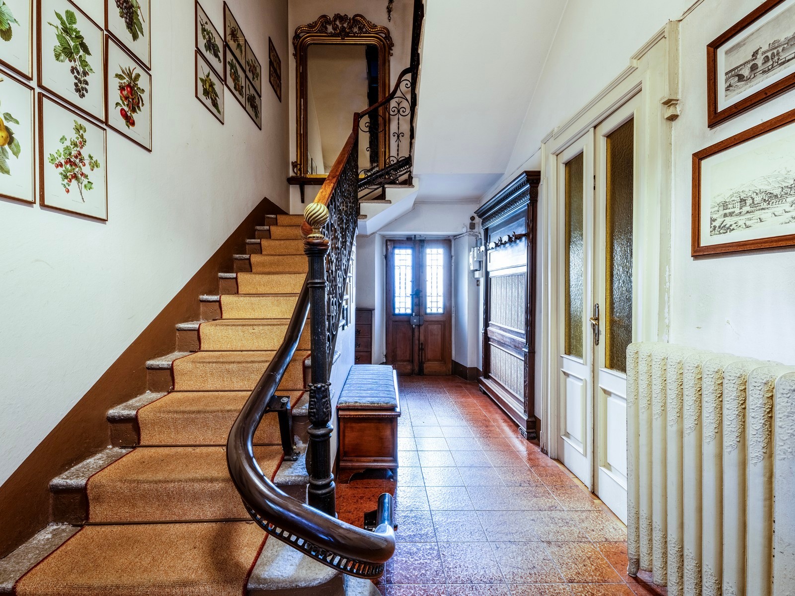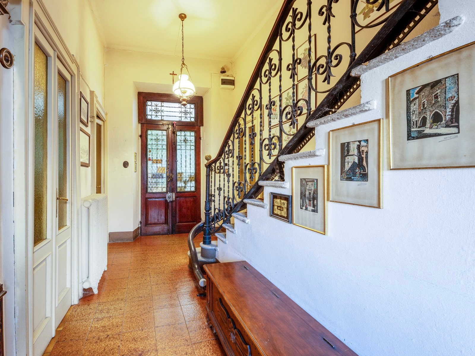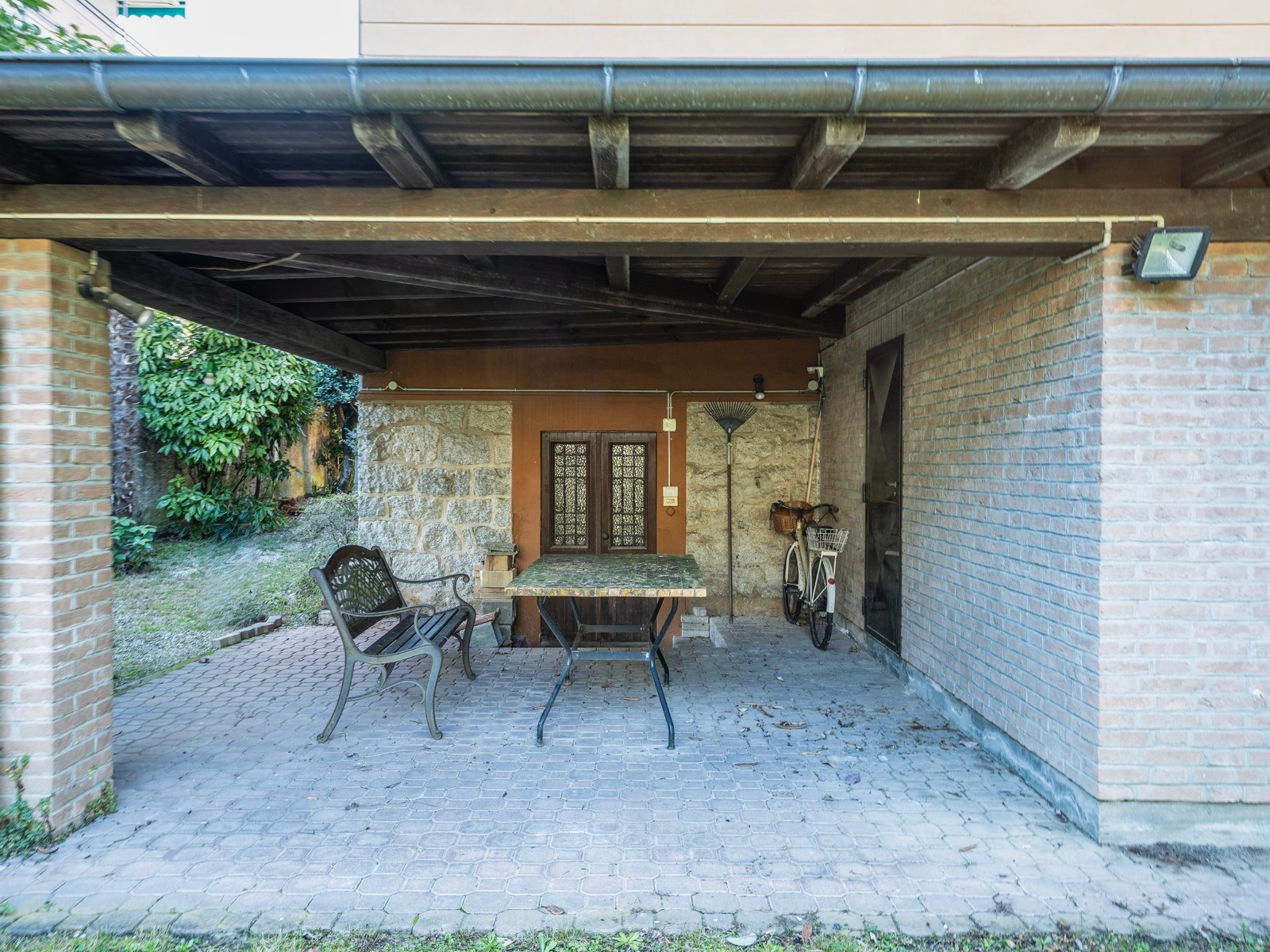 A casa conserva detalhes arquitetónicos e materiais originais, permitindo uma renovação conservadora. A entrada principal apresenta-se de forma representativa.